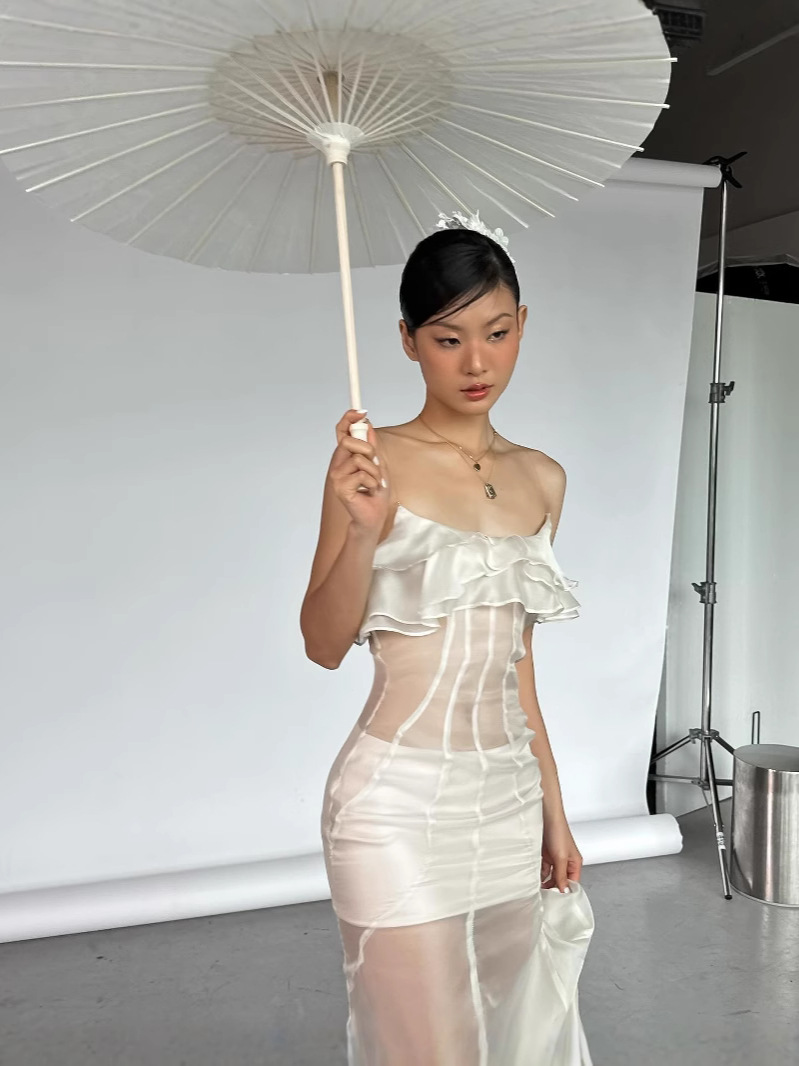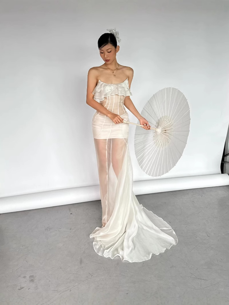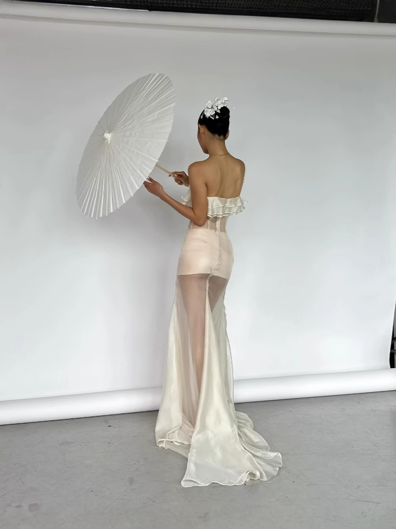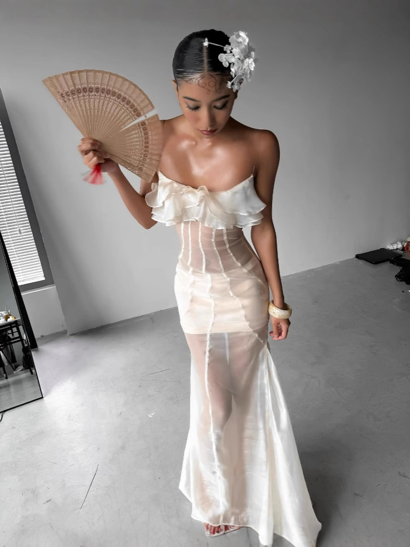 Chiếc váy dài dáng đuôi cá điểm nhấn là phần ngực áo được thiết kế dáng yếm, kết hợp diềm bèo sóng mềm mại. Chất vải lưới mỏng nhẹ tạo nên vẻ đẹp thoáng đãng, có lớp lót bên trong. Đi kèm là quần bó bên trong để mặc kết hợp. Sản phẩm phù hợp cho những buổi tiệc hay sự kiện cần phong cách nữ tính, thanh lịch. | Tên sản phẩm: Váy Đầm Liền Thân Dáng Dài Nữ Lưới Mỏng Kiểu Đuôi Cá - Thời Trang Nữ | Mã sản phẩm: B0309 - Giá: 1.420.000đ | Mã nhà sản xuất: DODN-G04Hình ảnh sản phẩm