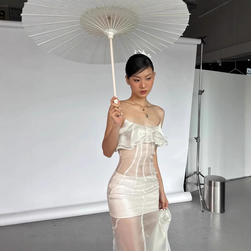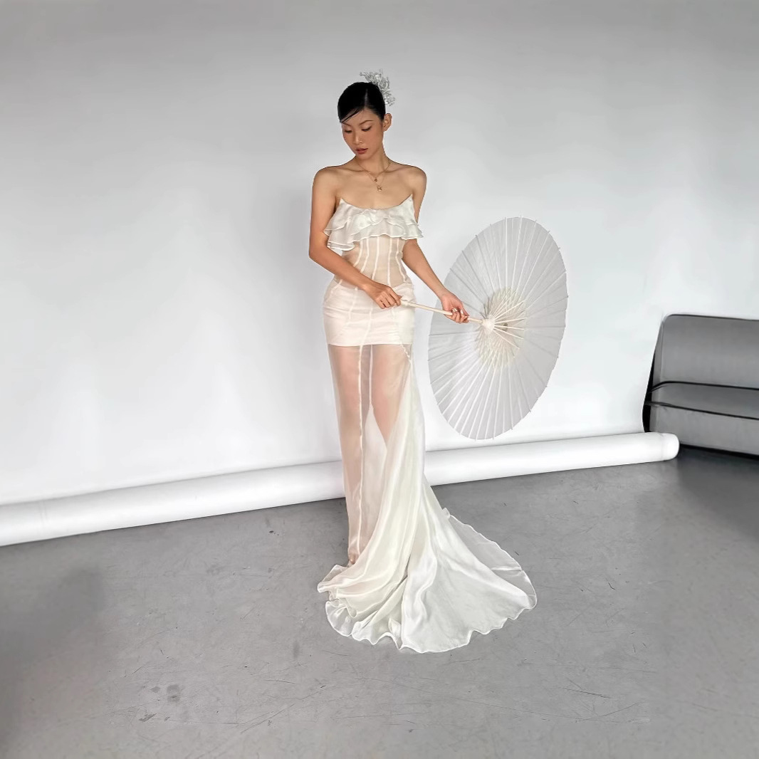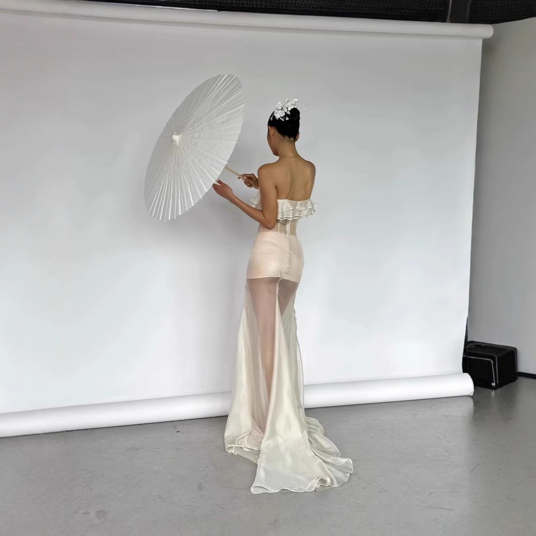Chiếc váy dài dáng đuôi cá điểm nhấn là phần ngực áo được thiết kế dáng yếm, kết hợp diềm bèo sóng mềm mại. Chất vải lưới mỏng nhẹ tạo nên vẻ đẹp thoáng đãng, có lớp lót bên trong. Đi kèm là quần bó bên trong để mặc kết hợp. Sản phẩm phù hợp cho những buổi tiệc hay sự kiện cần phong cách nữ tính, thanh lịch. | Tên sản phẩm: Váy Đầm Liền Thân Dáng Dài Nữ Lưới Mỏng Kiểu Đuôi Cá - Thời Trang Nữ | Mã sản phẩm: B0309 - Giá: 1.420.000đ | Mã nhà sản xuất: DODN-G04Hình ảnh sản phẩm