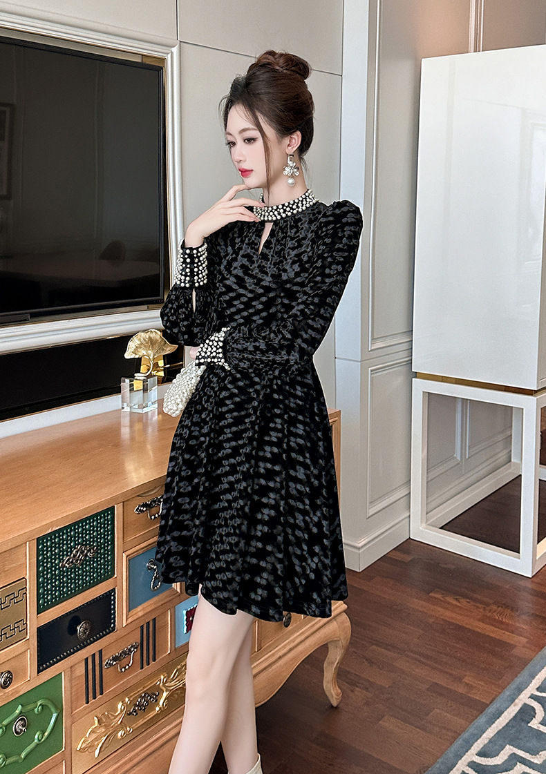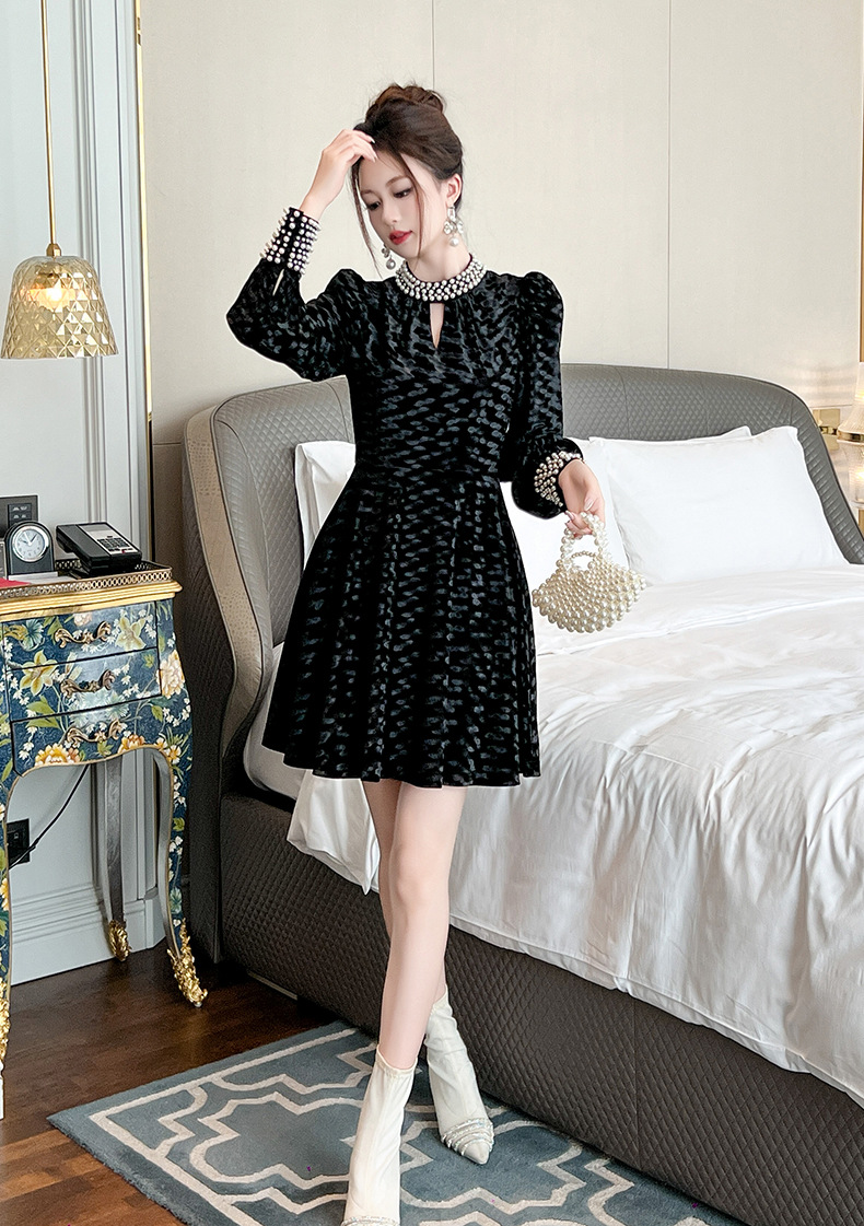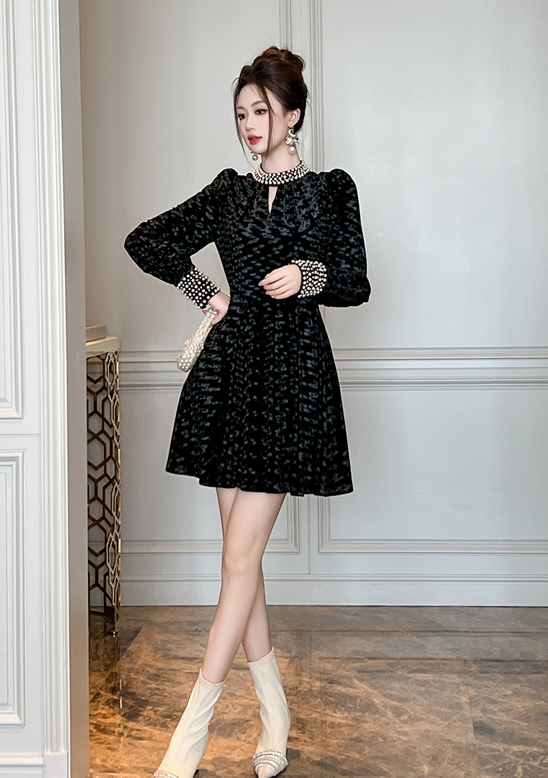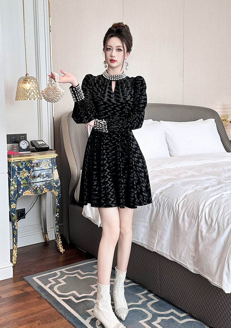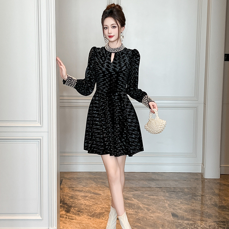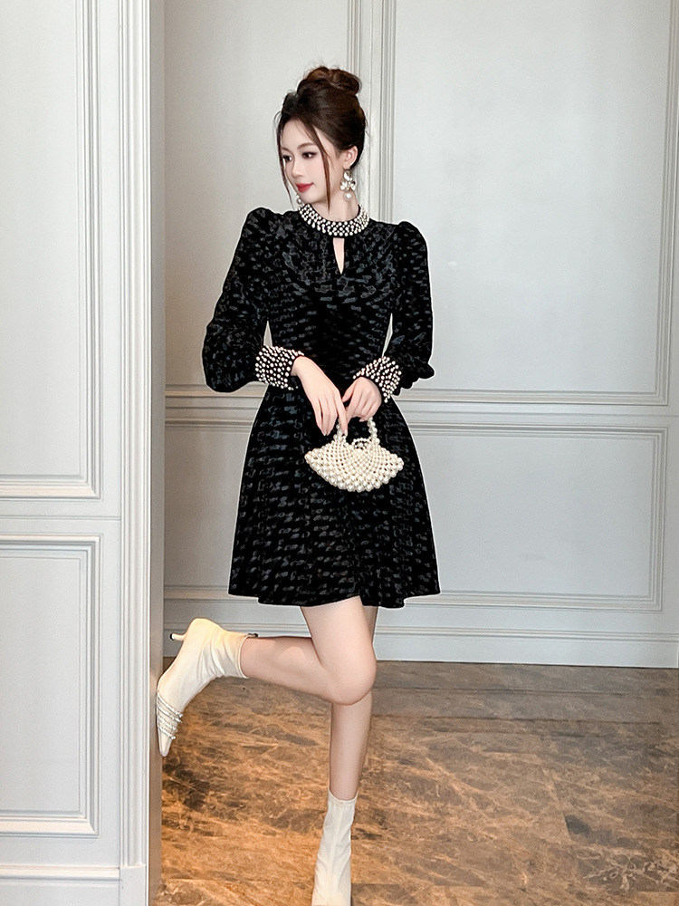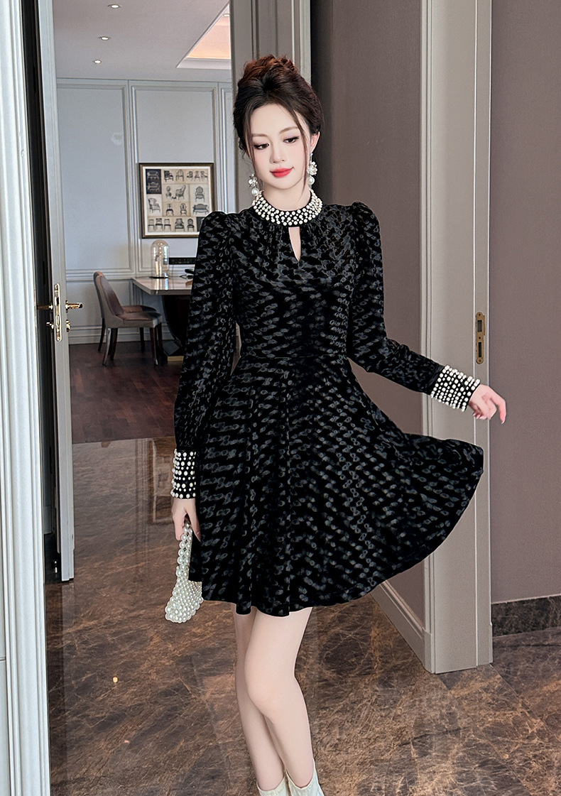 Chiếc đầm dáng dài tay mang phong cách cổ điển, được may từ chất liệu nhung mềm mại và có màu đen dễ phối đồ. Thiết kế dáng chữ A ôm vừa vặn, phần tay và thân áo thường có các đường nét trang trí tinh tế. Sản phẩm phù hợp cho thời tiết mùa thu, có thể mặc đi làm, dự tiệc hoặc trong các dịp gặp mặt. Giặt nhẹ nhàng bằng tay và phơi ở nơi râm mát để giữ dáng đẹp lâu cho váy. | Tên sản phẩm: Váy Đầm Liền Thân Nữ Dài Tay Hàng Mùa Xuân Thu Đông - Thời Trang Nữ | Mã sản phẩm: B0409 - Giá: 1.380.000đ | Mã nhà sản xuất: CHDG-G04Hình ảnh sản phẩm