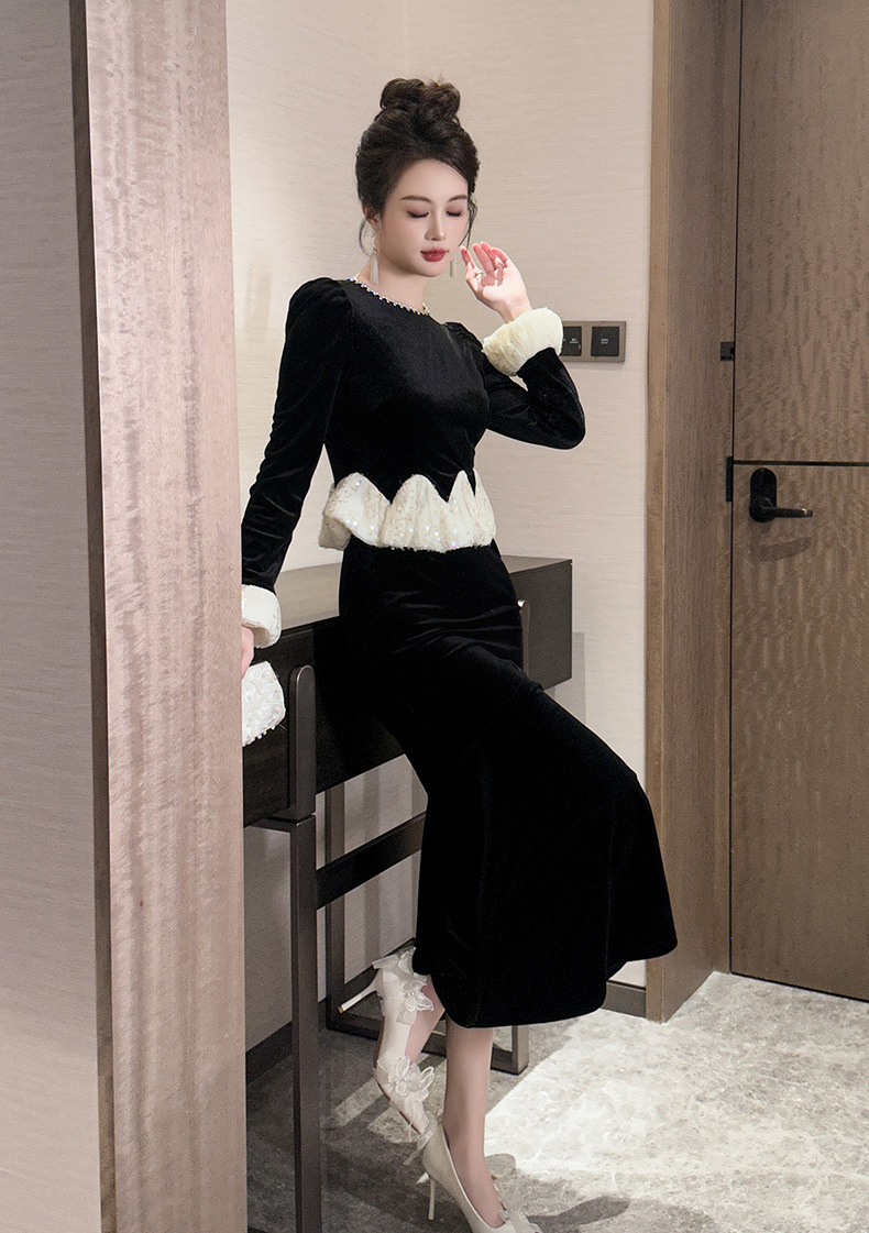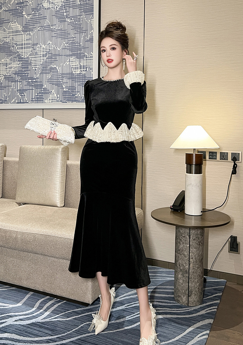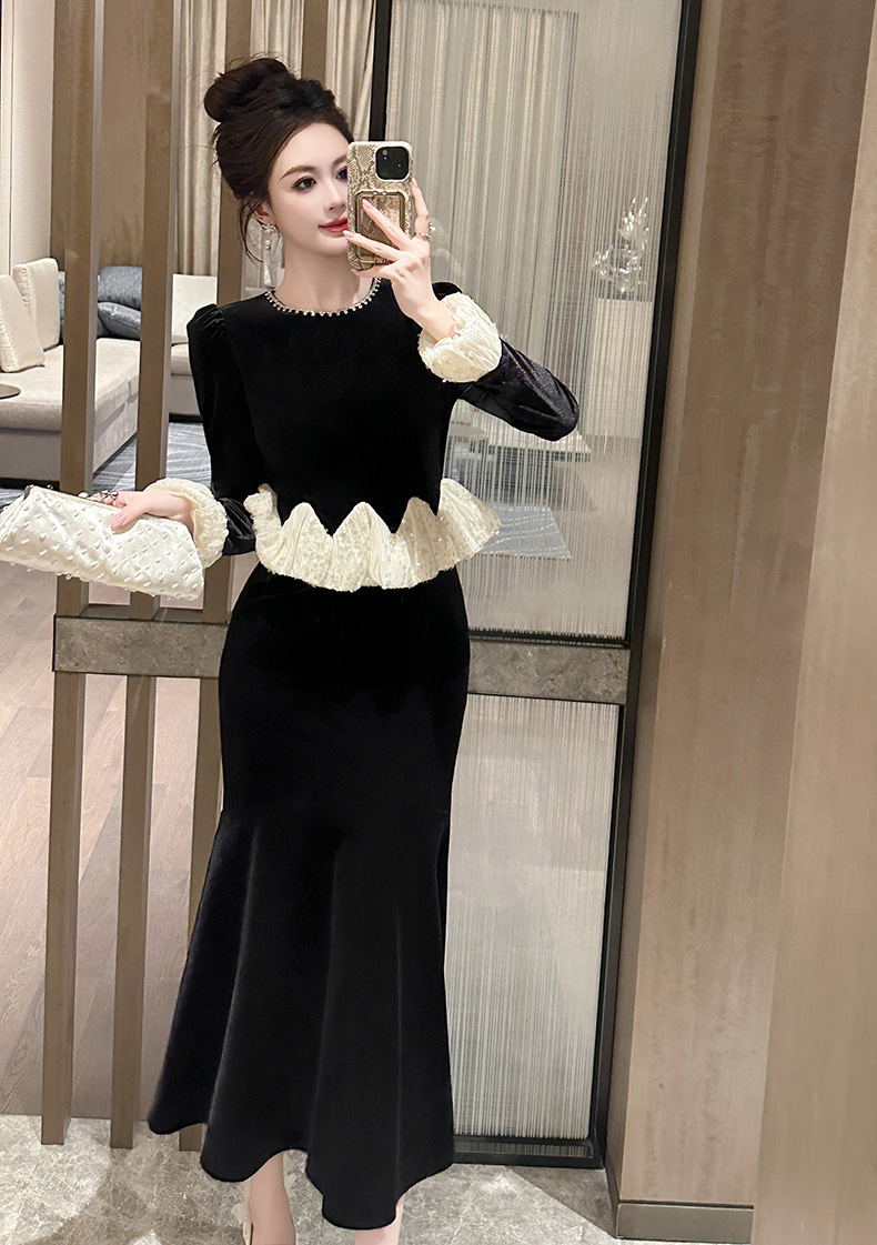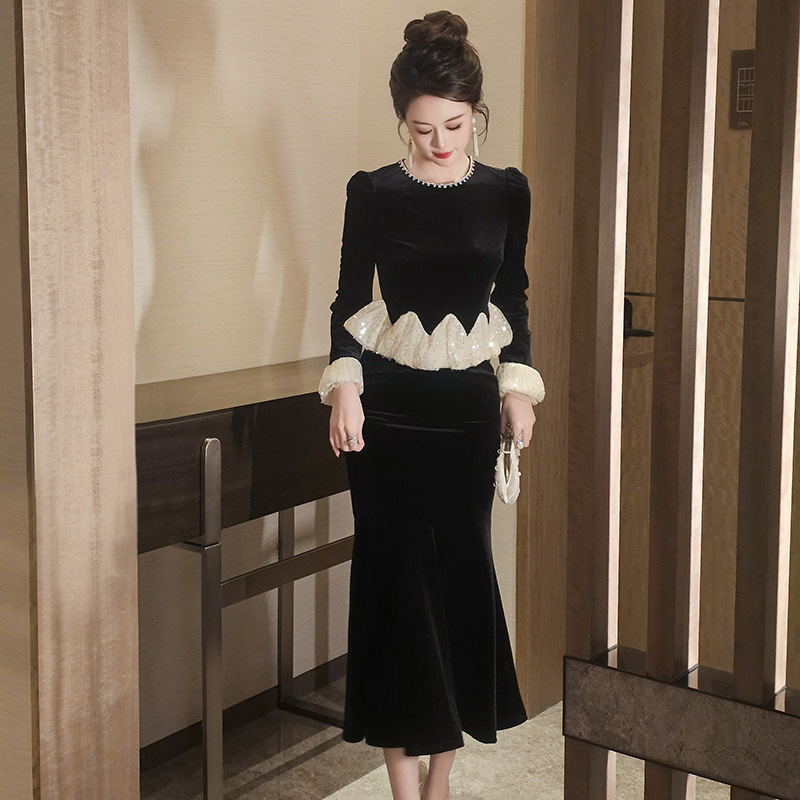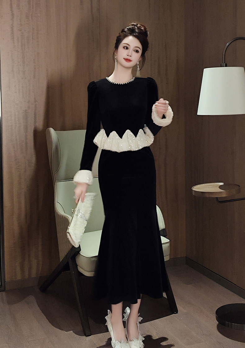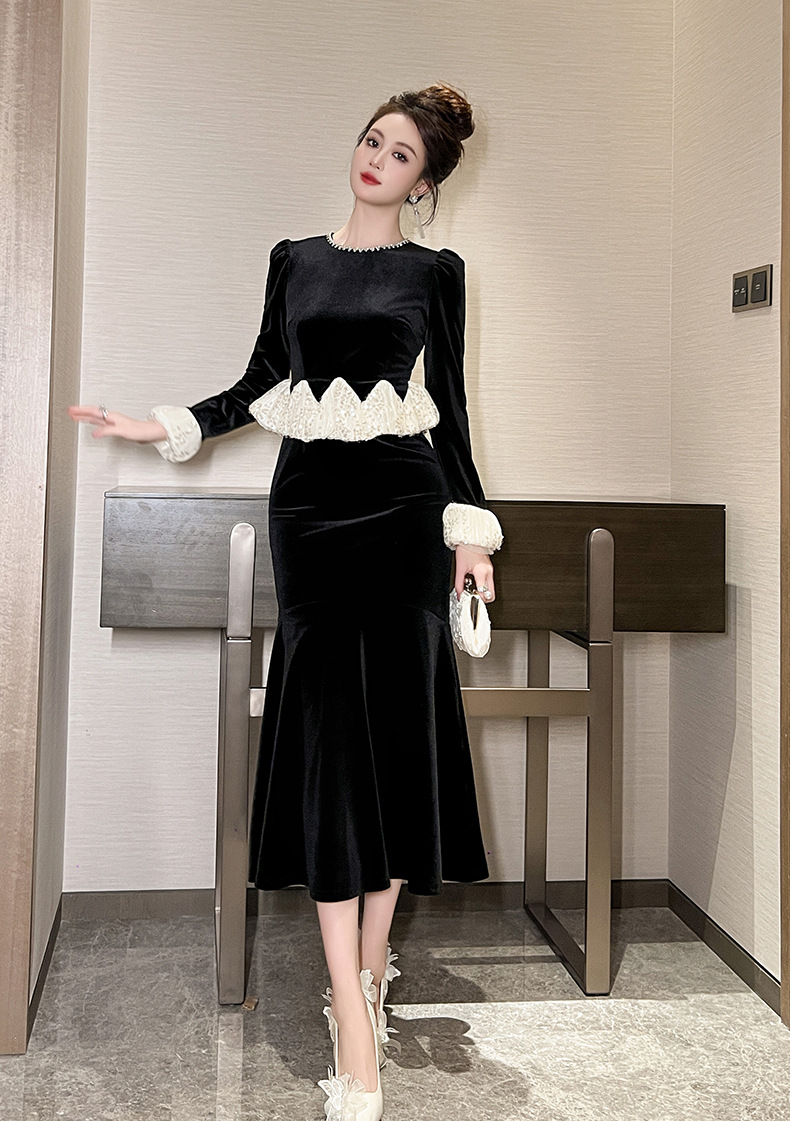 Chiếc đầm mới cho mùa thu, lấy cảm hứng từ phong cách Pháp, có điểm nhấn là đường viền tà lượn sóng mềm mại như lá sen. Thiết kế tạo dáng eo và kiểu đuôi cá duyên dáng, được làm từ chất liệu nhung mềm mại. Sản phẩm là dạng đầm hai lớp giả, giúp tôn lên vóc dáng một cách thanh lịch. Có thể mặc đi làm, dự tiệc hoặc những dịp gặp mặt, dễ dàng phối cùng giày cao gót và túi xách. | Tên sản phẩm: Váy Đầm Liền Thân Nữ Cả Bộ 2 Món Kiểu Đuôi Cá Hàng Mùa Xuân Thu Đông - Thời Trang Nữ | Mã sản phẩm: B0462 - Giá: 1.490.000đ | Mã nhà sản xuất: CHDG-G04Hình ảnh sản phẩm