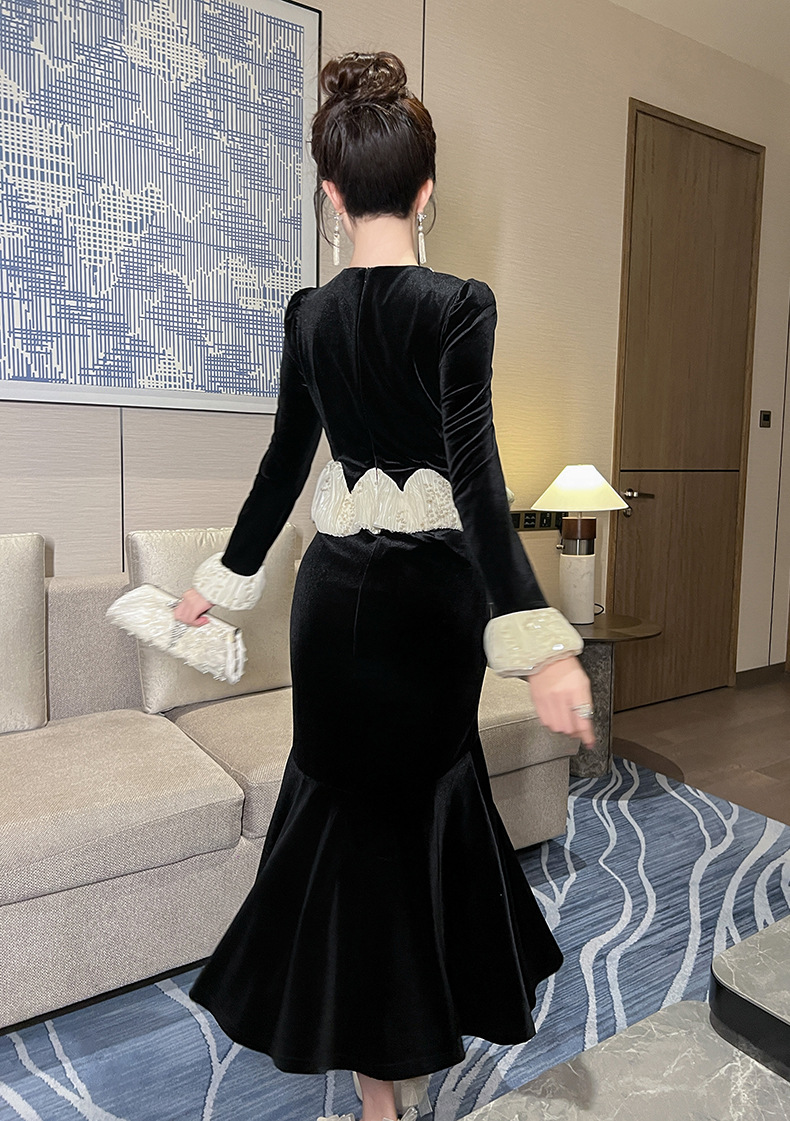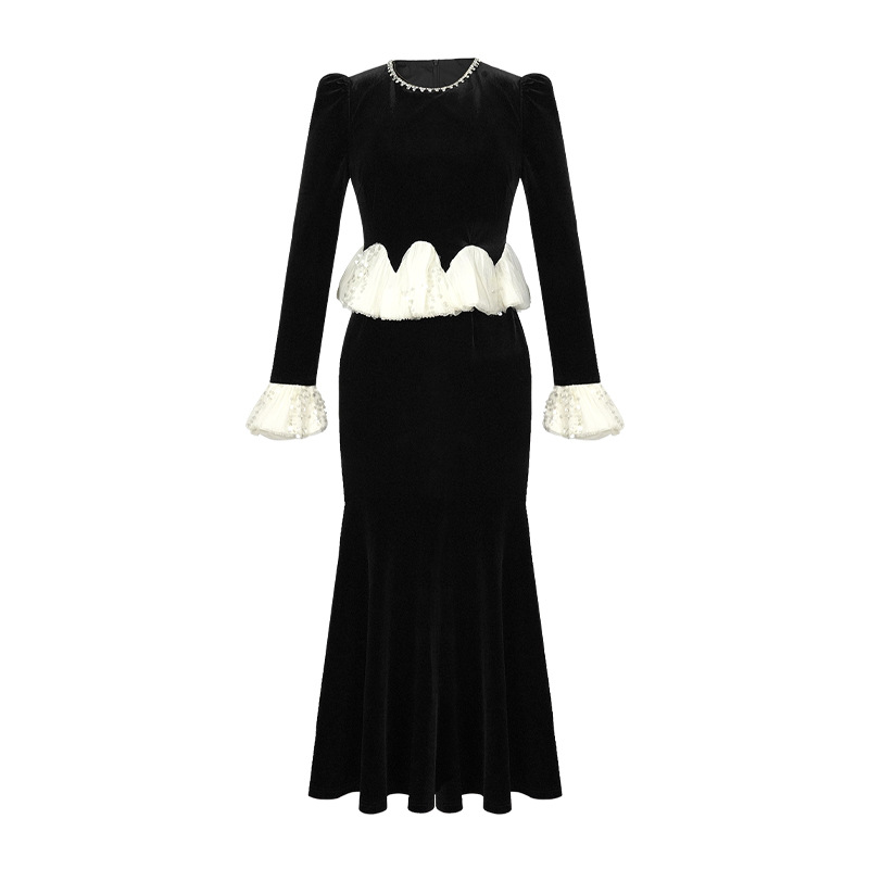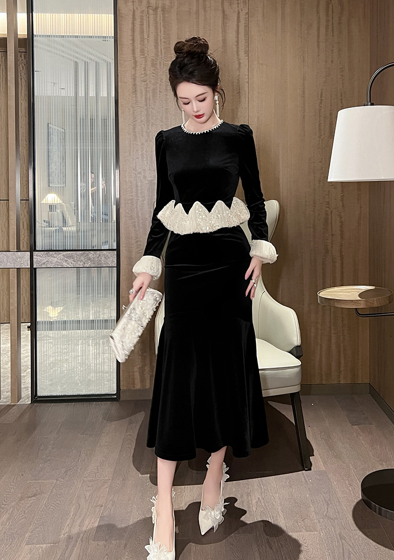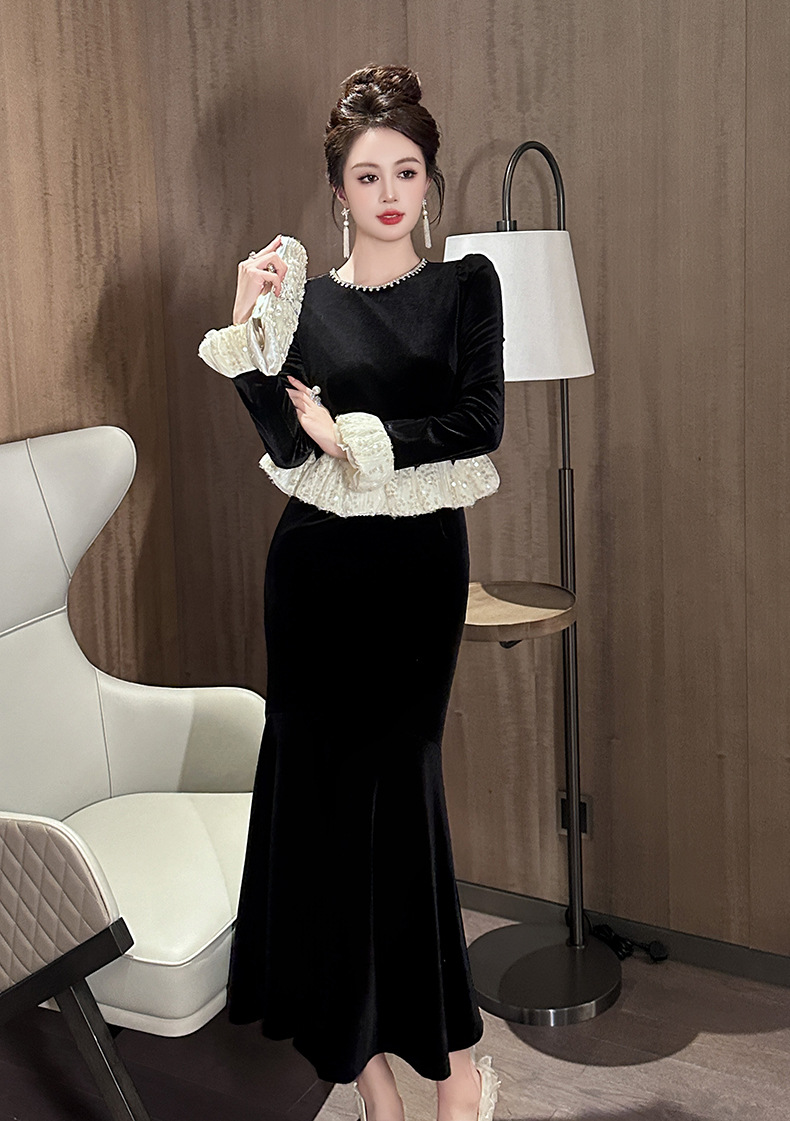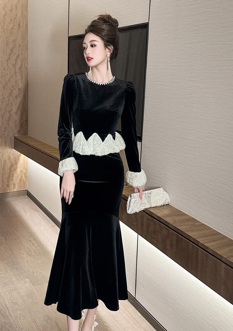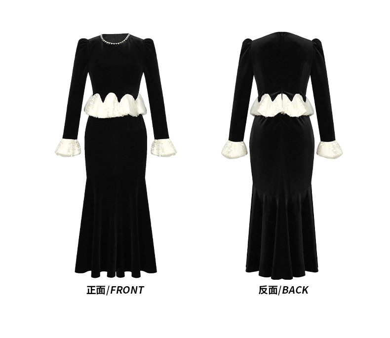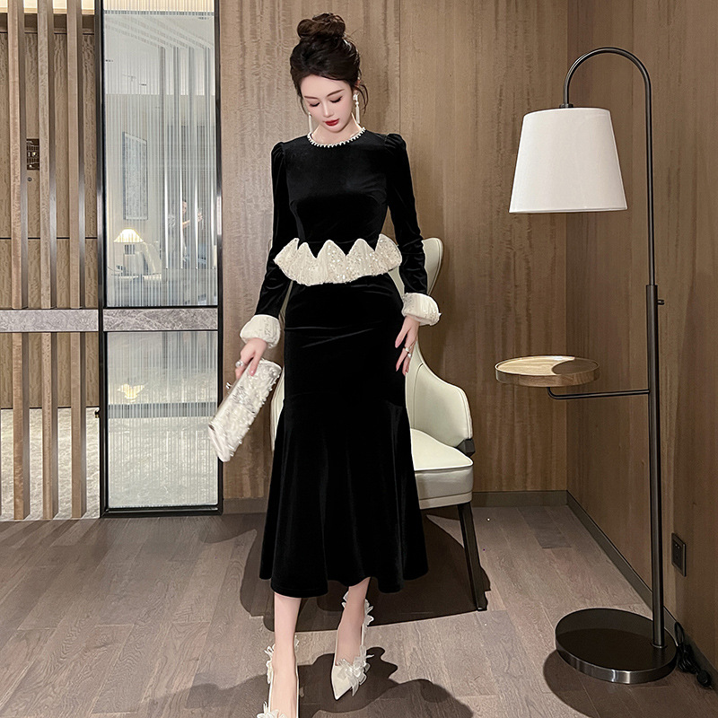 Chiếc đầm mới cho mùa thu, lấy cảm hứng từ phong cách Pháp, có điểm nhấn là đường viền tà lượn sóng mềm mại như lá sen. Thiết kế tạo dáng eo và kiểu đuôi cá duyên dáng, được làm từ chất liệu nhung mềm mại. Sản phẩm là dạng đầm hai lớp giả, giúp tôn lên vóc dáng một cách thanh lịch. Có thể mặc đi làm, dự tiệc hoặc những dịp gặp mặt, dễ dàng phối cùng giày cao gót và túi xách. | Tên sản phẩm: Váy Đầm Liền Thân Nữ Cả Bộ 2 Món Kiểu Đuôi Cá Hàng Mùa Xuân Thu Đông - Thời Trang Nữ | Mã sản phẩm: B0462 - Giá: 1.490.000đ | Mã nhà sản xuất: CHDG-G04Hình ảnh sản phẩm