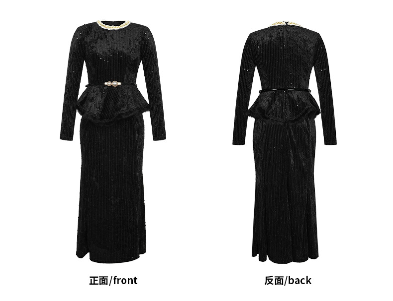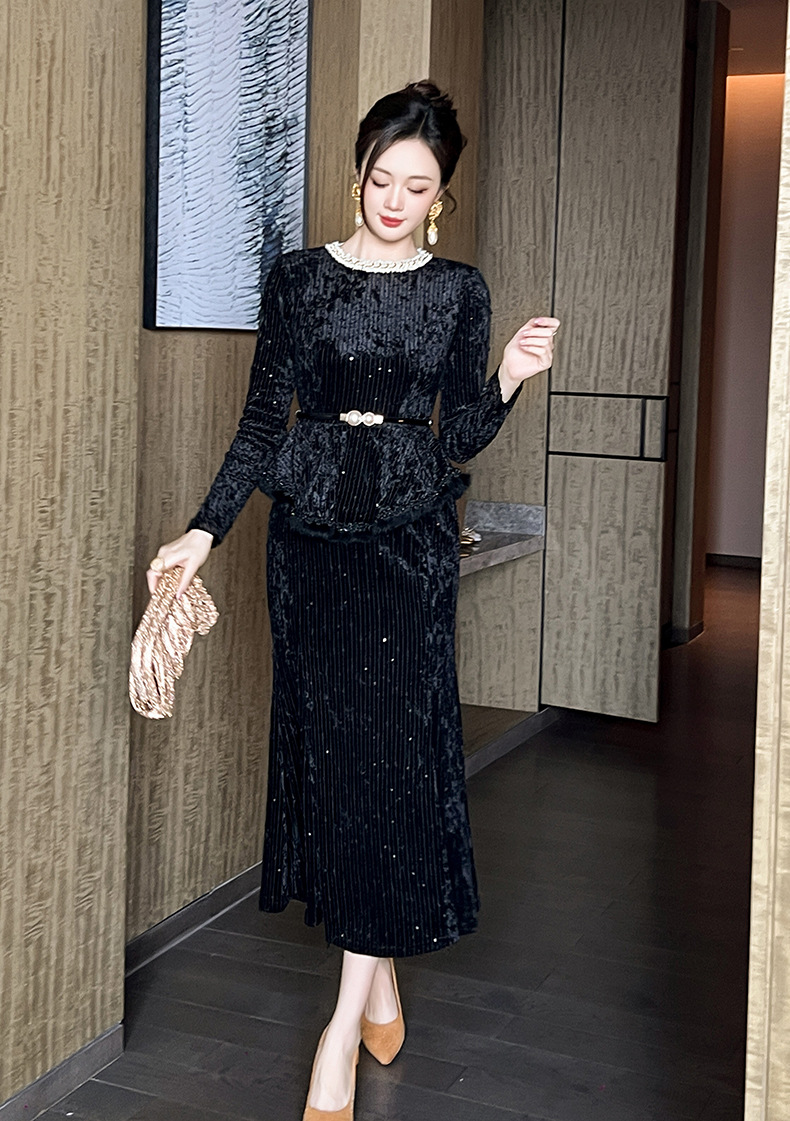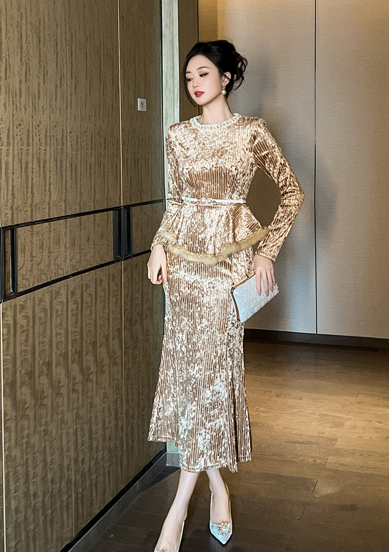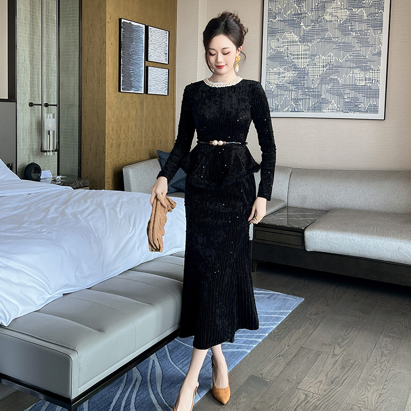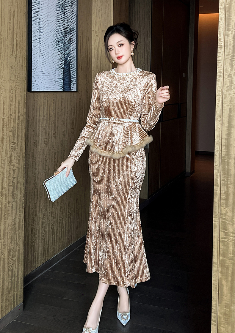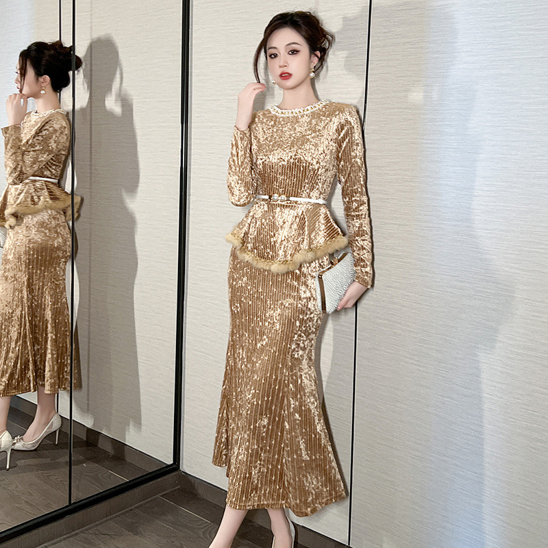 Chiếc đầm dành cho nữ, lấy ý tưởng từ phong cách thiết kế Pháp, có đường cắt ôm vừa vặn. Điểm nhấn là những đường viền tạo hình cánh sen mềm mại, tạo nên vẻ thanh thoát. Chất liệu nhung mịn màng mang đến cảm giác dễ chịu khi mặc. Kiểu dáng giả hai mảnh tinh tế, phù hợp cho những dịp đi làm hoặc dạo phố. Cách phối đồ đơn giản, dễ dàng kết hợp cùng giày cao gót hoặc giày đế bằng. | Tên sản phẩm: Váy Đầm Liền Thân Nữ Dáng Ôm Cả Bộ 2 Món Hàng Mùa Xuân Thu Đông - Thời Trang Nữ | Mã sản phẩm: B0472 - Giá: 1.520.000đ | Mã nhà sản xuất: CHDG-G04Hình ảnh sản phẩm