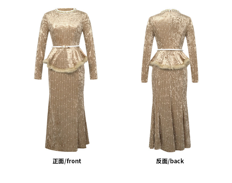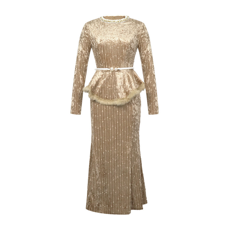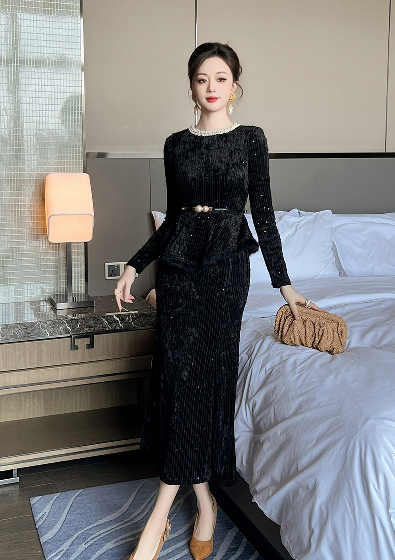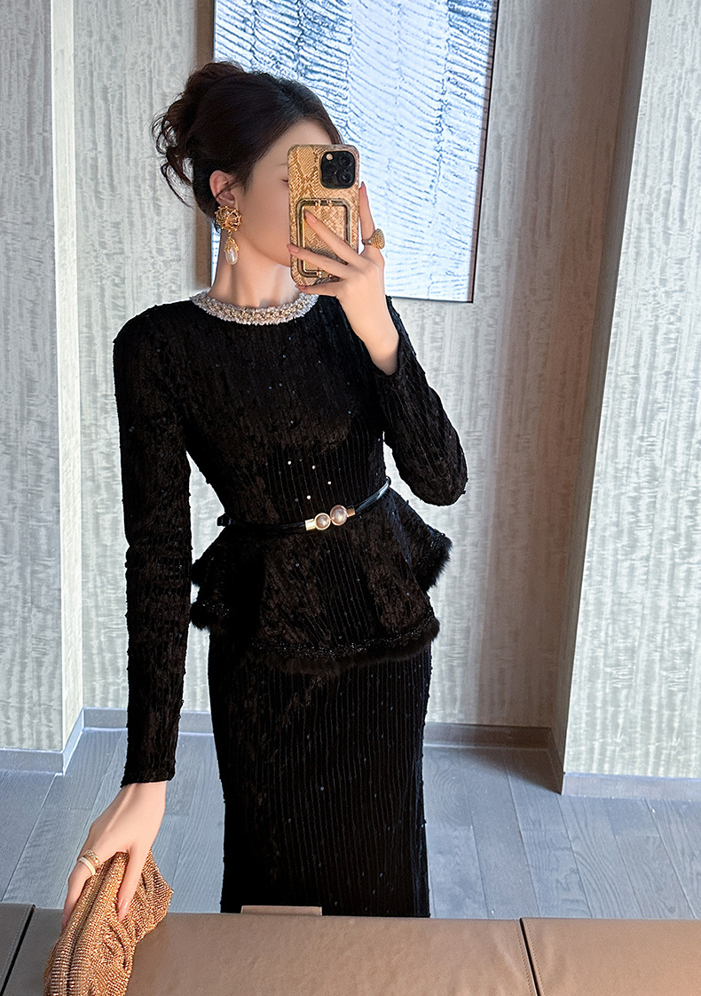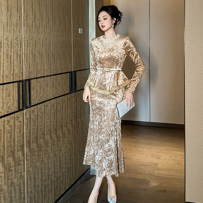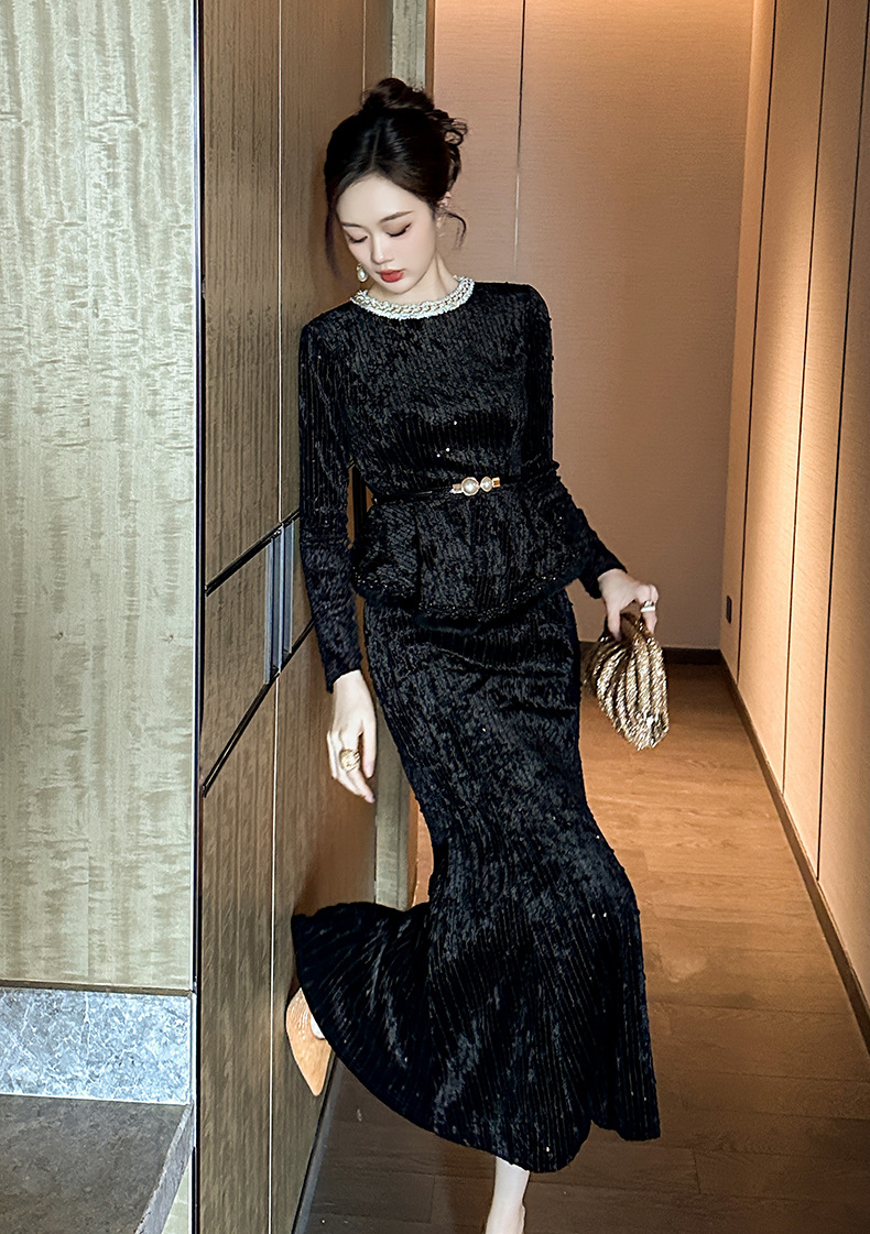 Chiếc đầm dành cho nữ, lấy ý tưởng từ phong cách thiết kế Pháp, có đường cắt ôm vừa vặn. Điểm nhấn là những đường viền tạo hình cánh sen mềm mại, tạo nên vẻ thanh thoát. Chất liệu nhung mịn màng mang đến cảm giác dễ chịu khi mặc. Kiểu dáng giả hai mảnh tinh tế, phù hợp cho những dịp đi làm hoặc dạo phố. Cách phối đồ đơn giản, dễ dàng kết hợp cùng giày cao gót hoặc giày đế bằng. | Tên sản phẩm: Váy Đầm Liền Thân Nữ Dáng Ôm Cả Bộ 2 Món Hàng Mùa Xuân Thu Đông - Thời Trang Nữ | Mã sản phẩm: B0472 - Giá: 1.520.000đ | Mã nhà sản xuất: CHDG-G04Hình ảnh sản phẩm