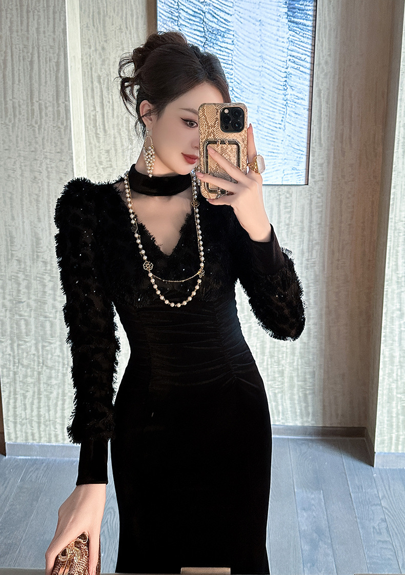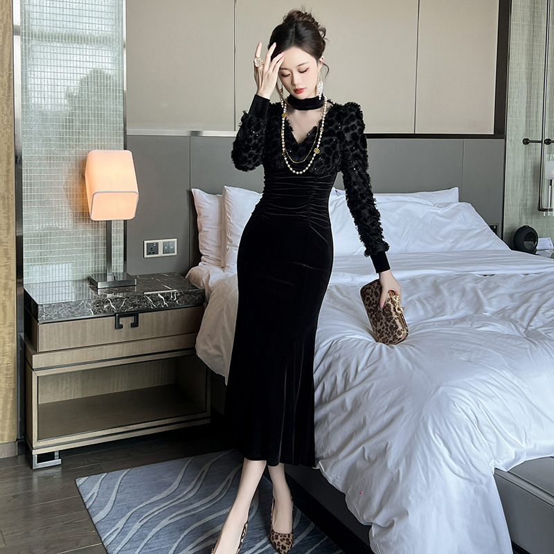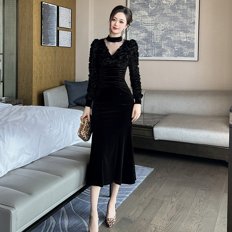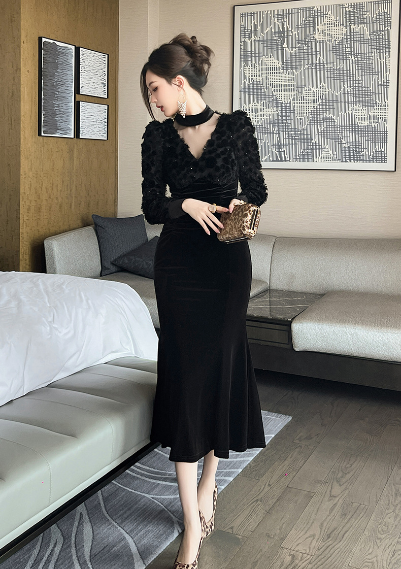 Chiếc đầm dành cho nữ với thiết kế cổ chữ V tạo điểm nhấn thanh lịch, kết hợp cùng phần tay bồng nhẹ nhàng. Dáng đầm ôm cơ thể một cách vừa vặn, thân dưới xòe nhẹ tựa như đuôi cá, giúp tôn lên những đường nét cơ thể. Chất liệu nhung mềm mại mang đến cảm giác dễ chịu khi mặc. Sản phẩm phù hợp để mặc trong nhiều dịp khác nhau, từ những buổi gặp mặt thân mật đến các sự kiện đòi hỏi sự chỉn chu. | Tên sản phẩm: Váy Đầm Liền Thân Nữ Dáng Ôm Tay Phồng Kiểu Đuôi Cá Cổ Chữ V Hàng Mùa Xuân Thu Đông - Thời Trang Nữ | Mã sản phẩm: B0502 - Giá: 1.190.000đ | Mã nhà sản xuất: CHDG-G04Hình ảnh sản phẩm
