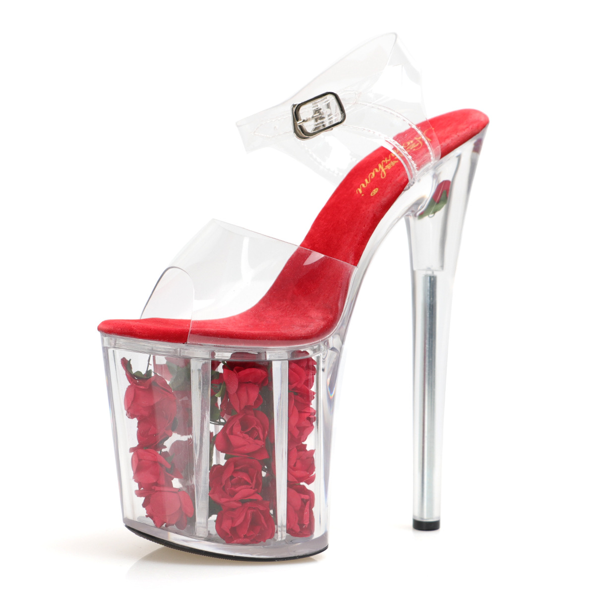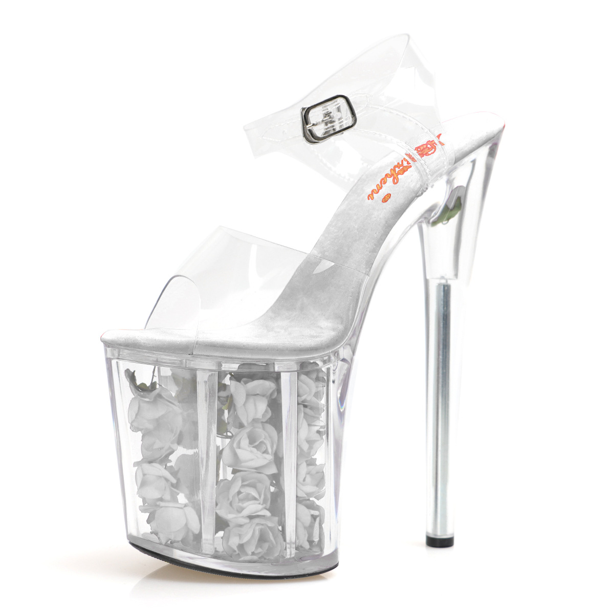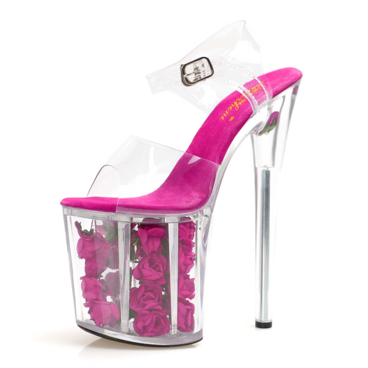 Đôi giày cao nữ tính với phần đế được làm vững chãi, giúp nâng đỡ toàn bộ đôi chân. Phần mũi giày kiểu dáng hở nhẹ tạo điểm nhấn. Chiều cao ấn tượng khoảng 20 cm, phù hợp để biểu diễn hoặc tạo phong cách thời trang cá tính. Chất liệu trong suốt kết hợp họa tiết hoa trên thân giày mang lại vẻ đẹp hiện đại. Sản phẩm có nhiều cỡ chân khác nhau. Khi sử dụng, nên đi những bước ngắn và chậm rãi để giữ thăng bằng tốt hơn. | Tên sản phẩm: Giày Cao Gót Nữ Big Size Ngoại Cỡ Cao 20cm Chống Nước Trong Suốt Miệng Cá - Giày Dép Nữ | Mã sản phẩm: B0532 - Giá: 1.780.000đ | Mã nhà sản xuất: SHDI-G05Hình ảnh sản phẩm