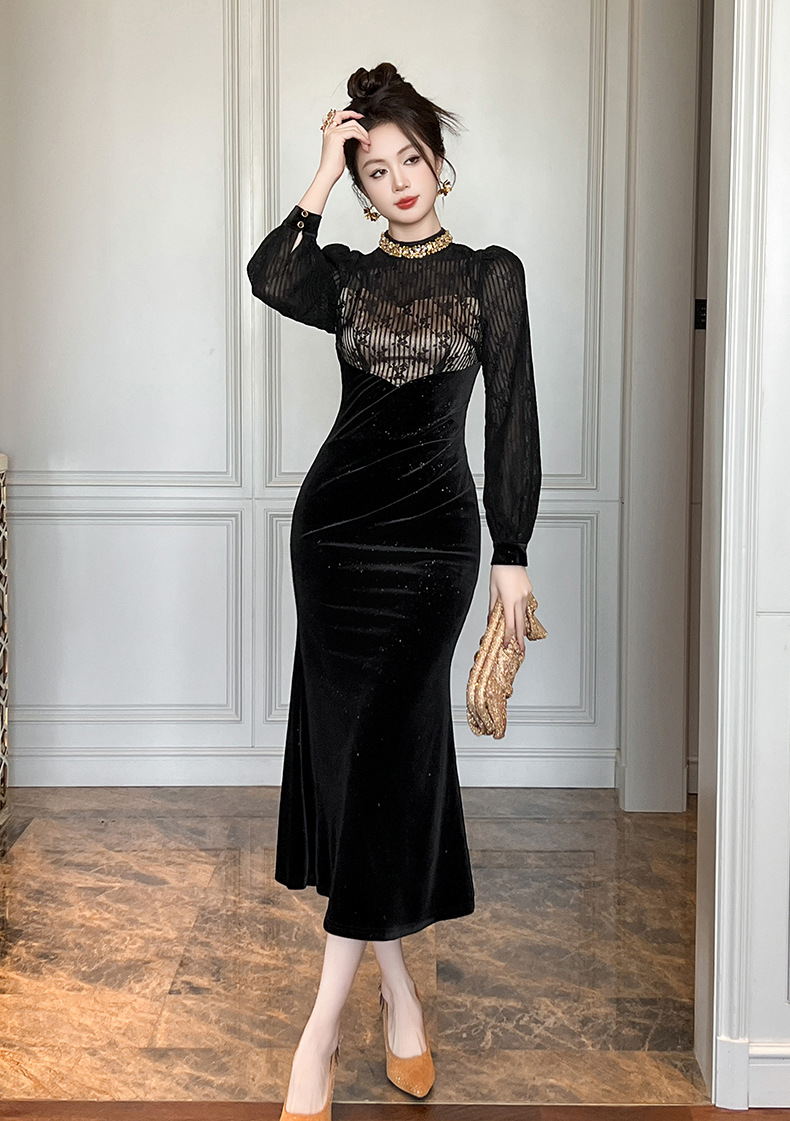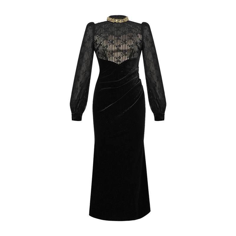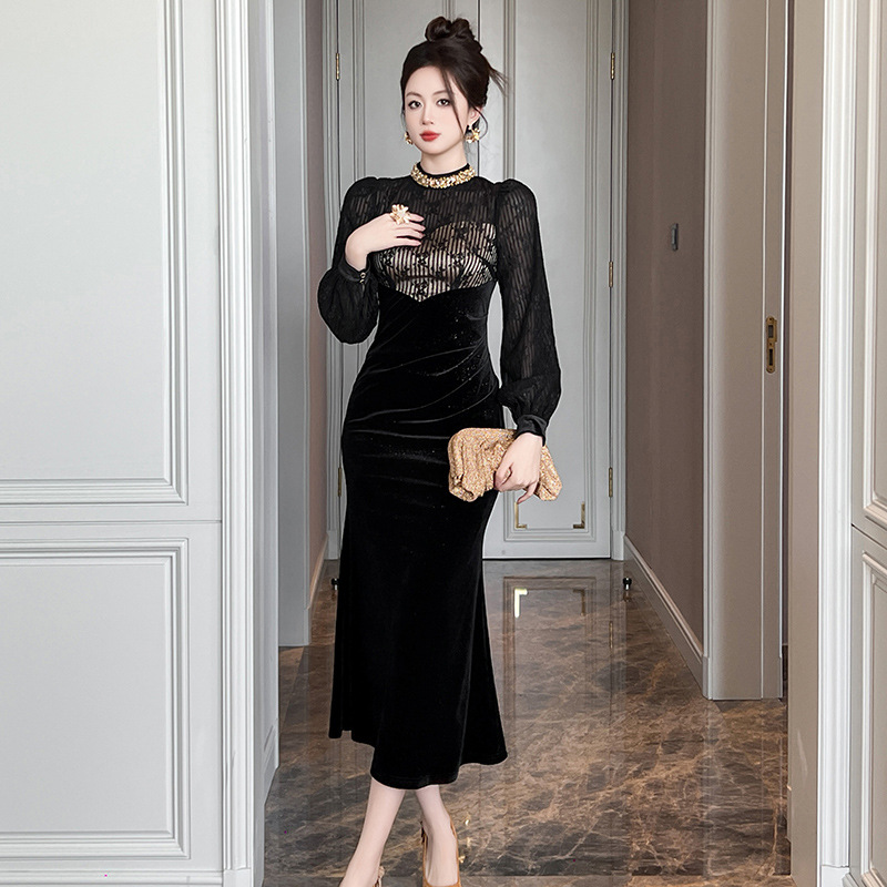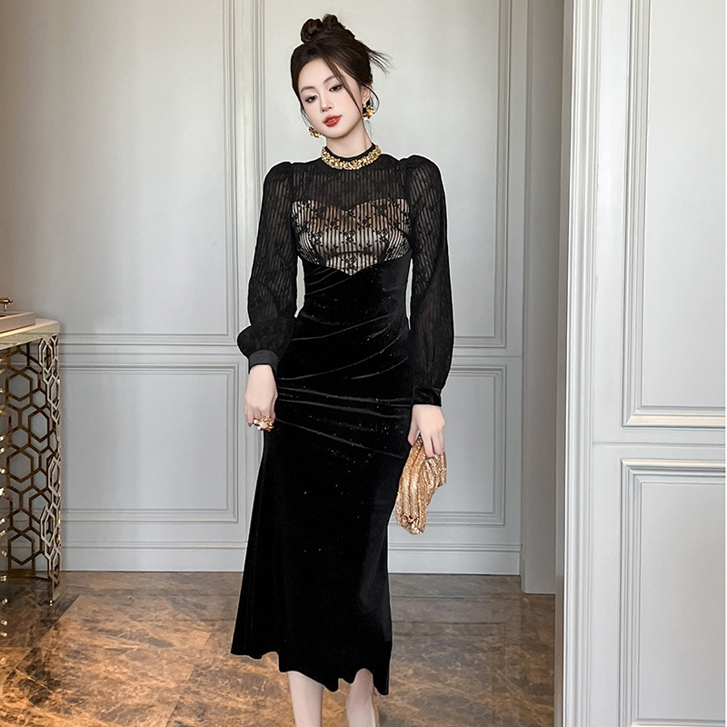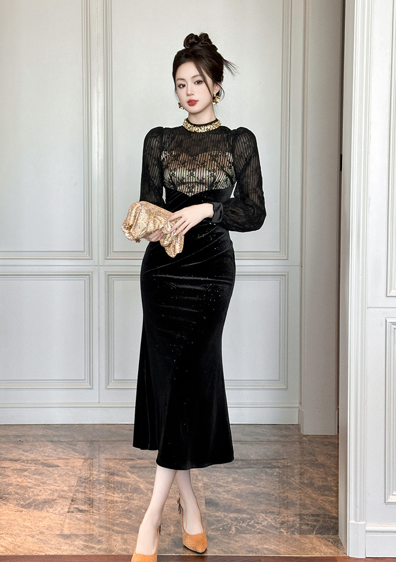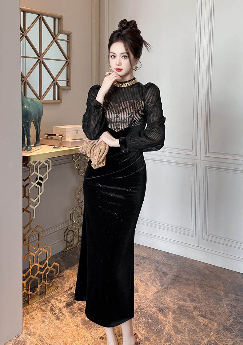 Chiếc đầm dạ hội này có chất vải mềm mại như nhung, điểm nổi bật nhờ những đường đính hạt cầu kỳ và chi tiết nối ghép tinh tế. Kiểu dáng ôm sát tôn lên đường nét cơ thể người mặc. Sản phẩm thích hợp cho các buổi tiệc tối hoặc sự kiện vào mùa thu đông. Khi sử dụng, bạn nên giặt khô hoặc giặt tay nhẹ nhàng để giữ vẻ đẹp lâu bền cho trang phục. | Tên sản phẩm: Váy Đầm Liền Thân Nữ Dáng Ôm Hàng Mùa Xuân Thu Đông - Thời Trang Nữ | Mã sản phẩm: B0545 - Giá: 1.490.000đ | Mã nhà sản xuất: CHDG-G04Hình ảnh sản phẩm