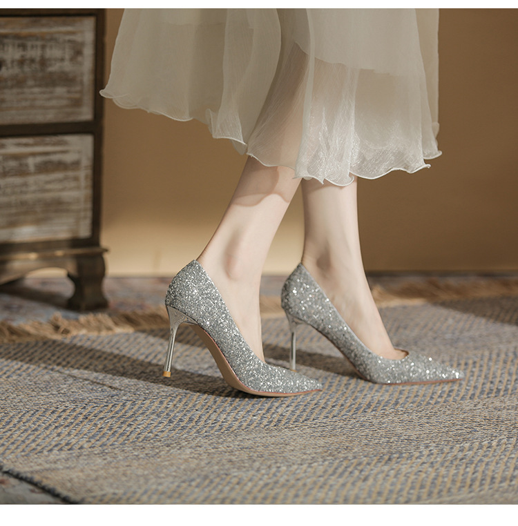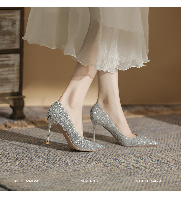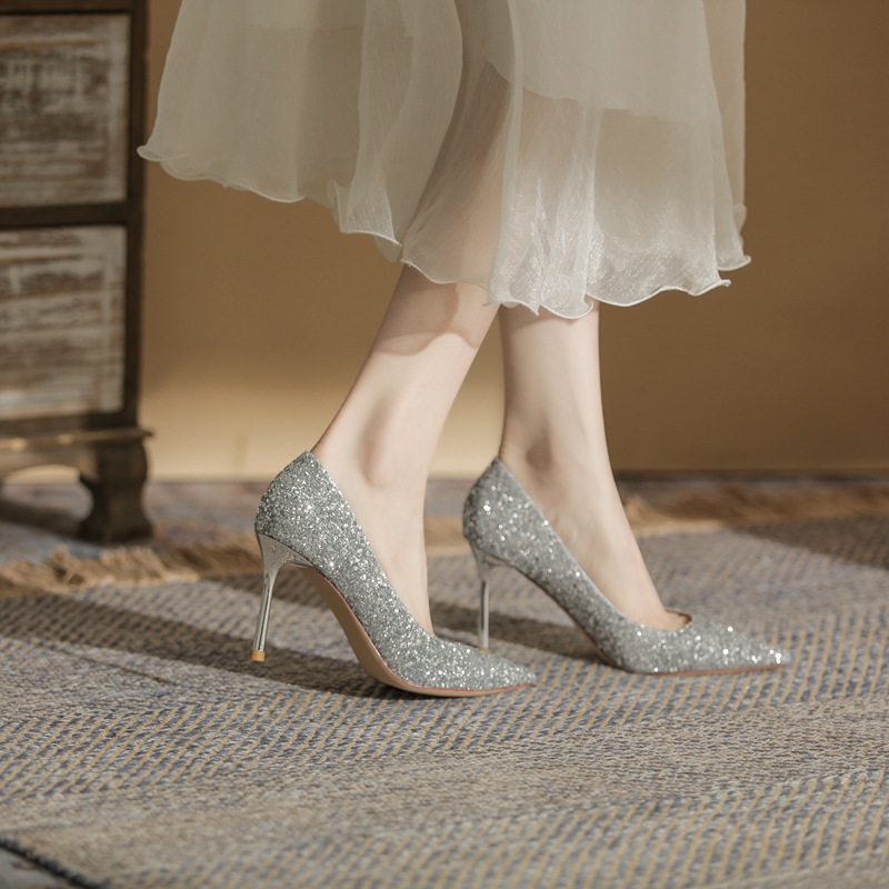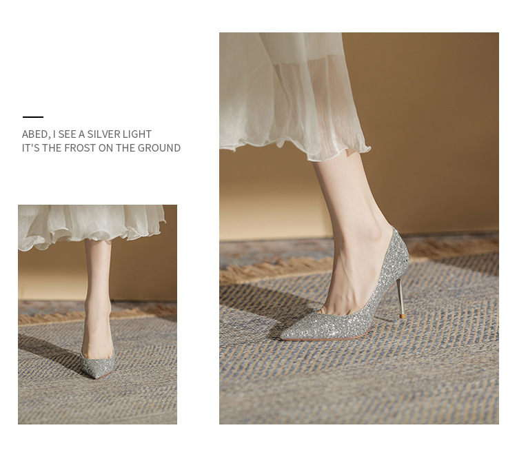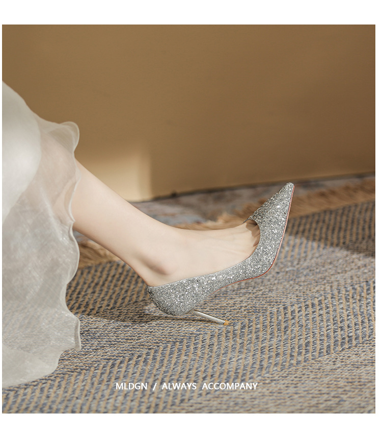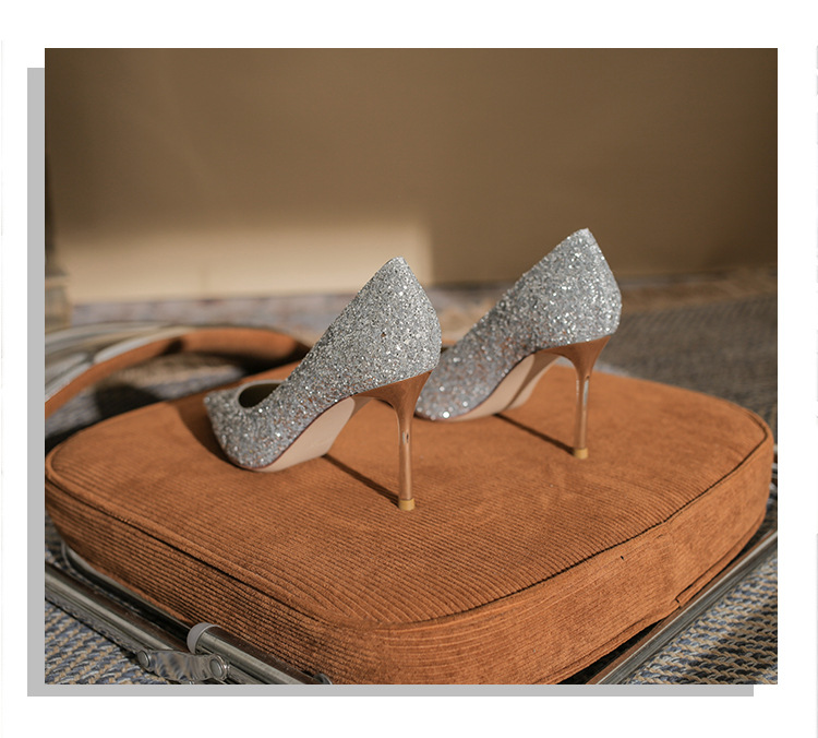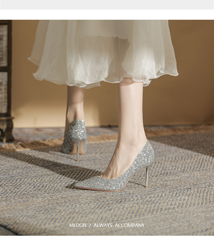 Đôi giày này có kiểu dáng mũi nhọn thanh thoát theo phong cách châu Âu. Phần thân giày được phủ lớp ánh bạc lấp lánh cùng những hạt phản quang nhỏ li ti, tạo vẻ rực rỡ. Sử dụng dễ dàng, bạn chỉ cần xỏ chân vào và cài qu gót là hoàn tất. Sản phẩm thích hợp để mang trong các buổi tiệc hoặc sự kiện, kết hợp cùng trang phục dạo phố hoặc váy liền để tạo điểm nhấn. | Tên sản phẩm: Giày Cao Gót Nữ Mũi Nhọn Gót Nhọn Hàng Mùa Xuân Thu Đông Dùng Trong Lễ Cưới - Giày Dép Nữ | Mã sản phẩm: B0578 - Giá: 670.000đ | Mã nhà sản xuất: HUDS-G02Hình ảnh sản phẩm