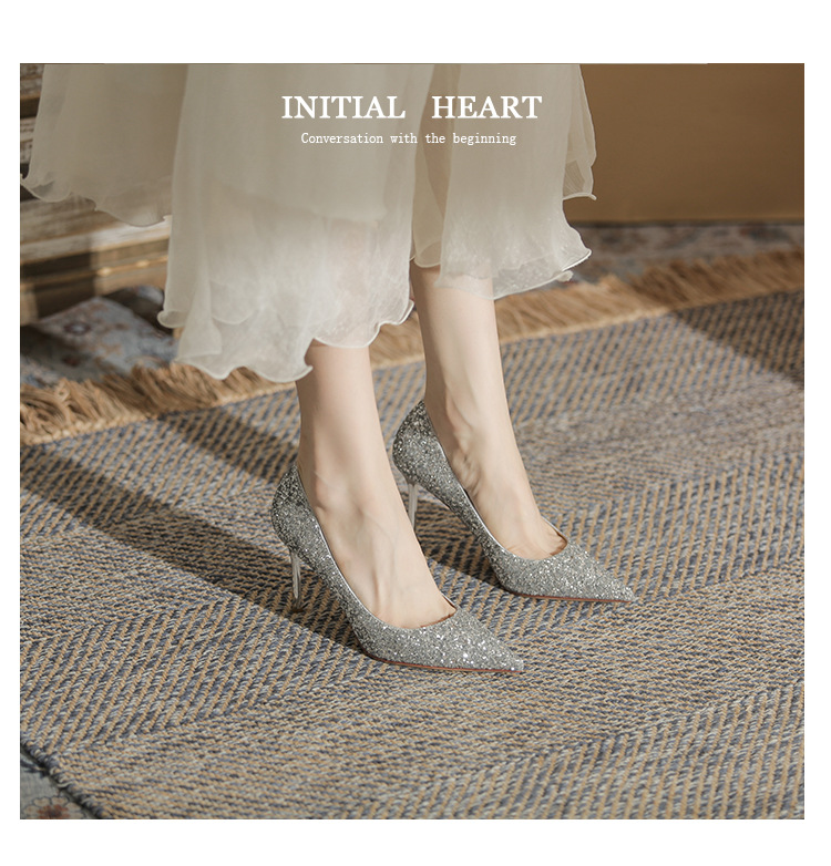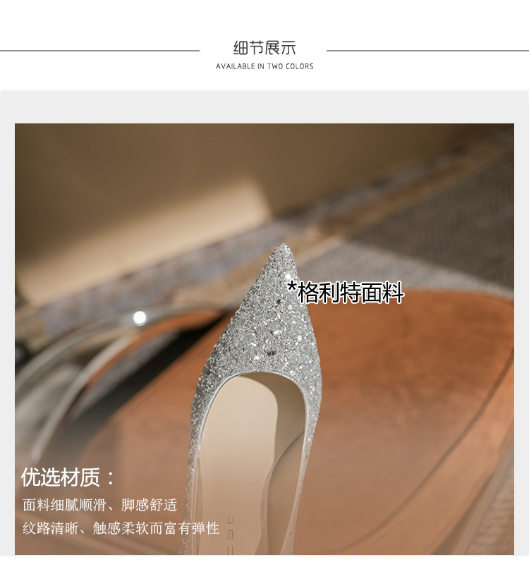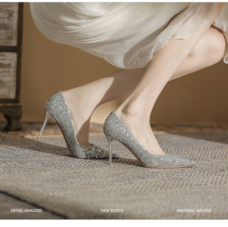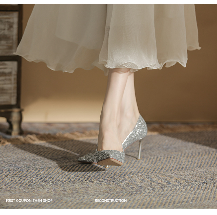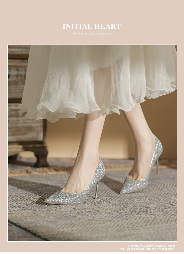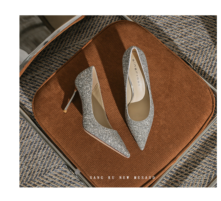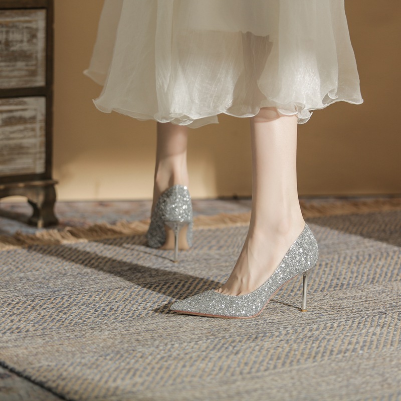 Đôi giày này có kiểu dáng mũi nhọn thanh thoát theo phong cách châu Âu. Phần thân giày được phủ lớp ánh bạc lấp lánh cùng những hạt phản quang nhỏ li ti, tạo vẻ rực rỡ. Sử dụng dễ dàng, bạn chỉ cần xỏ chân vào và cài qu gót là hoàn tất. Sản phẩm thích hợp để mang trong các buổi tiệc hoặc sự kiện, kết hợp cùng trang phục dạo phố hoặc váy liền để tạo điểm nhấn. | Tên sản phẩm: Giày Cao Gót Nữ Mũi Nhọn Gót Nhọn Hàng Mùa Xuân Thu Đông Dùng Trong Lễ Cưới - Giày Dép Nữ | Mã sản phẩm: B0578 - Giá: 670.000đ | Mã nhà sản xuất: HUDS-G02Hình ảnh sản phẩm