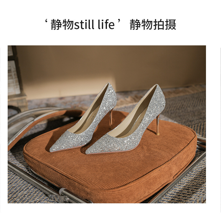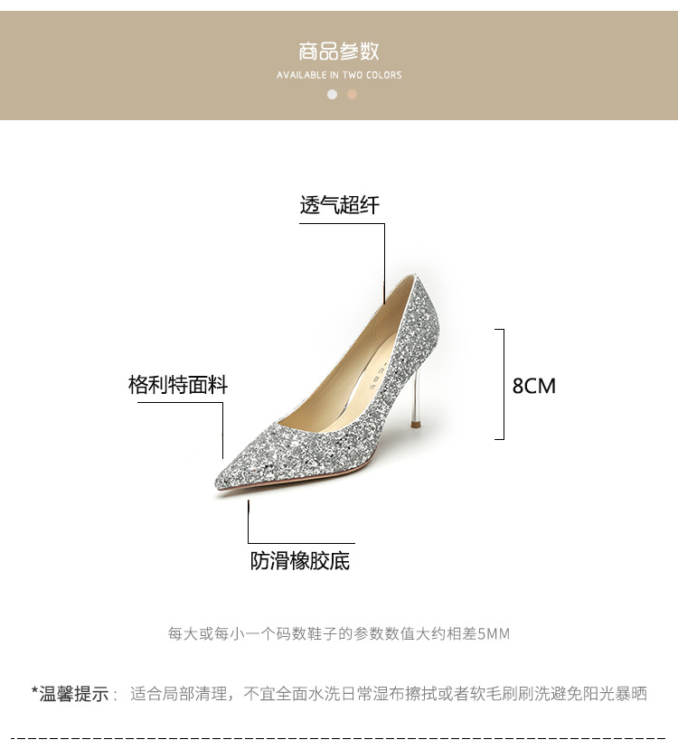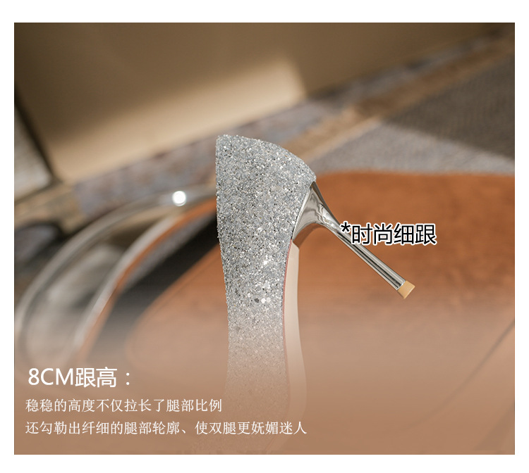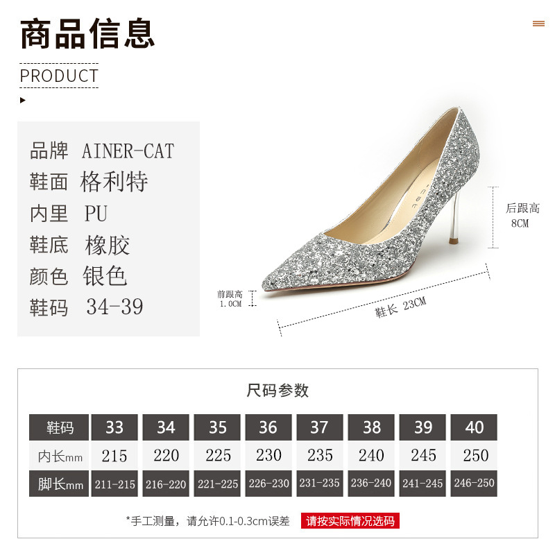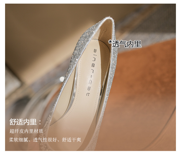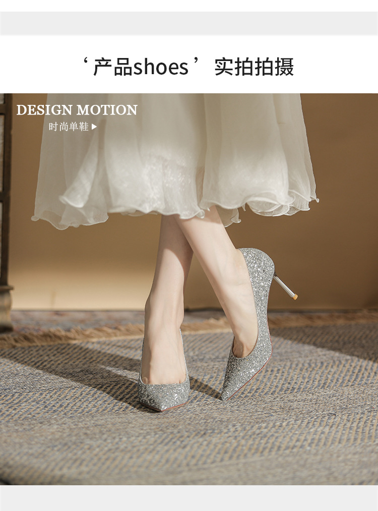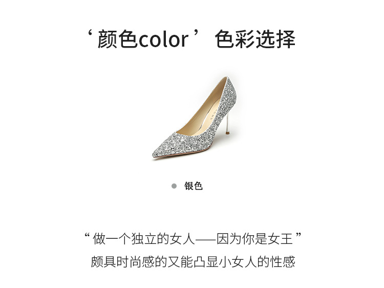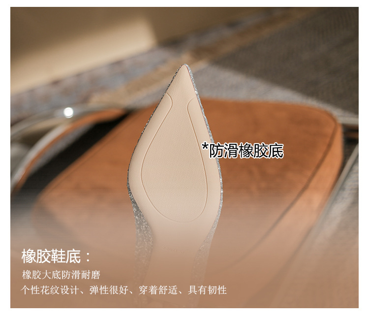 Đôi giày này có kiểu dáng mũi nhọn thanh thoát theo phong cách châu Âu. Phần thân giày được phủ lớp ánh bạc lấp lánh cùng những hạt phản quang nhỏ li ti, tạo vẻ rực rỡ. Sử dụng dễ dàng, bạn chỉ cần xỏ chân vào và cài qu gót là hoàn tất. Sản phẩm thích hợp để mang trong các buổi tiệc hoặc sự kiện, kết hợp cùng trang phục dạo phố hoặc váy liền để tạo điểm nhấn. | Tên sản phẩm: Giày Cao Gót Nữ Mũi Nhọn Gót Nhọn Hàng Mùa Xuân Thu Đông Dùng Trong Lễ Cưới - Giày Dép Nữ | Mã sản phẩm: B0578 - Giá: 670.000đ | Mã nhà sản xuất: HUDS-G02Hình ảnh sản phẩm