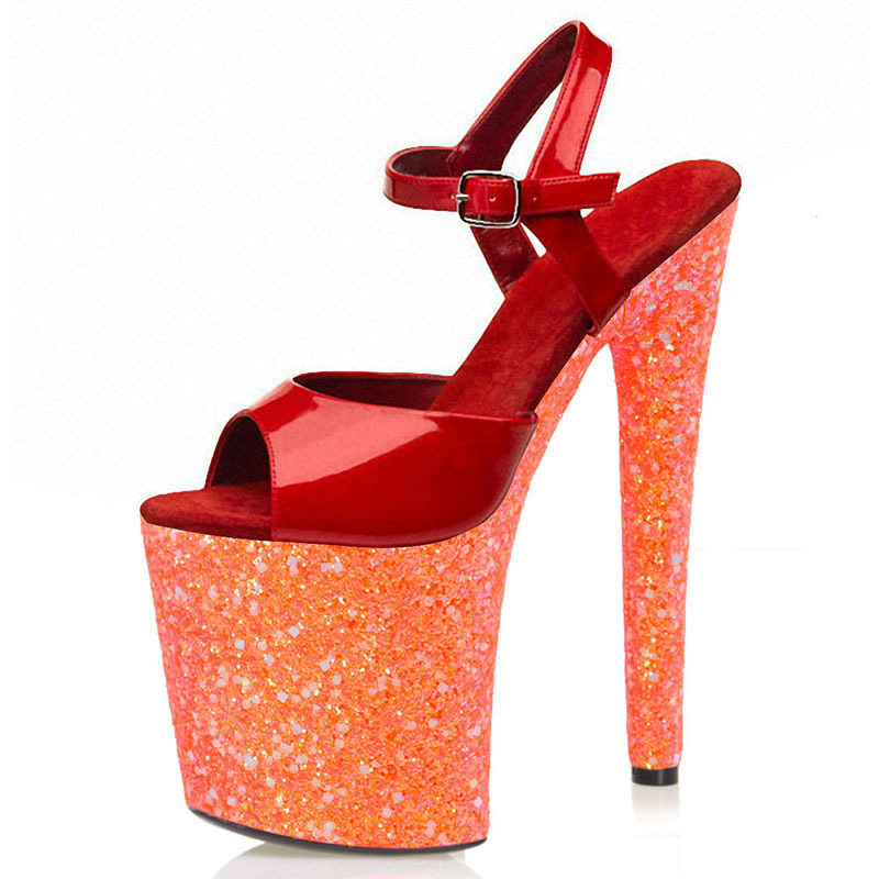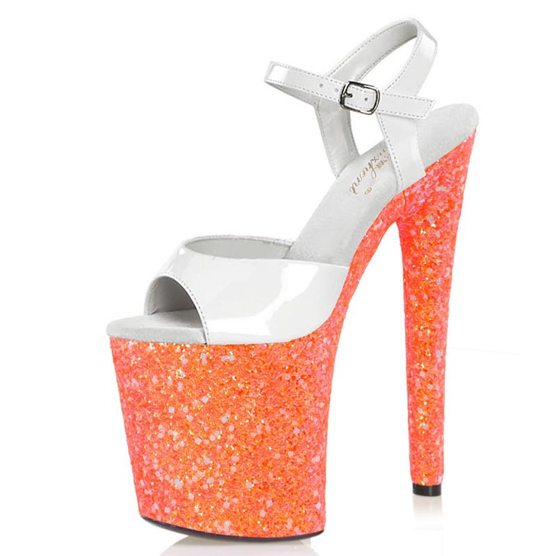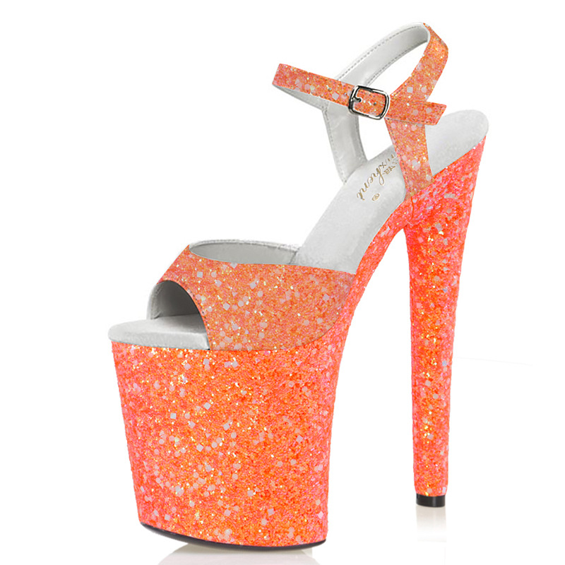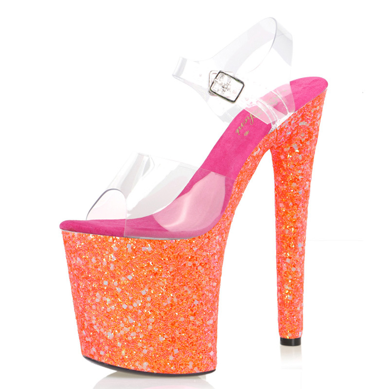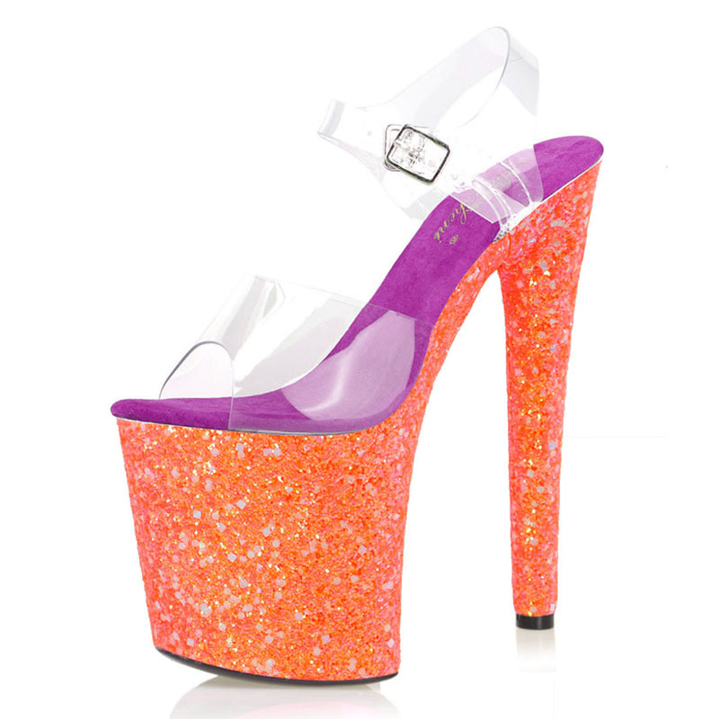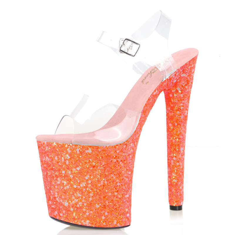 Đôi giày cao gót này có phần đế trong suốt và chiều cao nổi bật. Mũi giày kiểu dáng hở miệng cá, thân giày làm từ chất liệu thép bóng bẩy, điểm nhấn là lớp vảy óng ánh màu cam rực rỡ. Sản phẩm phù hợp để tạo điểm nhấn trong các buổi trình diễn thời trang hoặc khi biểu diễn với cột. Khi sử dụng, bạn nên cẩn thận di chuyển trên bề mặt bằng phẳng để giữ thăng bằng tốt. | Tên sản phẩm: Giày Cao Gót Nữ Trong Suốt Miệng Cá - Giày Dép Nữ | Mã sản phẩm: B0598 - Giá: 1.780.000đ | Mã nhà sản xuất: SHDI-G05Hình ảnh sản phẩm