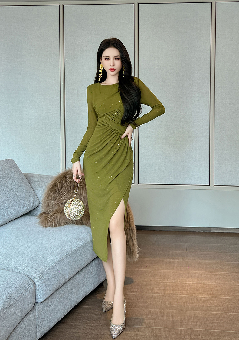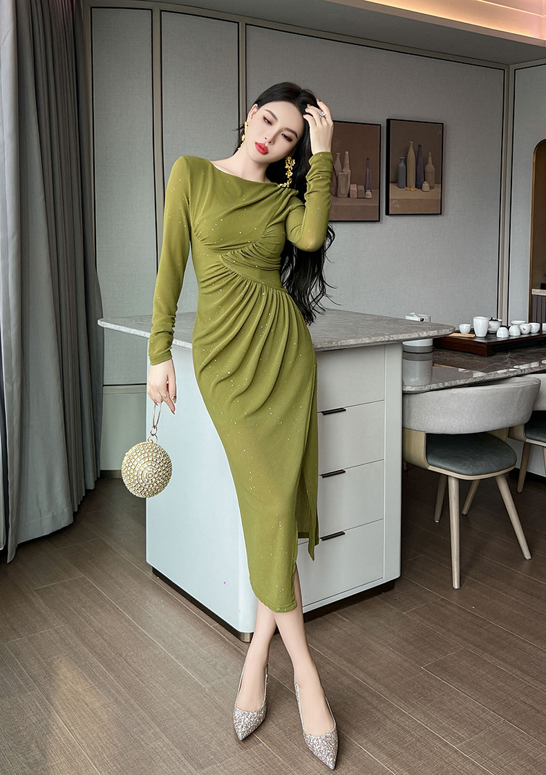 Chiếc đầm dành cho nữ, lấy ý tưởng từ phong cách thanh lịch. Thiết kế ôm vừa vặn phần eo và hông, giúp tôn lên những đường nét cơ thể. Chất liệu vải được tạo kiểu xếp ly tinh tế, kết hợp với đường cắt xẻ không đều ở phần váy, mang đến vẻ ngoại hình ưa nhìn. Sản phẩm thích hợp để mặc trong nhiều dịp khác nhau, từ những buổi gặp mặt thân mật cho đến các sự kiện thường ngày. | Tên sản phẩm: Váy Đầm Liền Thân Nữ Hàng Mùa Xuân Thu Đông - Thời Trang Nữ | Mã sản phẩm: B0609 - Giá: 950.000đ | Mã nhà sản xuất: CHDG-G03Hình ảnh sản phẩm