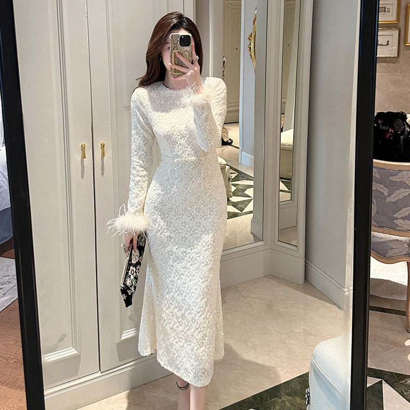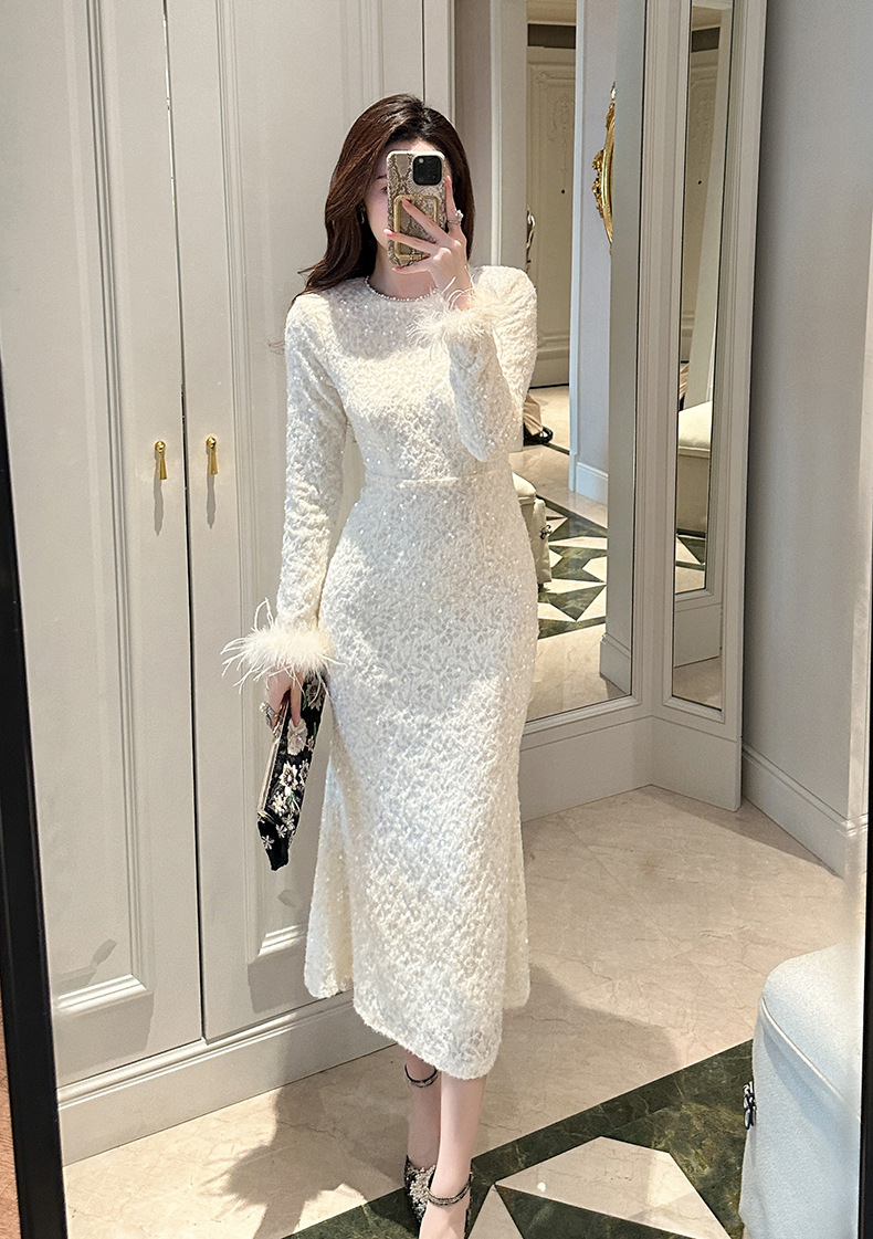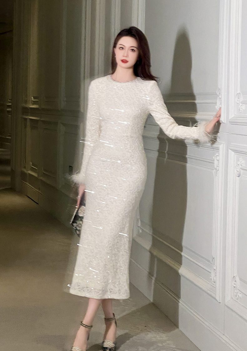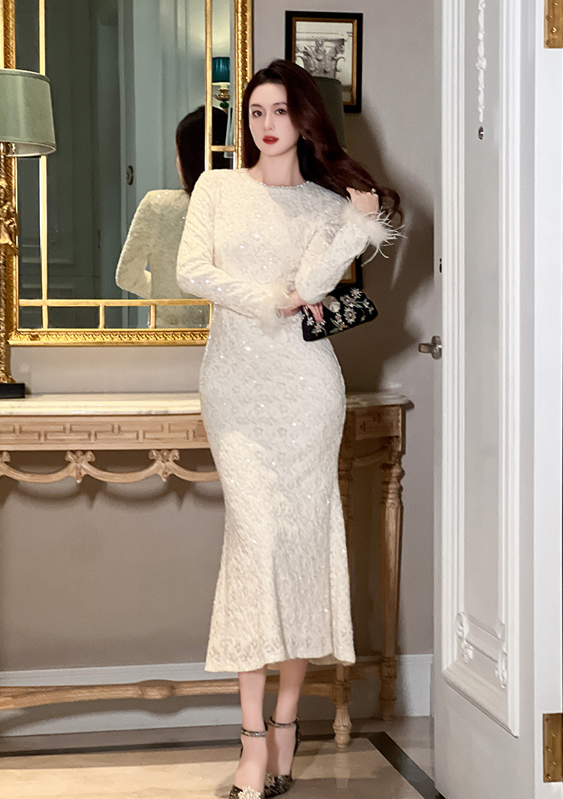 Váy dáng ôm body với phần chân váy xòe nhẹ như đuôi cá, tôn lên những đường nét cơ thể. Cổ tròn và tay áo được điểm xuyết bằng họa tiết ren tinh tế. Toàn thân váy được phủ lớp hạt lấp lánh nhẹ nhàng, tạo điểm nhấn thu hút. Sản phẩm phù hợp cho các buổi tiệc hoặc sự kiện. Bạn có thể kết hợp cùng giày cao gót và một chiếc túm nhỏ để hoàn thiện phong cách. | Tên sản phẩm: Váy Đầm Liền Thân Nữ Chất Liệu Ren Dáng Ôm Kiểu Đuôi Cá Hàng Mùa Xuân Thu Đông - Thời Trang Nữ | Mã sản phẩm: B0715 - Giá: 1.530.000đ | Mã nhà sản xuất: CHDG-G04Hình ảnh sản phẩm