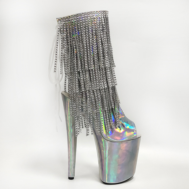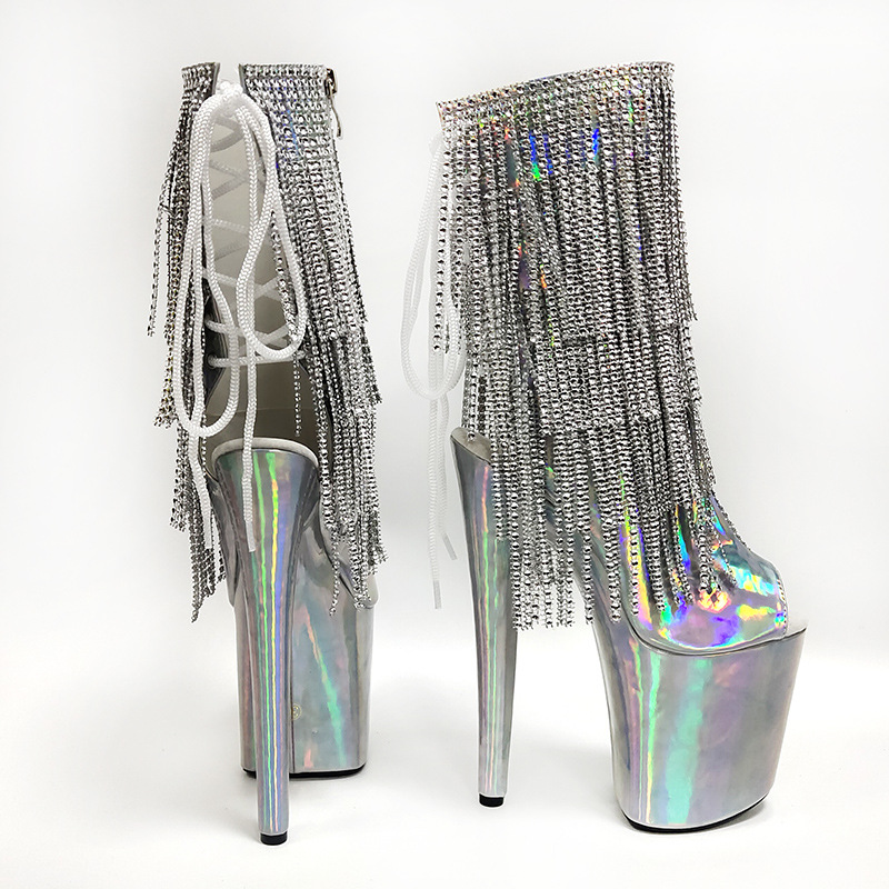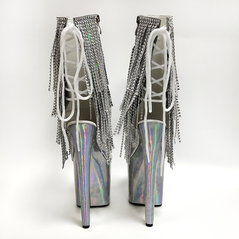 Đôi giày này có phần đế rất cao và dày, giúp tăng thêm chiều cao đáng kể. Thiết kế kiểu hở mũi, phía trên có điểm xuyết những hạt pha lê lấp lánh cùng các sợi tua rua mềm mại tạo nên sự chuyển động uyển chuyển. Sản phẩm thích hợp để biểu diễn hoặc tạo điểm nhấn trong các bộ trang phục. Khi sử dụng, bạn nên cẩn thận di chuyển trên các bề mặt bằng phẳng để giữ thăng bằng tốt hơn. | Tên sản phẩm: Giày Cao Gót Nữ Cao 20cm Gắn Đá Chống Nước Miệng Cá Phong Cách Âu Mỹ - Giày Dép Nữ | Mã sản phẩm: B0737 - Giá: 2.200.000đ | Mã nhà sản xuất: SHDI-G05Hình ảnh sản phẩm