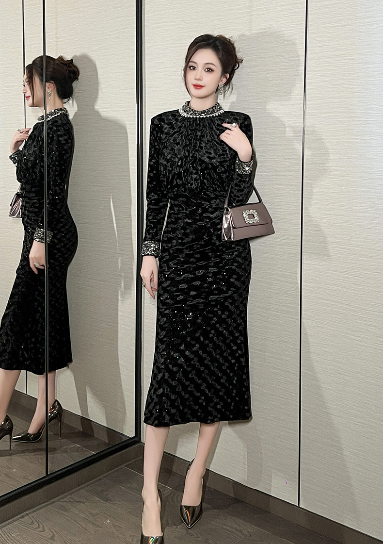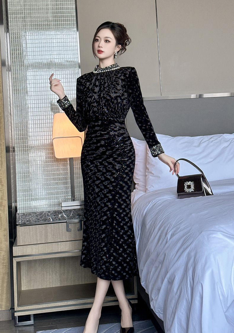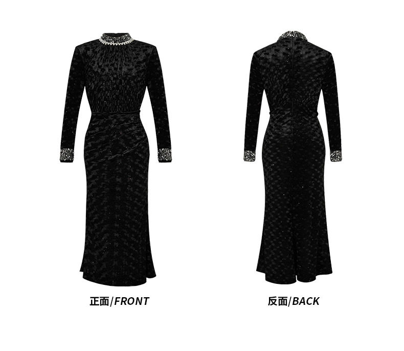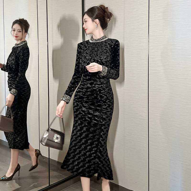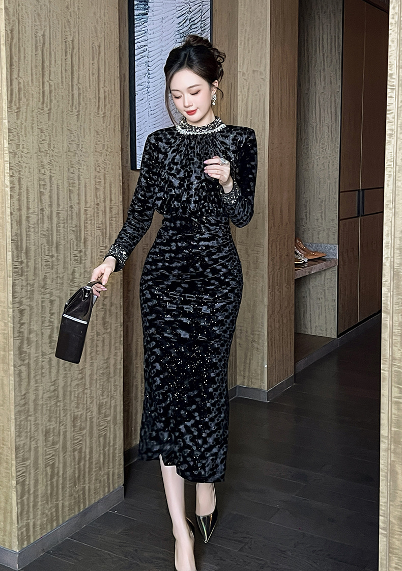 Chiếc váy dáng dài từ chất liệu nhung mềm mại, điểm nổi bật với đường nét ôm eo tôn dáng. Trên nền vải, những hạt ngọc tr và đường thêu được tỉ mỉ kết hợp, tạo nên vẻ đẹp tinh tế. Kiểu dáng mang phong cách thanh lịch, phù hợp cho nhiều dịp khác nhau. Có thể mặc như một chiếc váy hoàn chỉnh hoặc dùng làm váy bên trong để phối cùng áo khoác. | Tên sản phẩm: Váy Đầm Liền Thân Nữ Hàng Mùa Xuân Thu Đông - Thời Trang Nữ | Mã sản phẩm: B0758 - Giá: 1.220.000đ | Mã nhà sản xuất: CHDG-G04Hình ảnh sản phẩm
