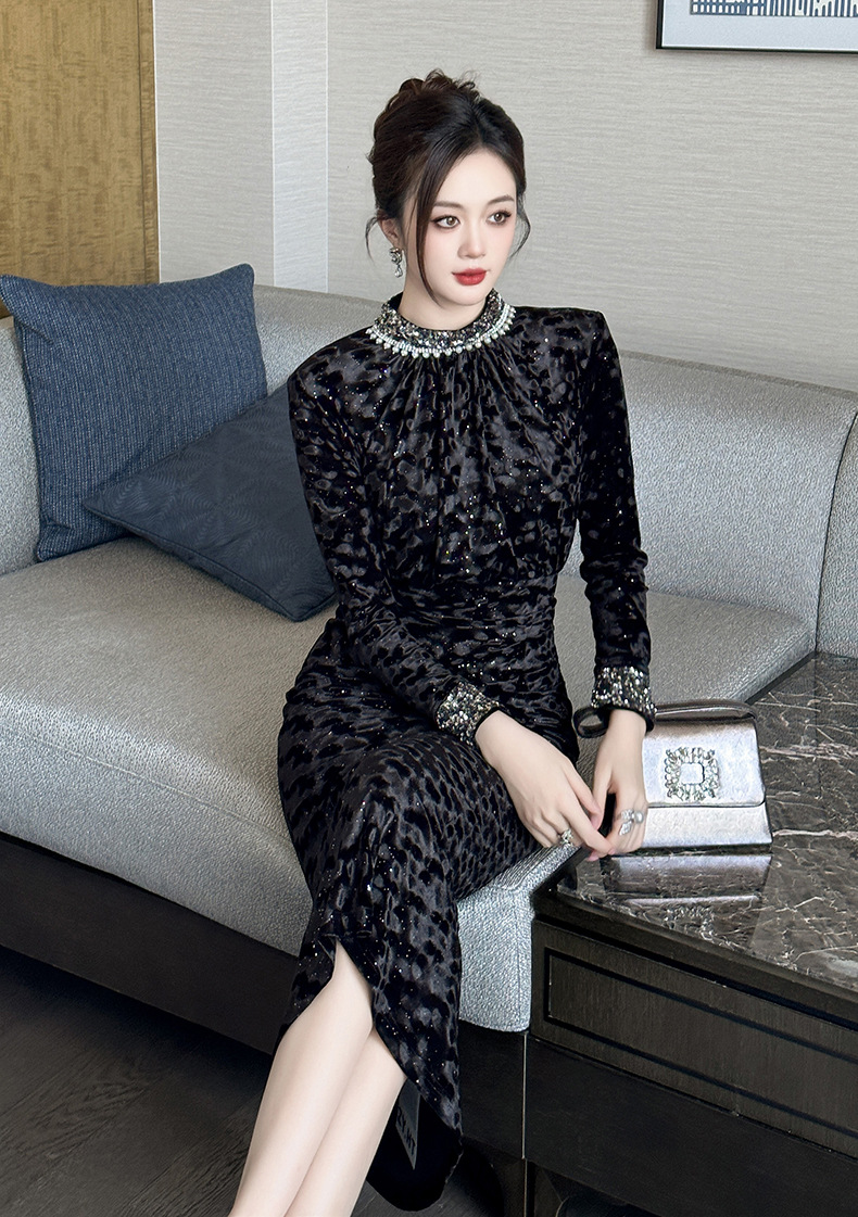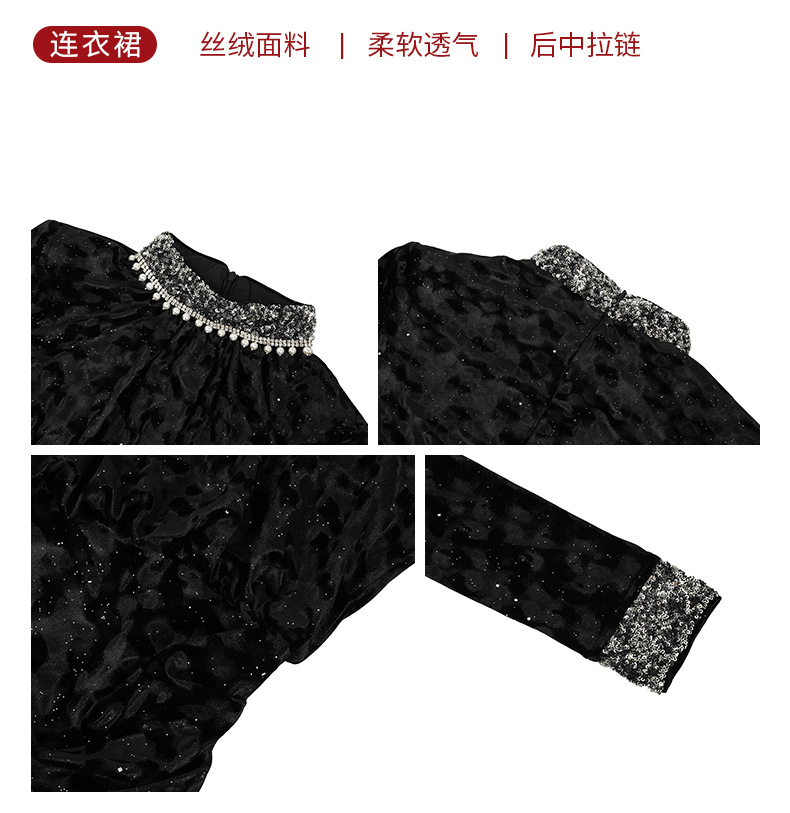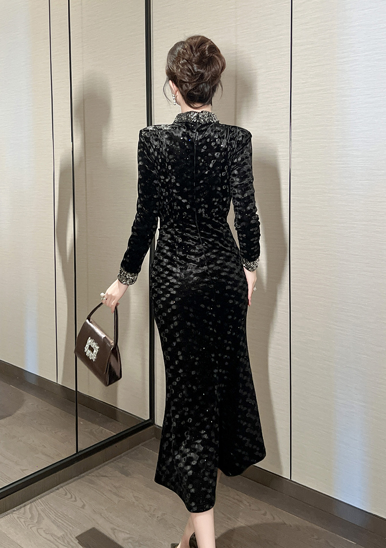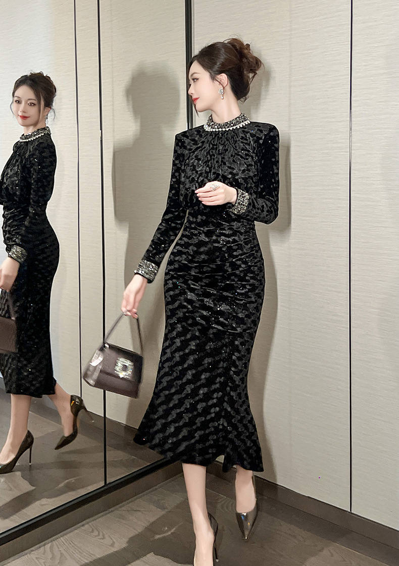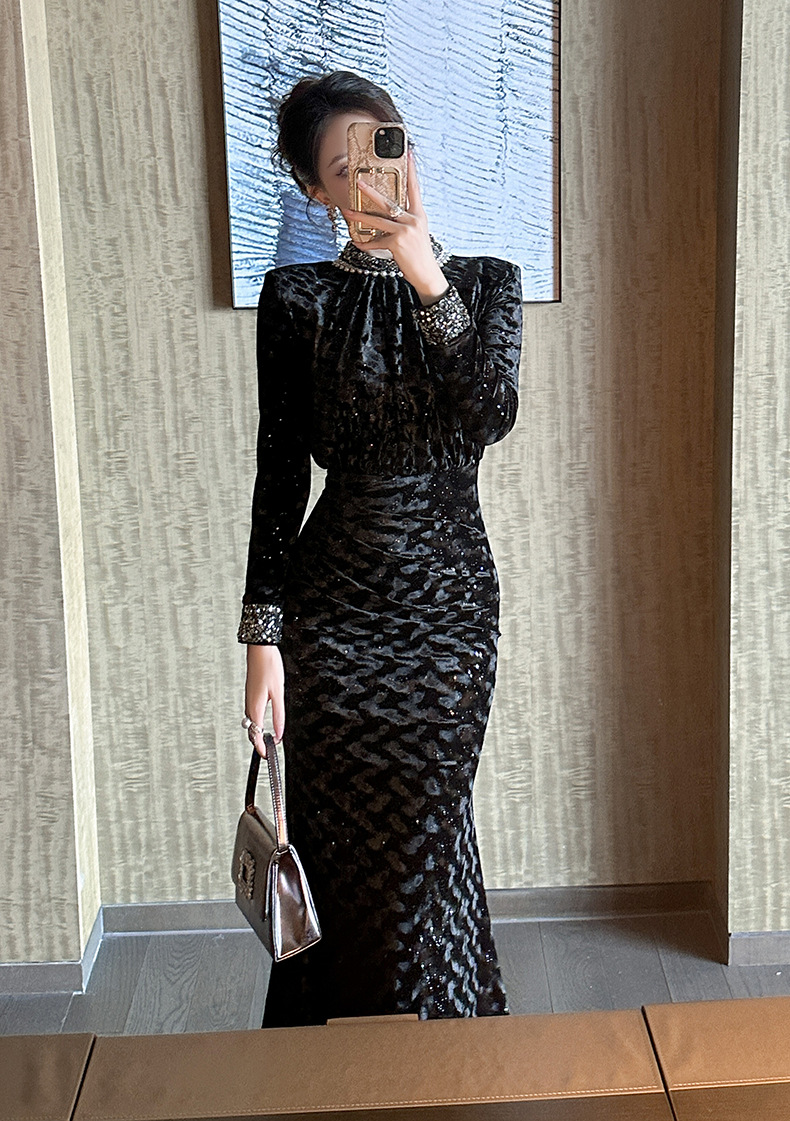 Chiếc váy dáng dài từ chất liệu nhung mềm mại, điểm nổi bật với đường nét ôm eo tôn dáng. Trên nền vải, những hạt ngọc tr và đường thêu được tỉ mỉ kết hợp, tạo nên vẻ đẹp tinh tế. Kiểu dáng mang phong cách thanh lịch, phù hợp cho nhiều dịp khác nhau. Có thể mặc như một chiếc váy hoàn chỉnh hoặc dùng làm váy bên trong để phối cùng áo khoác. | Tên sản phẩm: Váy Đầm Liền Thân Nữ Hàng Mùa Xuân Thu Đông - Thời Trang Nữ | Mã sản phẩm: B0758 - Giá: 1.220.000đ | Mã nhà sản xuất: CHDG-G04Hình ảnh sản phẩm