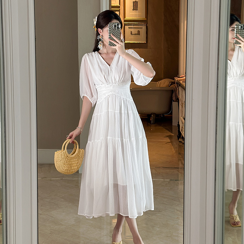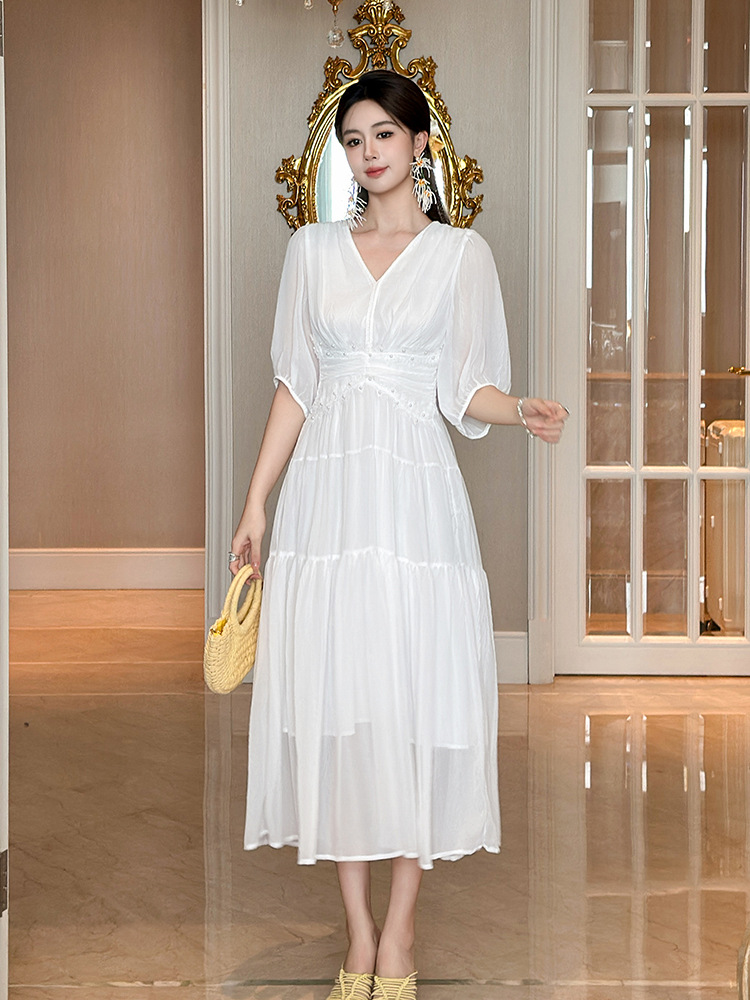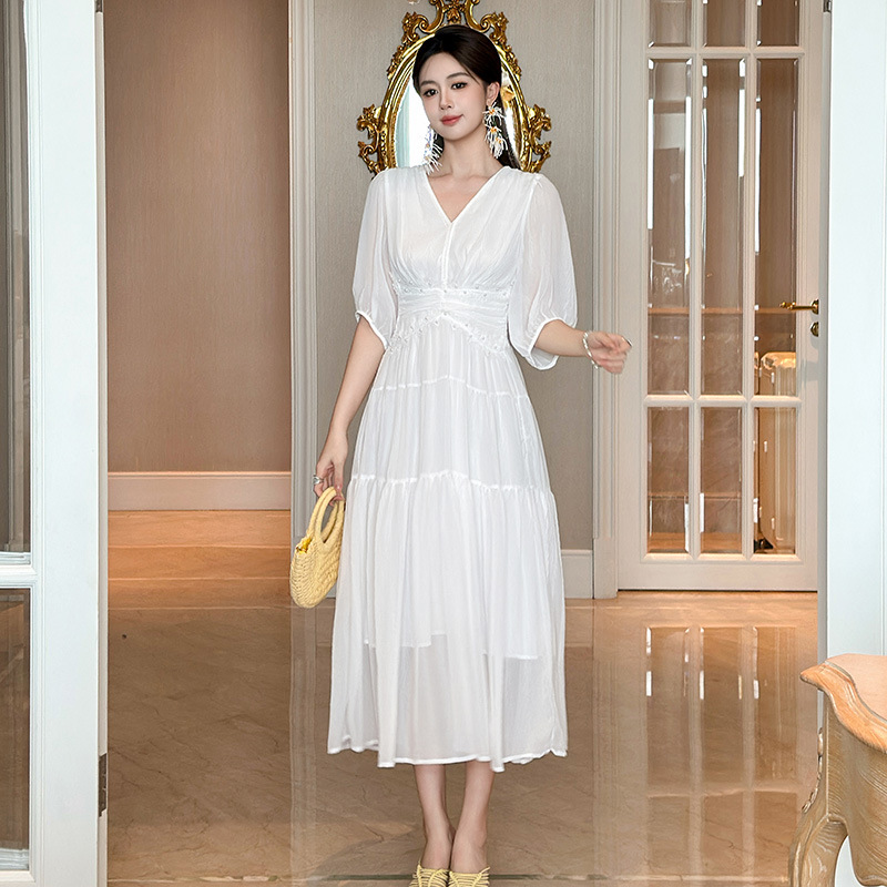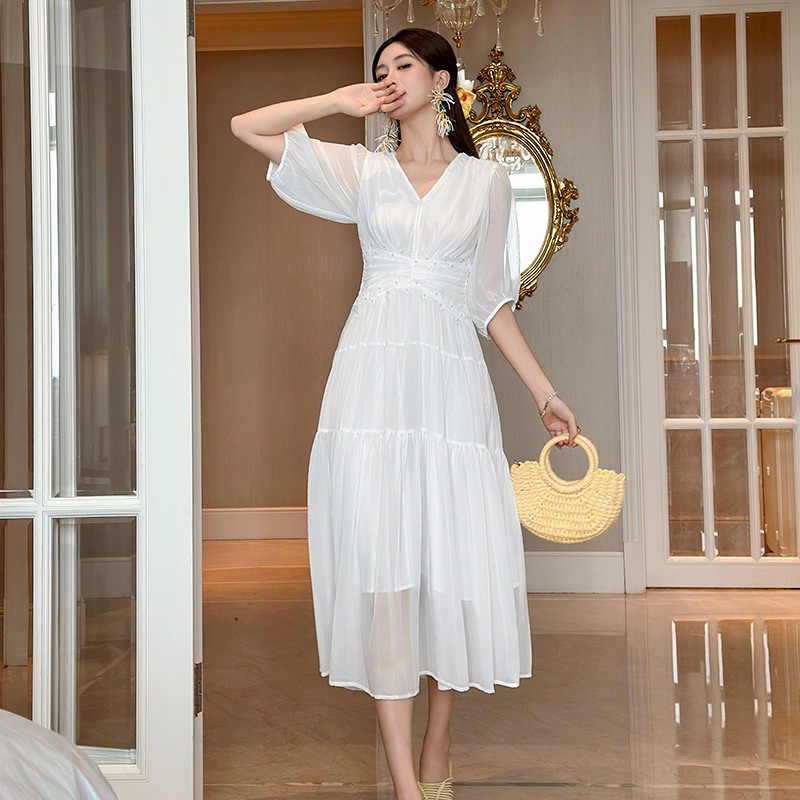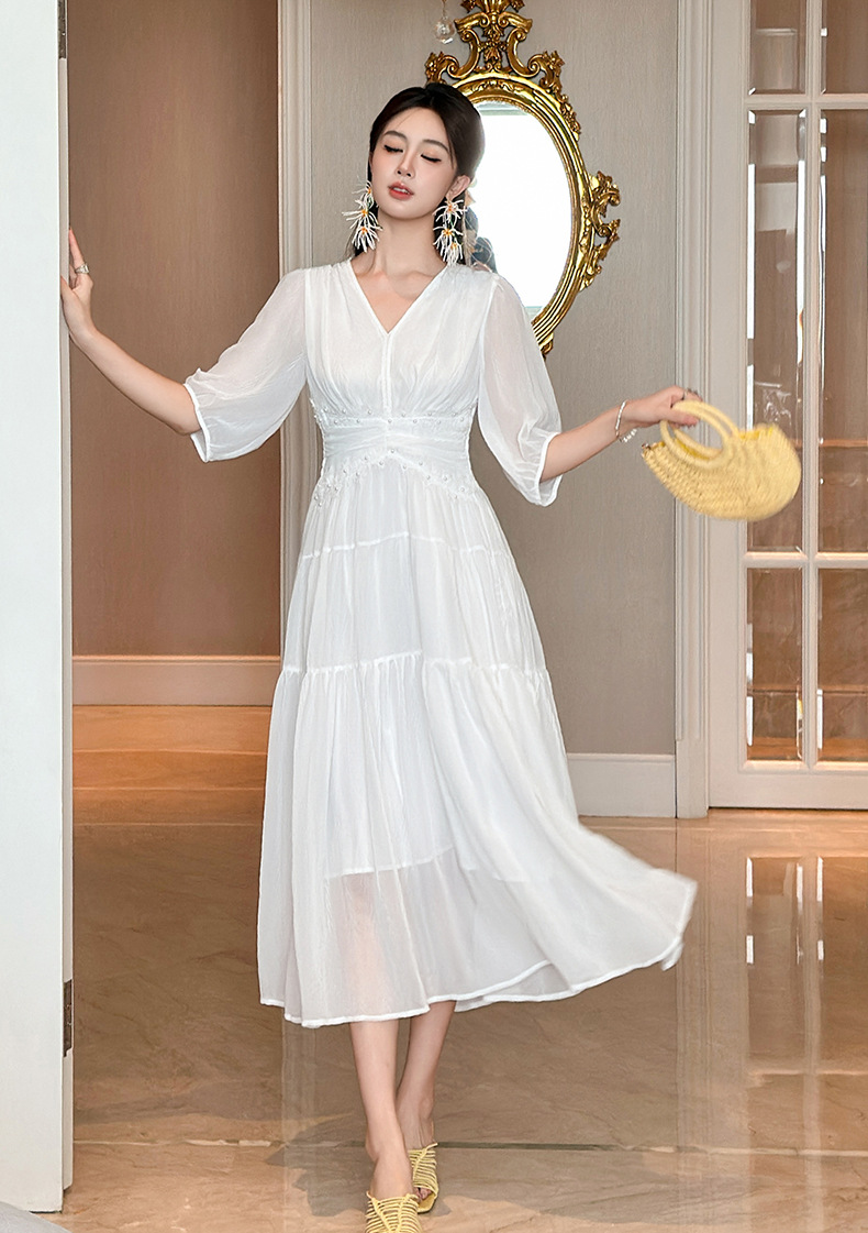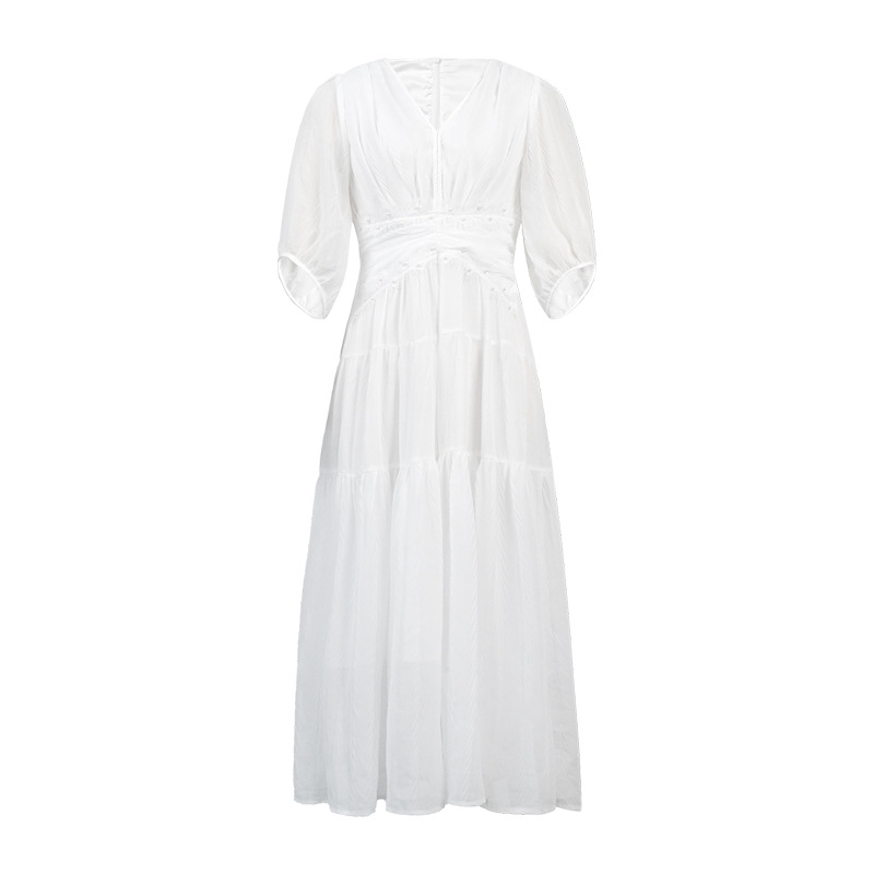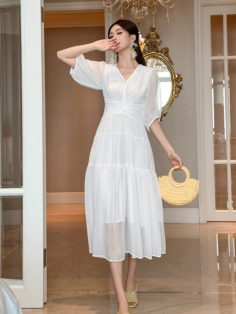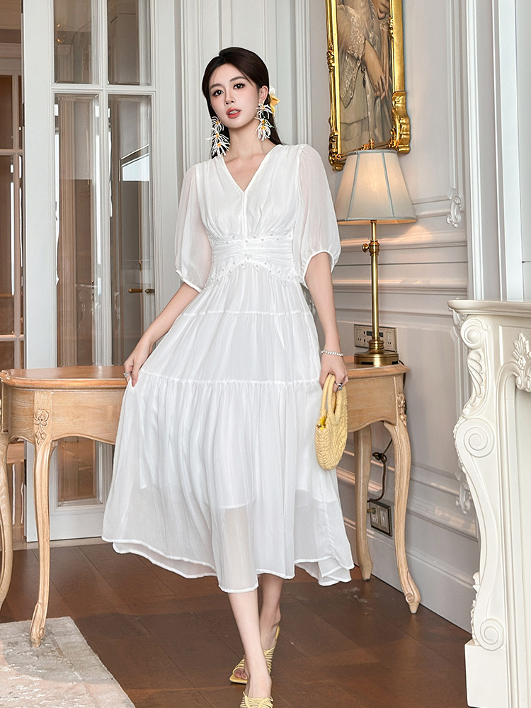 Chiếc váy dài mang phong cách Pháp nhẹ nhàng, dành cho mùa thu. Chất liệu voan mỏng nhẹ tạo nên độ rủ mềm mại và bay bổng cho mỗi bước chân. Thiết kế cổ yếm, tay bồng cùng thân váy xòe rộng toát lên vẻ đẹp nữ tính, thanh thoát. Sản phẩm phù hợp để mặc trong nhiều dịp khác nhau, từ những buổi gặp mặt thân mật đến dạo phố. Có thể phối cùng giày bệt hoặc giày có qu để hoàn thiện bộ trang phục. | Tên sản phẩm: Váy Đầm Liền Thân Dáng Dài Nữ Chất Liệu Vải Voan Hàng Mùa Xuân Thu Đông - Thời Trang Nữ | Mã sản phẩm: B0805 - Giá: 1.360.000đ | Mã nhà sản xuất: CHDG-G04Hình ảnh sản phẩm