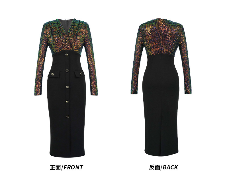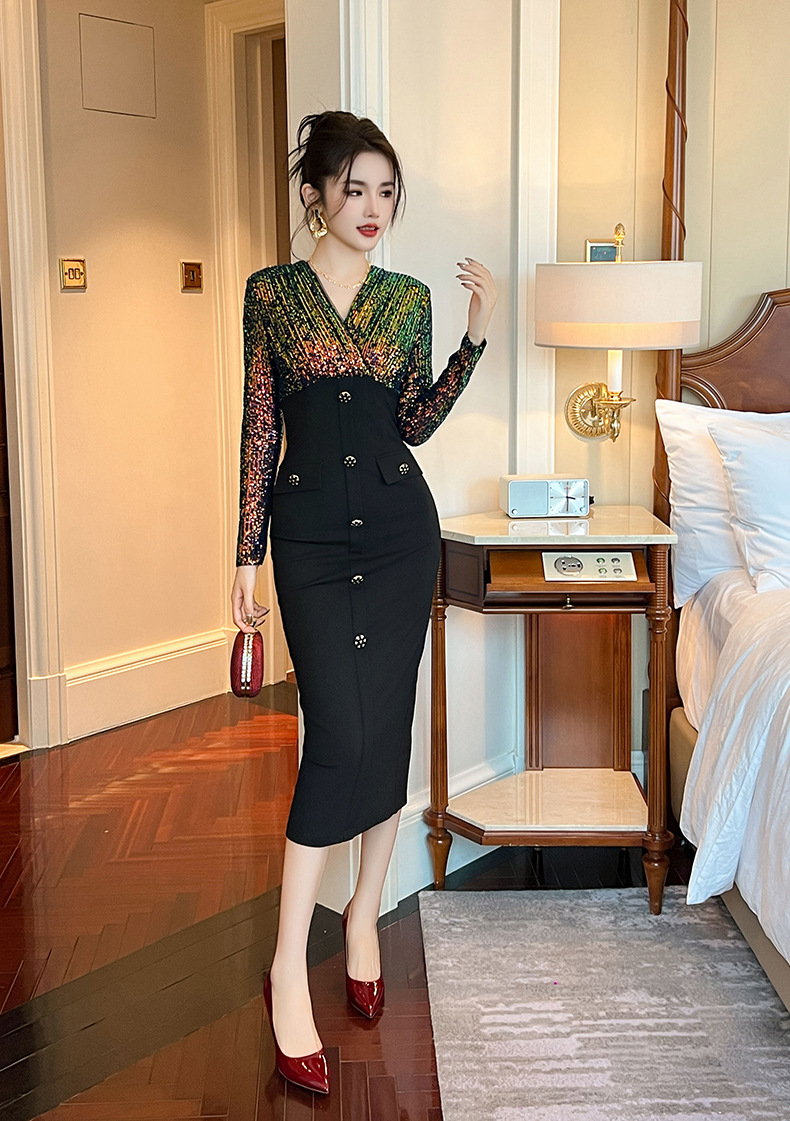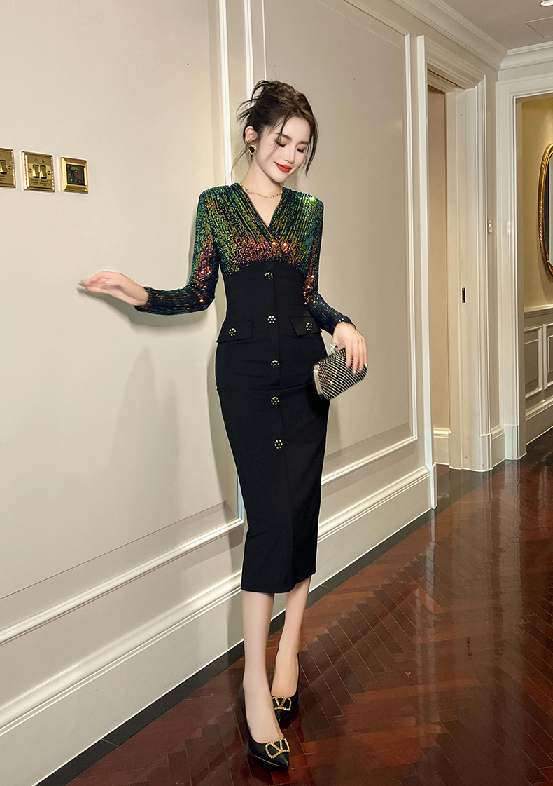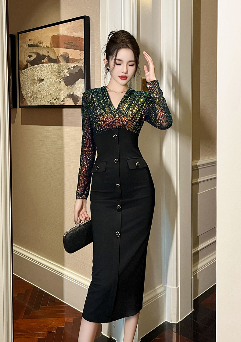 Đầm dự tiệc tối với kiểu dáng ôm sát tôn dáng, cổ xẻ hình chữ V thanh lịch. Thân váy được điểm xuyến những chi tiết ánh kim lấp lánh, tạo điểm nhấn nổi bật dưới ánh đèn. Thiết kế eo thon và phần váy bó nhẹ giúp tôn lên những đường nét cơ thể. Sản phẩm phù hợp cho các buổi liên hoan cuối năm hoặc sự kiện vào buổi tối. Có thể giặt tay và phơi nơi thoáng mát để giữ form váy đẹp lâu dài. | Tên sản phẩm: Váy Đầm Liền Thân Nữ Cổ Chữ V Hàng Mùa Xuân Thu Đông - Thời Trang Nữ | Mã sản phẩm: B1081 - Giá: 1.260.000đ | Mã nhà sản xuất: CHDG-G04Hình ảnh sản phẩm