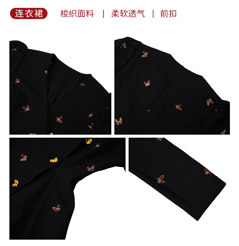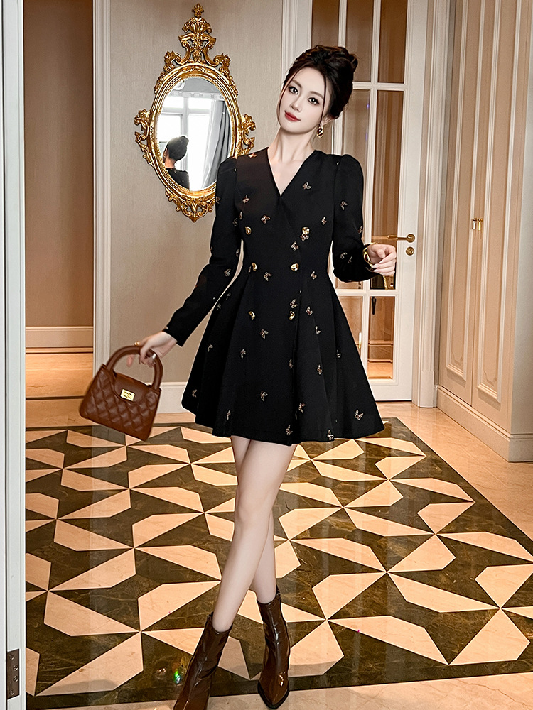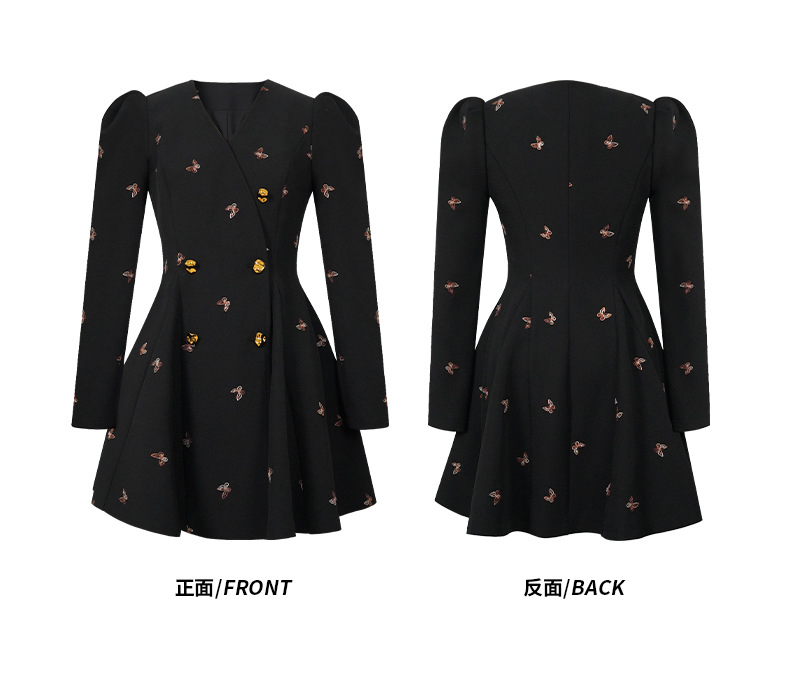Chiếc đầm dành cho mùa thu đông này có điểm nhấn là cổ chữ V tạo dáng thanh lịch. Trên nền vải màu đen, họa tiết thêu hình bướm tinh xảo được điểm xuyết một cách tinh tế. Thiết kế ôm eo nhẹ nhàng kết hợp cùng phần chân váy xòe phồng nhẹ, giúp tôn lên vóc dáng một cách tự nhiên. Sản phẩm dễ dàng phối cùng giày cao gót hay giày bệt, thích hợp cho nhiều dịp đi chơi, gặp gỡ. | Tên sản phẩm: Váy Đầm Liền Thân Nữ Thêu Họa Tiết Hoa Cổ Chữ V Hàng Mùa Xuân Thu Đông - Thời Trang Nữ | Mã sản phẩm: B1086 - Giá: 1.380.000đ | Mã nhà sản xuất: CHDG-G04Hình ảnh sản phẩm