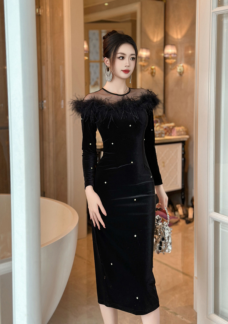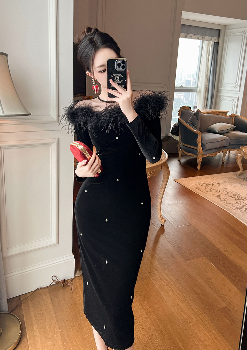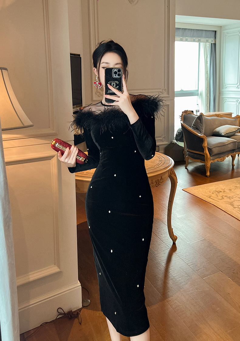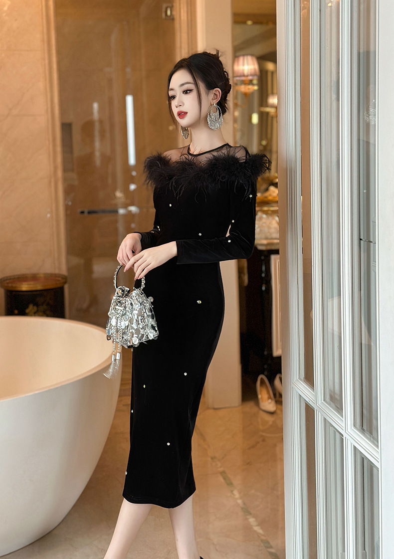 Đầm dạ dự tiệc với chất vải mềm mại như nhung, ôm sát cơ thể một cách thanh lịch. Thiết kế cổ ngang thẳng tôn vẻ gợi cảm, kết hợp đường viền tà áo được cắt xử lý tinh tế cùng điểm nhấn là các hạt đá lấp lánh. Kiểu dáng bó eo và xòe nhẹ ở gấu tạo nên sự uyển chuyển. Phù hợp cho các buổi gặp mặt hoặc sự kiện vào mùa thu. Mặc kèm phụ kiện nhẹ để hoàn thiện bộ trang phục. | Tên sản phẩm: Váy Đầm Liền Thân Nữ Hàng Mùa Xuân Thu Đông - Thời Trang Nữ | Mã sản phẩm: B1259 - Giá: 1.200.000đ | Mã nhà sản xuất: CHDG-G04Hình ảnh sản phẩm