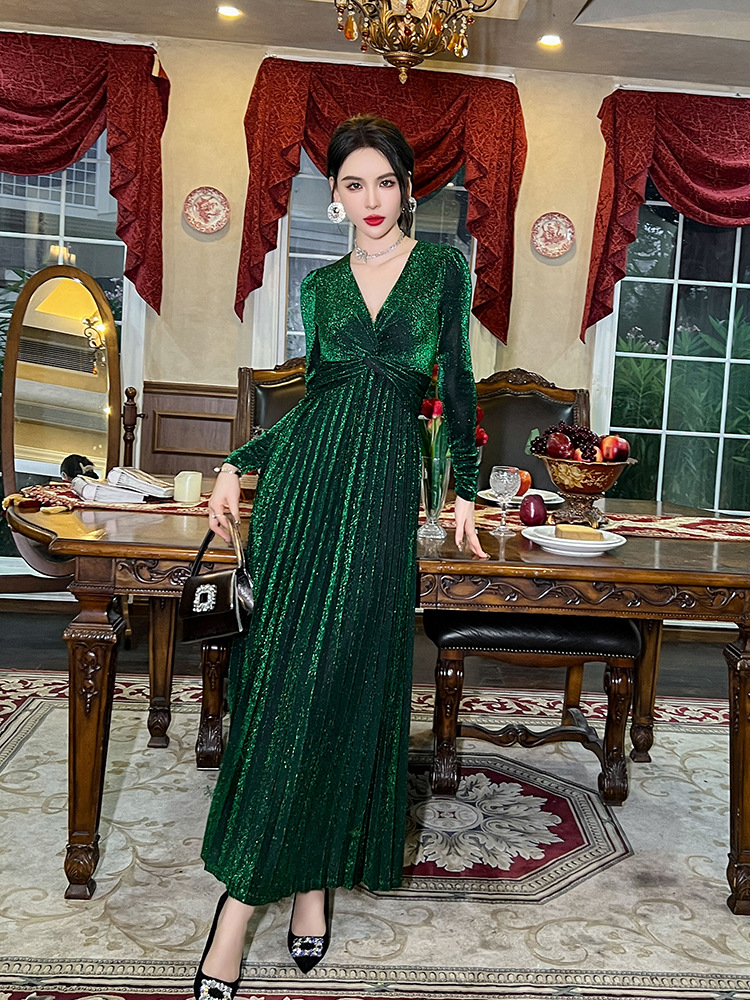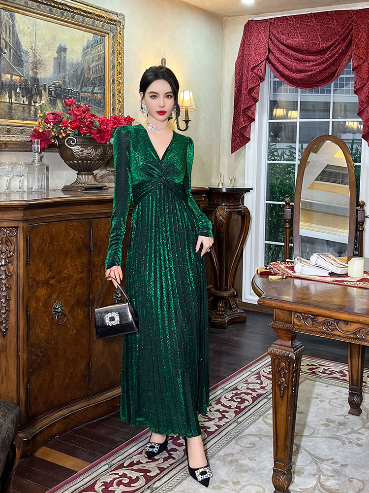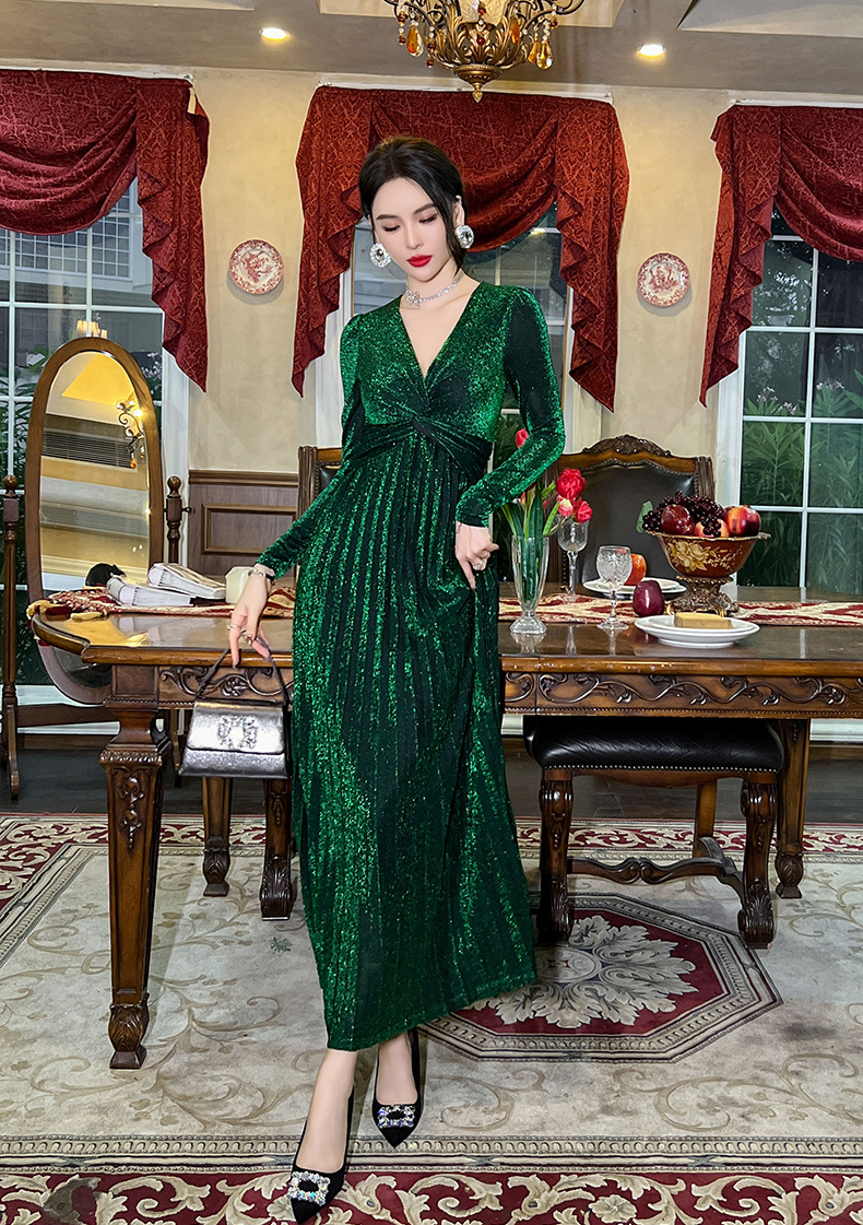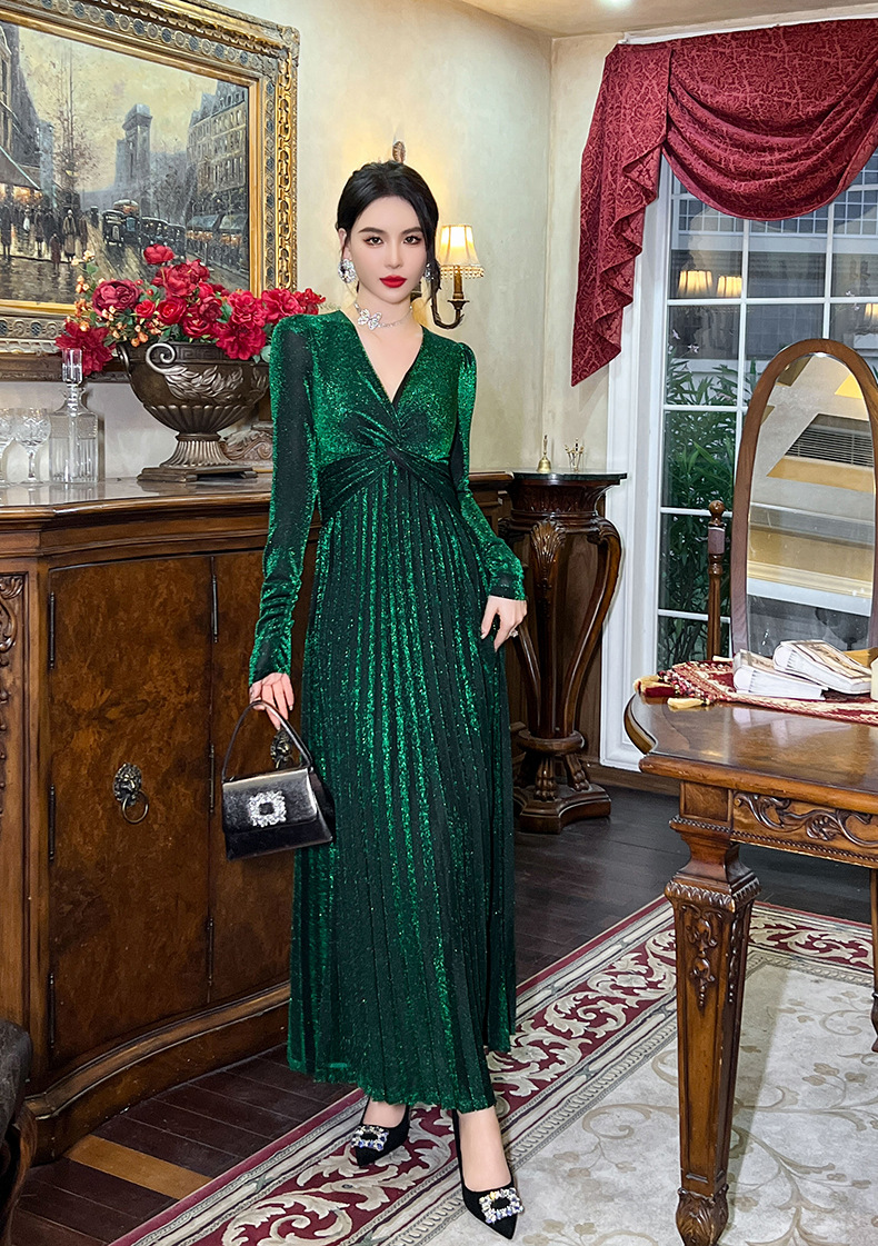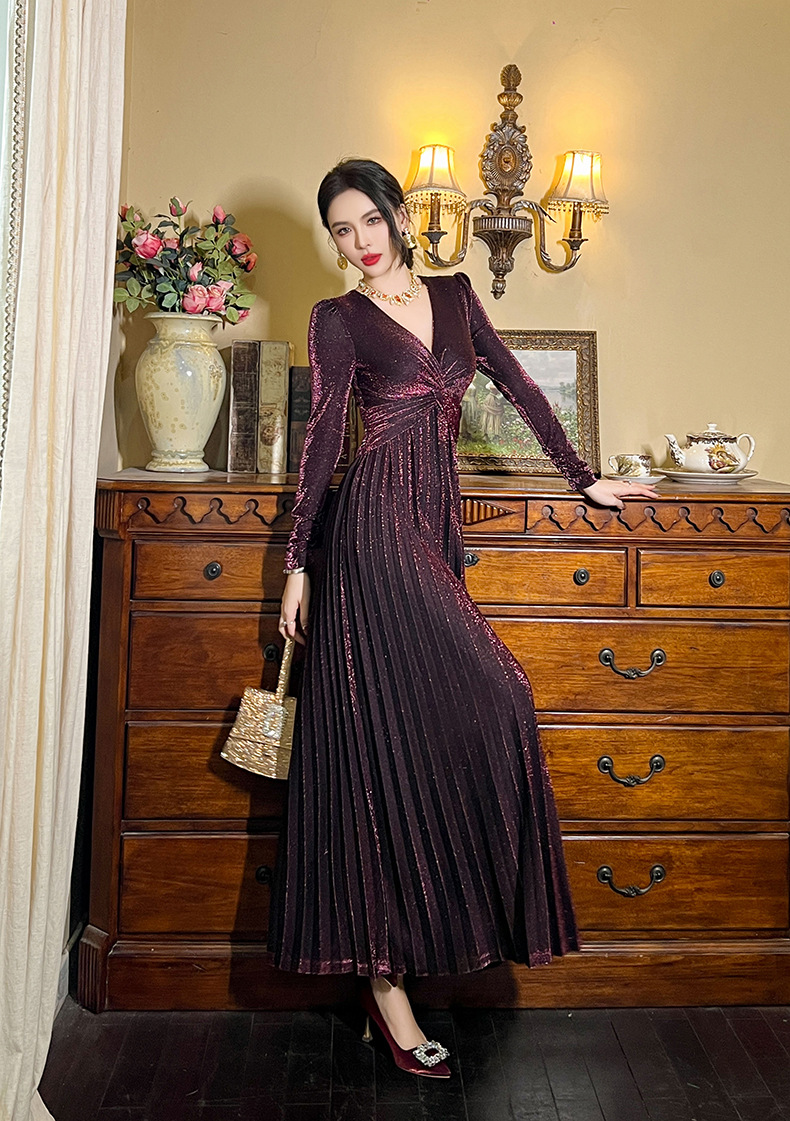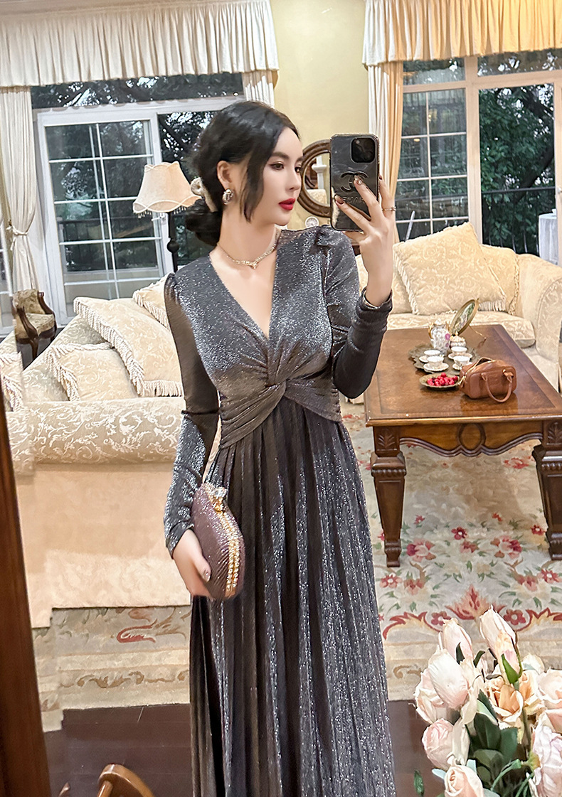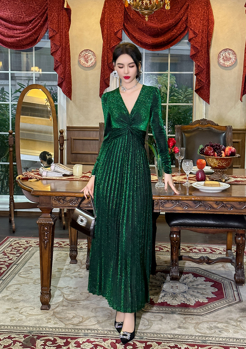 Chiếc đầm dành cho mùa thu với thiết kế vòng cổ chữ V tôn dáng, điểm nhấn là nút thắt trang nhã ngay trước ngực. Chất vải óng ánh tạo nên vẻ đẹp hiện đại, kết hợp cùng các đường xếp ly mềm mại từ eo xuống tà, giúp tôn lên đường nét cơ thể. Sản phẩm có phần eo cao giúp tạo dáng thanh thoát. Mặc kèm với giày cao gót hoặc giày đế bằng đều phù hợp, dễ dàng phối đồ cho nhiều dịp khác nhau. | Tên sản phẩm: Váy Đầm Liền Thân Nữ Cổ Chữ V Hàng Mùa Xuân Thu Đông - Thời Trang Nữ | Mã sản phẩm: B1270 - Giá: 1.260.000đ | Mã nhà sản xuất: CHDG-G04Hình ảnh sản phẩm