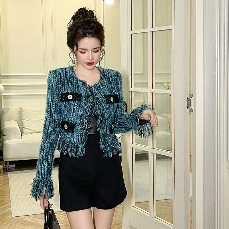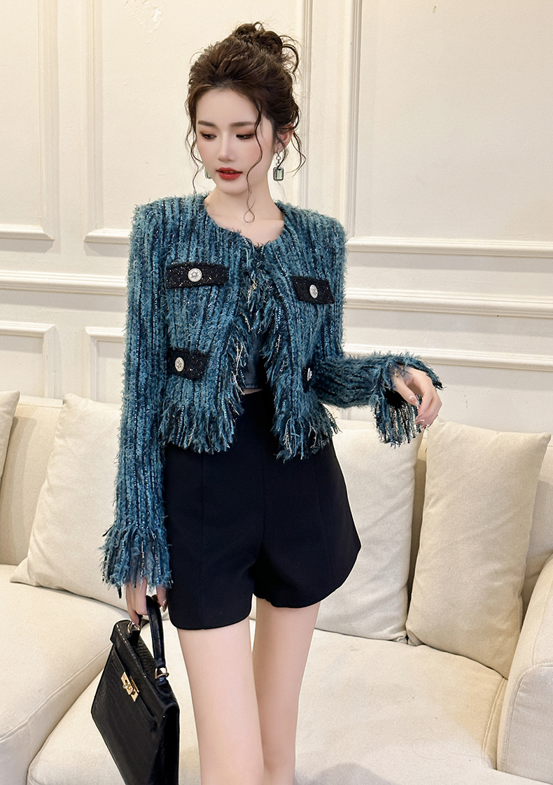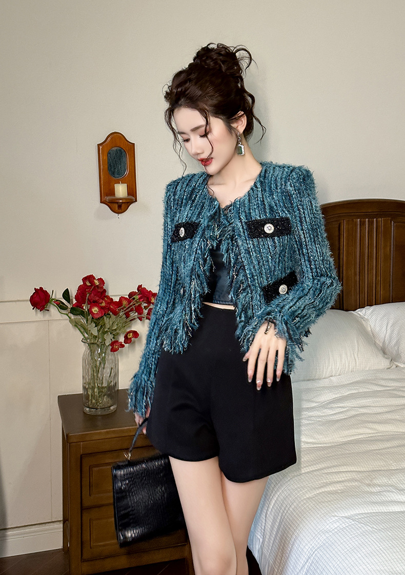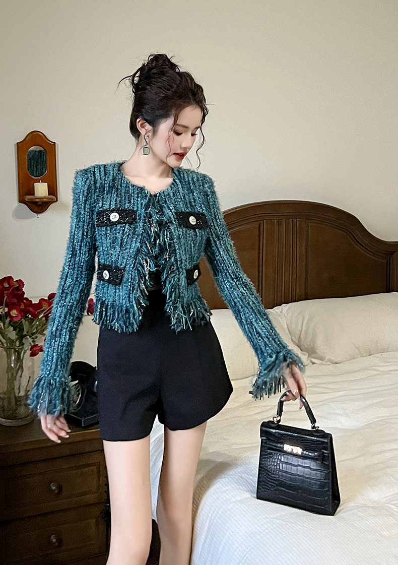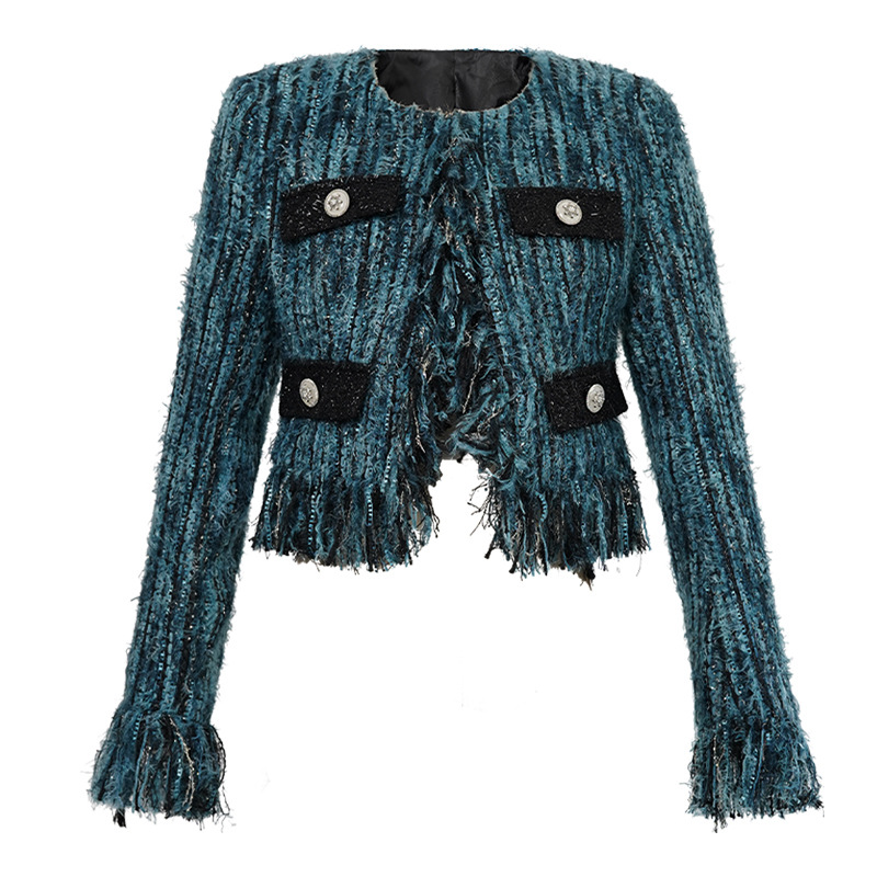 Áo khoác nữ ngắn kiểu dáng ôm dành cho mùa thu đông. Thiết kế tôn dáng với phần l áo điểm xuyến những chi tiết tua rua tinh tế, giúp tạo điểm nhấn nổi bật. Kiểu áo này dễ dàng phối cùng nhiều trang phục như quần dài, chân váy. Bạn có thể mặc bên trong áo thun hoặc áo len để giữ ấm và tạo sự cân đối cho tổng thể. | Tên sản phẩm: Áo Khoác Nữ Dáng Ôm Hàng Mùa Xuân Thu Đông - Thời Trang Nữ | Mã sản phẩm: B1365 - Giá: 1.360.000đ | Mã nhà sản xuất: CHDG-G04Hình ảnh sản phẩm