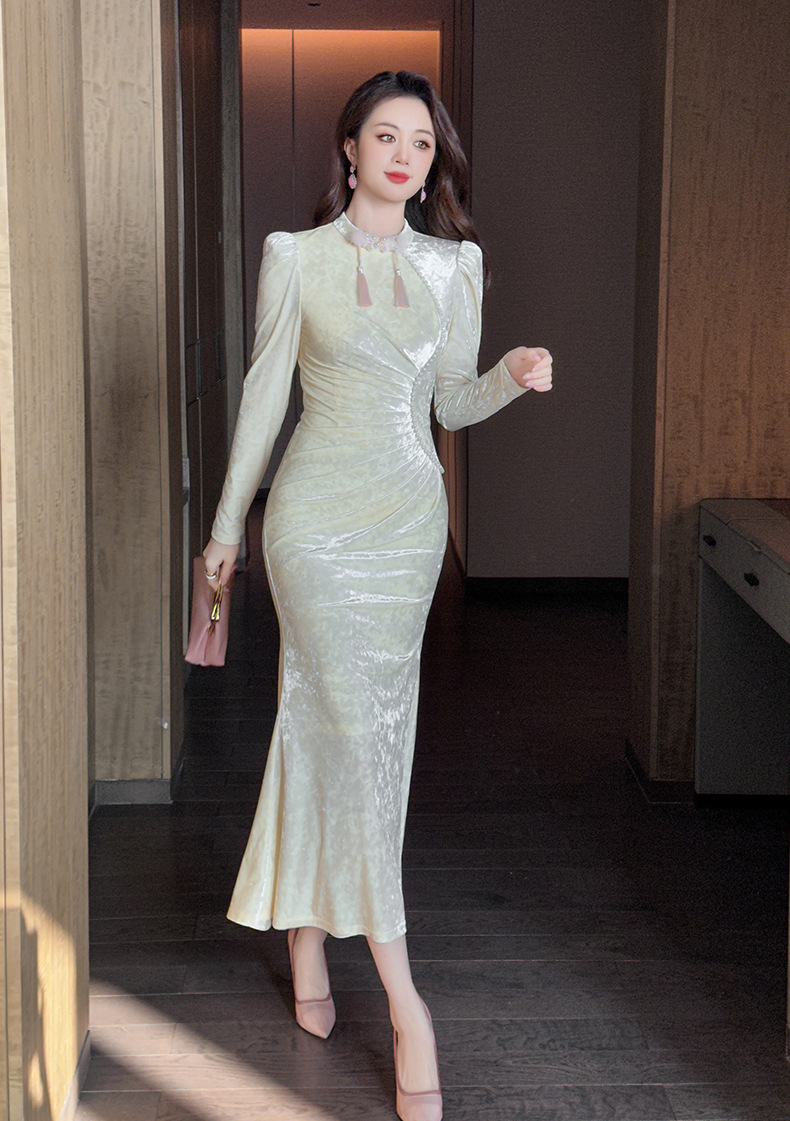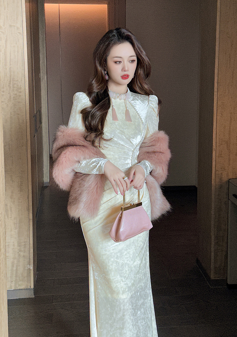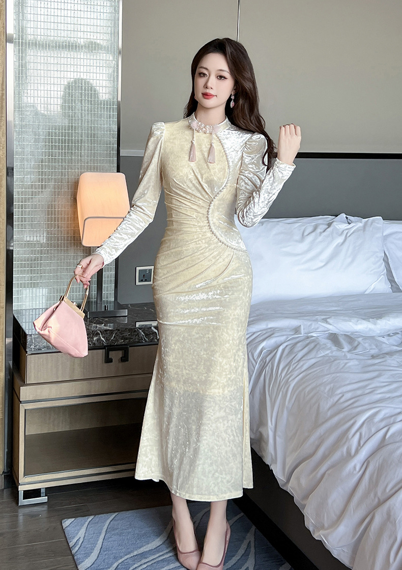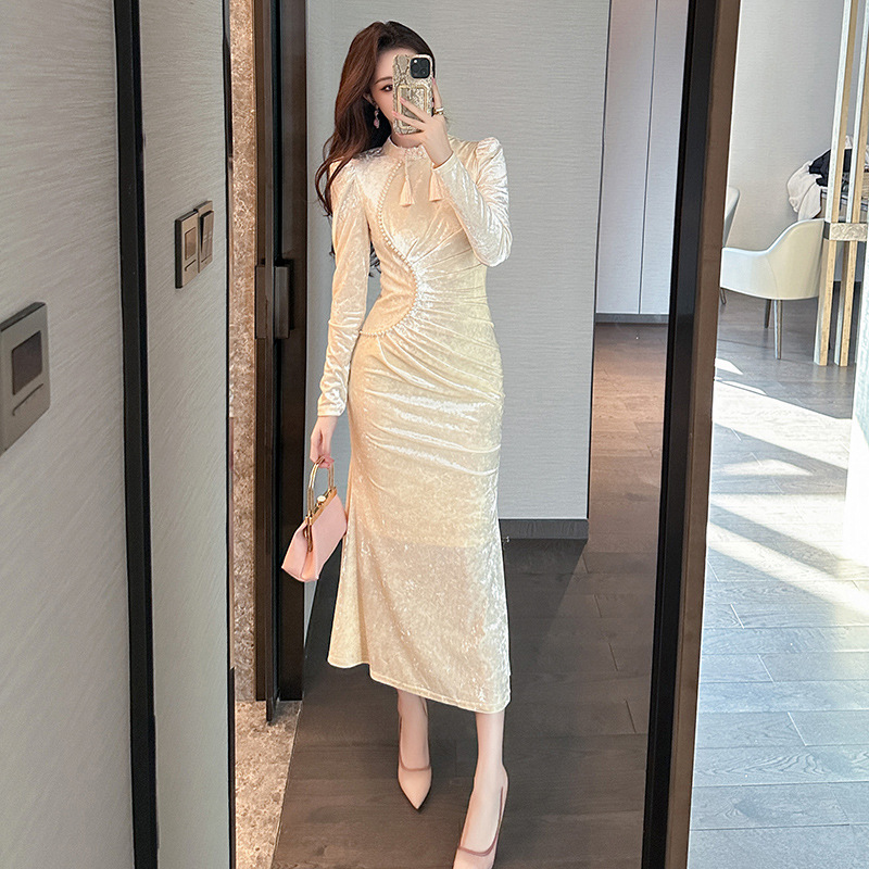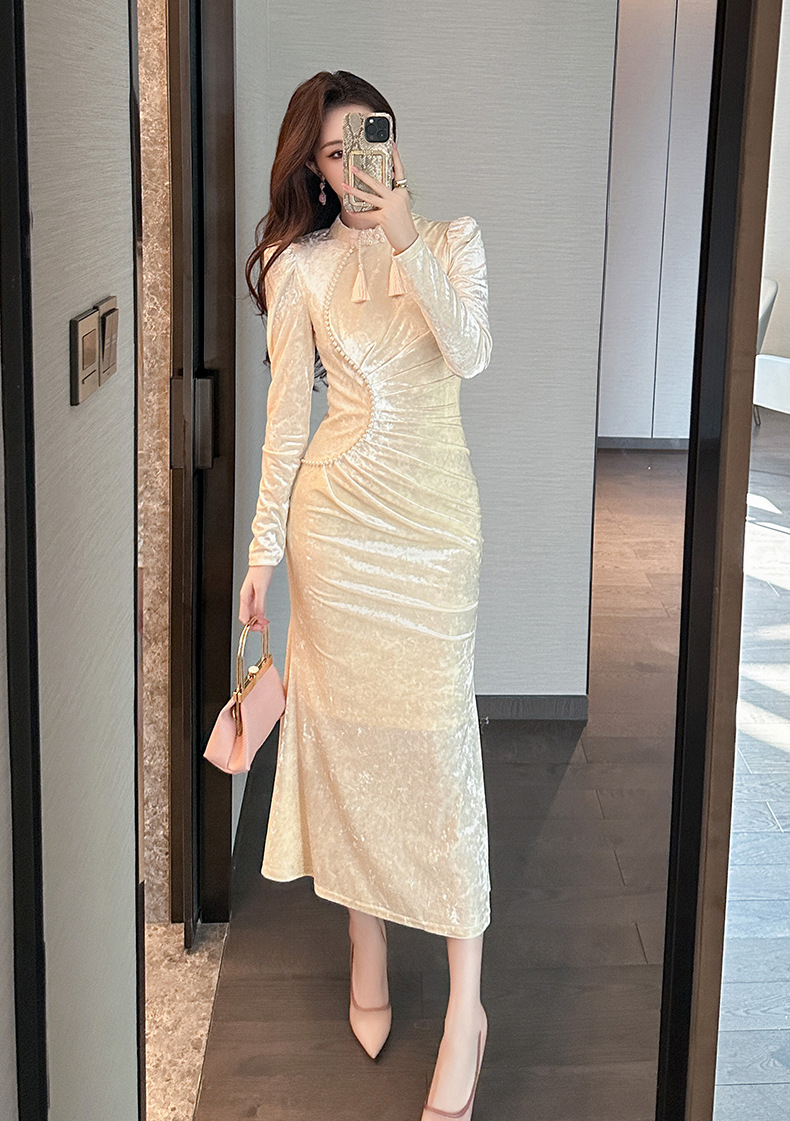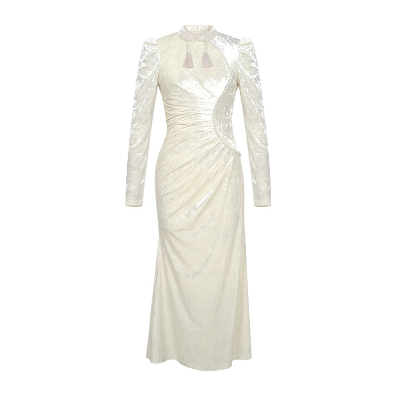 Chiếc đầm dáng ôm này được làm từ chất liệu nhung mềm mại, mang đến cảm giác dễ chịu khi mặc. Kiểu dáng cổ đứng và hàng cúc tà điểm xuyết tạo nên nét duyên dáng, phù hợp cho những dịp cần sự chỉn chu. Sản phẩm có màu trắng tinh khôi, dễ dàng phối cùng giày cao gót và túi xách. Bạn có thể mặc nó để đi làm hoặc dự các buổi gặp mặt. | Tên sản phẩm: Váy Đầm Liền Thân Nữ Hàng Mùa Xuân Thu Đông - Thời Trang Nữ | Mã sản phẩm: B1370 - Giá: 1.350.000đ | Mã nhà sản xuất: CHDG-G04Hình ảnh sản phẩm