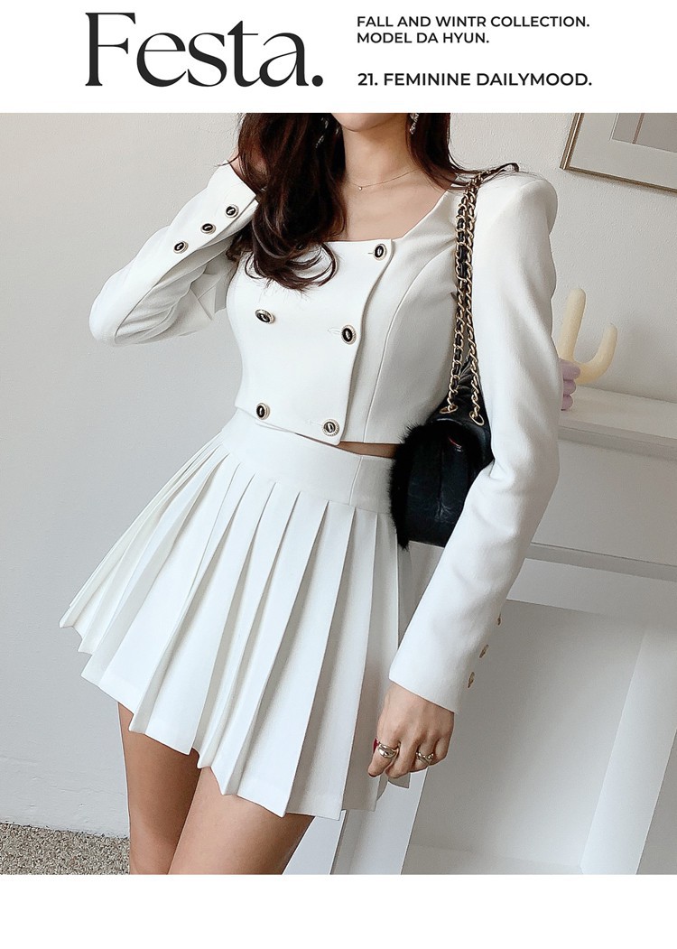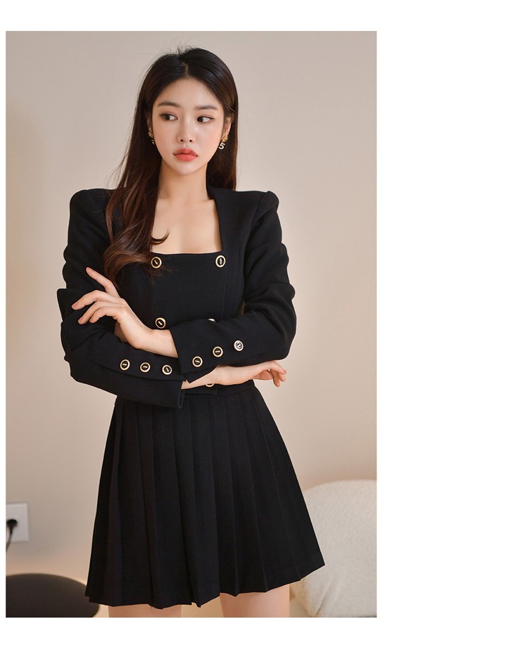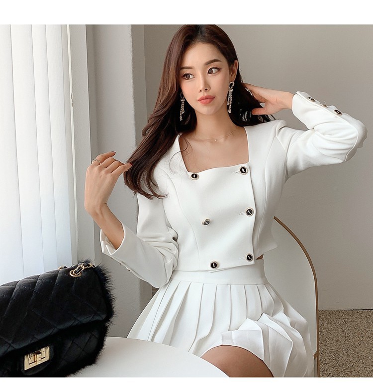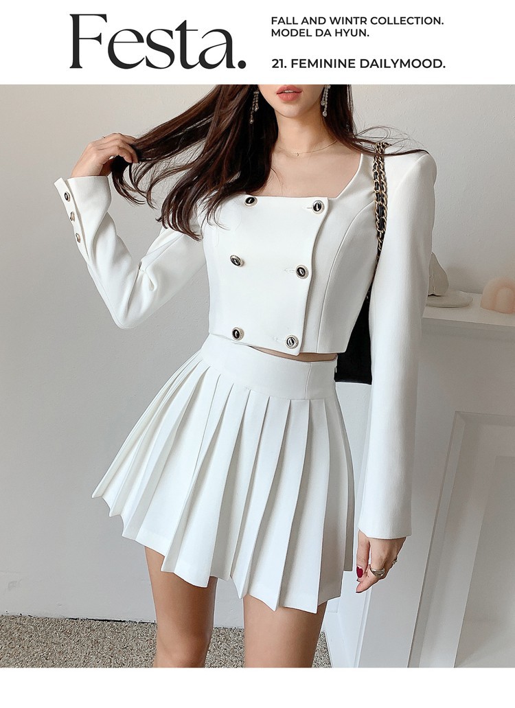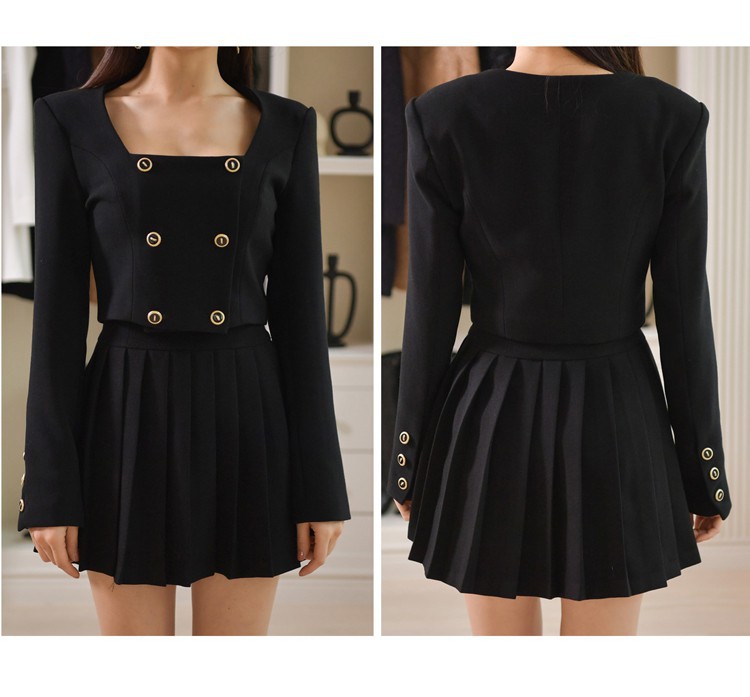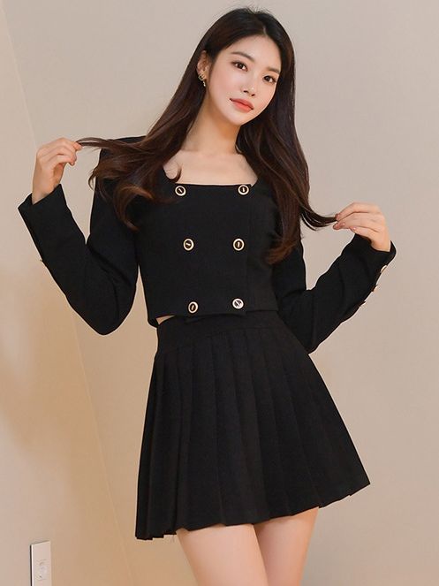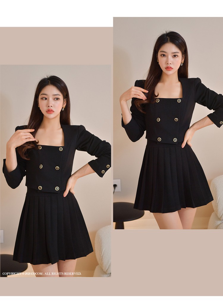 Bộ trang phục hai mảnh này gồm áo khoác kiểu dáng đôi hàng cúc và chân váy ngắn xếp ly. Thiết kế tạo điểm nhấn ở phần cổ áo và hàng cúc sáng bóng, phối cùng chân váy nữ tính, giúp tôn dáng người mặc. Chất vải mềm mại, thoải mái cho những ngày thu se lạnh. Có thể mặc nguyên bộ để đồng bộ, hoặc tách riêng từng món để phối với các trang phục khác. Phù hợp cho nhiều dịp đi làm, đi chơi hay dạo phố. | Tên sản phẩm: Áo Khoác Nữ Cả Bộ 2 Món Hàng Mùa Xuân Thu Đông Phong Cách Hàn Quốc - Thời Trang Nữ | Mã sản phẩm: B1935 - Giá: 1.030.000đ | Mã nhà sản xuất: JUOUTO-G03Hình ảnh sản phẩm