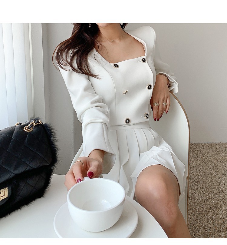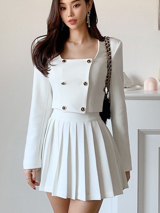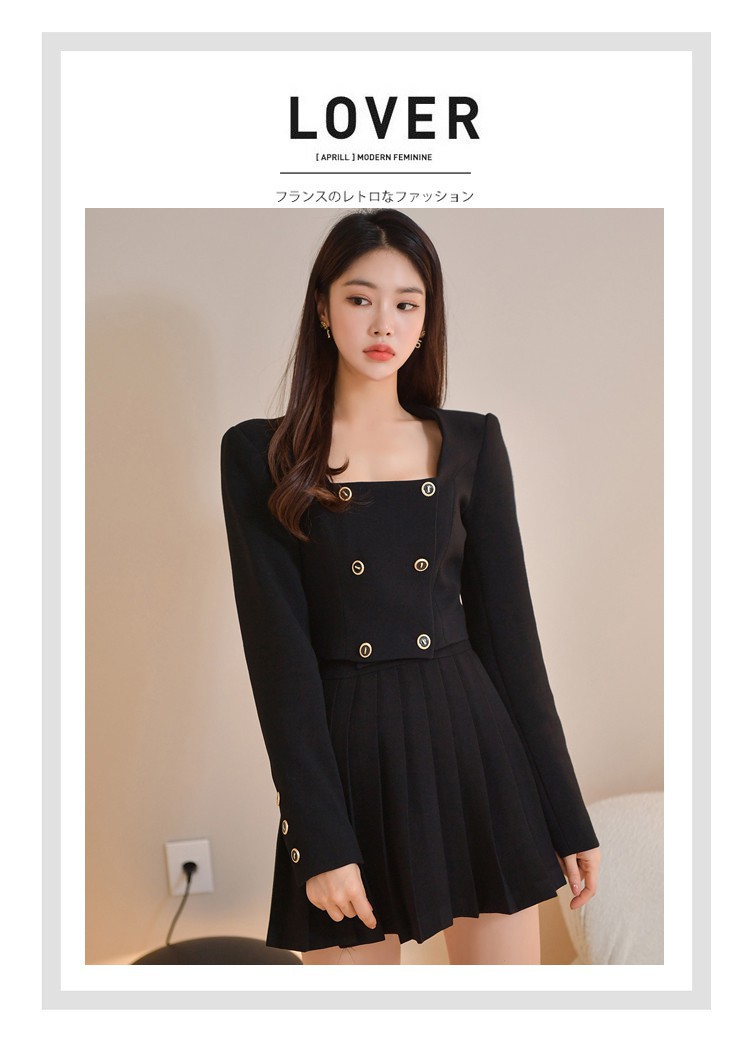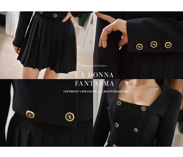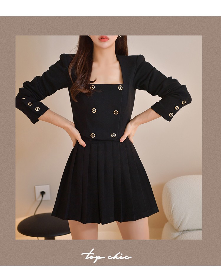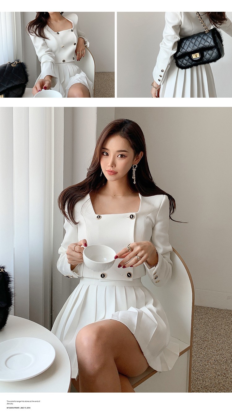 Bộ trang phục hai mảnh này gồm áo khoác kiểu dáng đôi hàng cúc và chân váy ngắn xếp ly. Thiết kế tạo điểm nhấn ở phần cổ áo và hàng cúc sáng bóng, phối cùng chân váy nữ tính, giúp tôn dáng người mặc. Chất vải mềm mại, thoải mái cho những ngày thu se lạnh. Có thể mặc nguyên bộ để đồng bộ, hoặc tách riêng từng món để phối với các trang phục khác. Phù hợp cho nhiều dịp đi làm, đi chơi hay dạo phố. | Tên sản phẩm: Áo Khoác Nữ Cả Bộ 2 Món Hàng Mùa Xuân Thu Đông Phong Cách Hàn Quốc - Thời Trang Nữ | Mã sản phẩm: B1935 - Giá: 1.030.000đ | Mã nhà sản xuất: JUOUTO-G03Hình ảnh sản phẩm