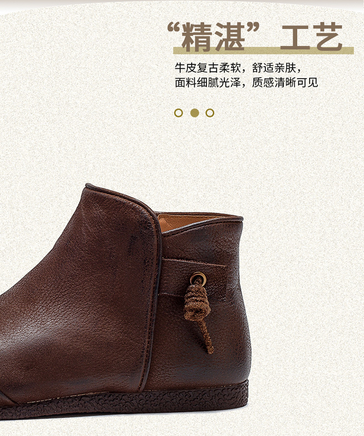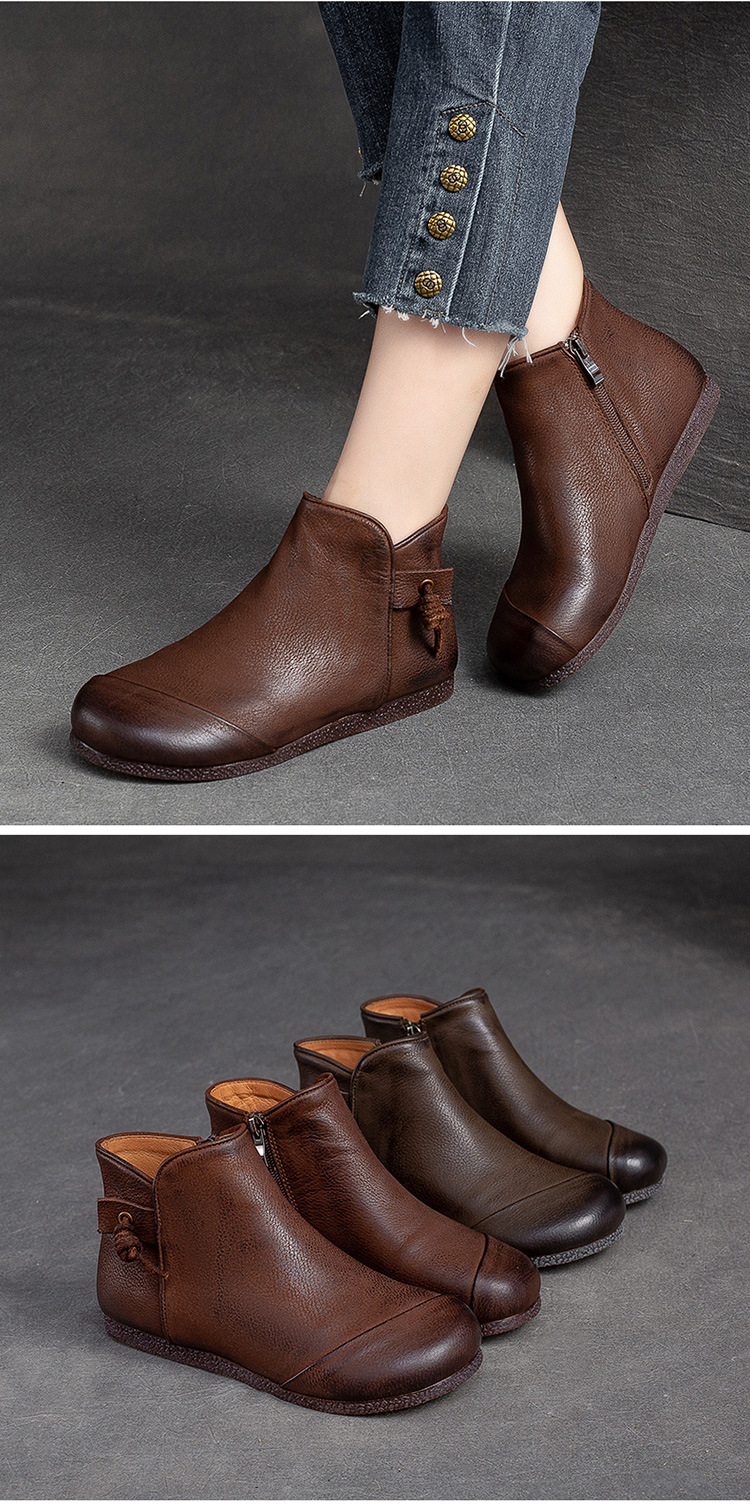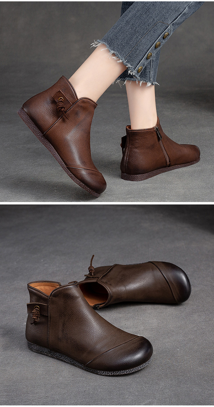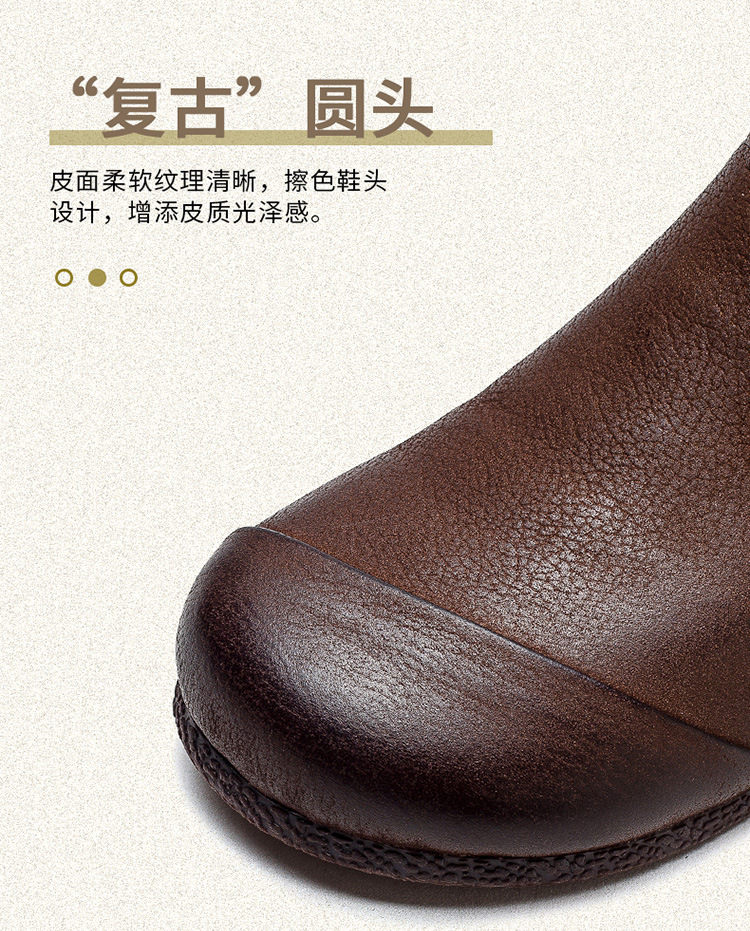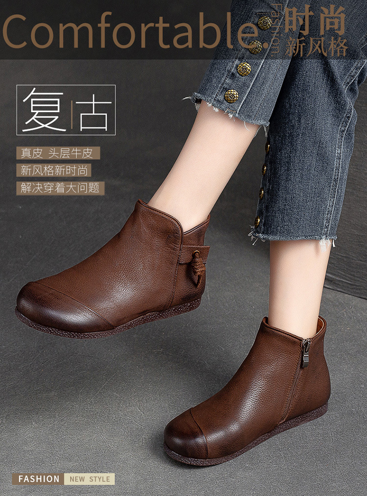 Giày bốt nữ thiết kế theo phong cách cổ điển, phù hợp mang trong tiết trời thu đông. Sản phẩm được làm từ chất da bò mềm mại, có bề mặt được xử lý tạo hiệu ứng màu độc đáo bằng phương pháp thủ công. Kiểu dáng kín ngón chân với phéc-mét kéo khoá ở bên hông giúp mang vào và tháo ra dễ dàng. Đế bằng phẳng ôm sát chân, đem lại cảm giác dễ chịu khi di chuyển cả ngày. | Tên sản phẩm: Giày Bệt Nữ Chất Liệu Da Bò Hàng Mùa Xuân Thu Đông Phục Cổ Cổ Điển - Giày Dép Nữ | Mã sản phẩm: B2040 - Giá: 1.520.000đ | Mã nhà sản xuất: SHDU-G04Hình ảnh sản phẩm