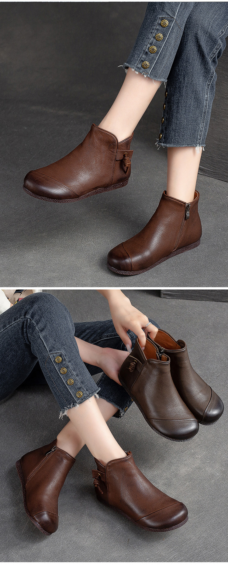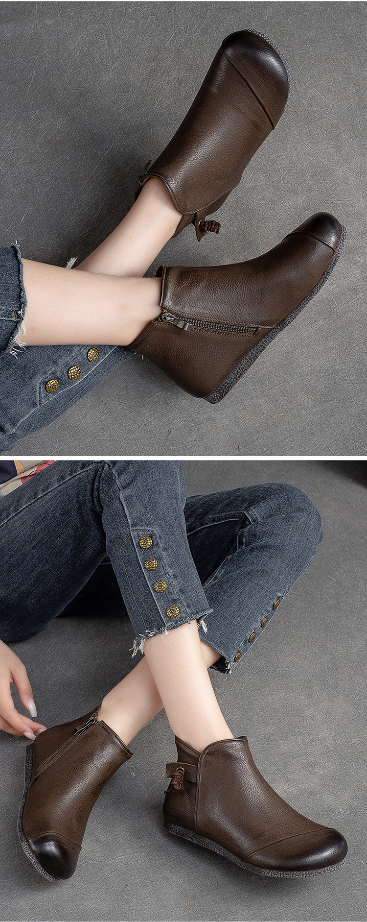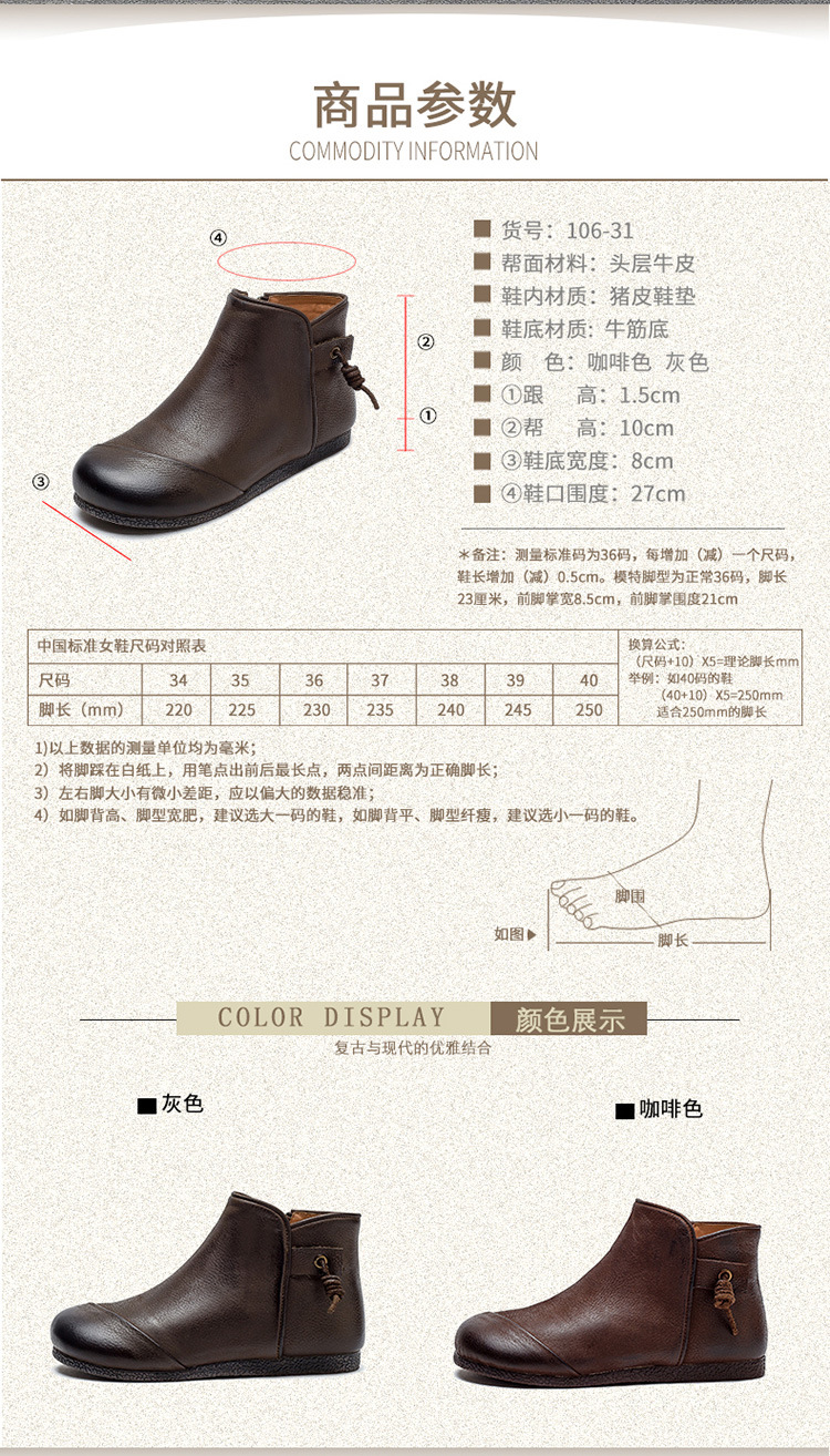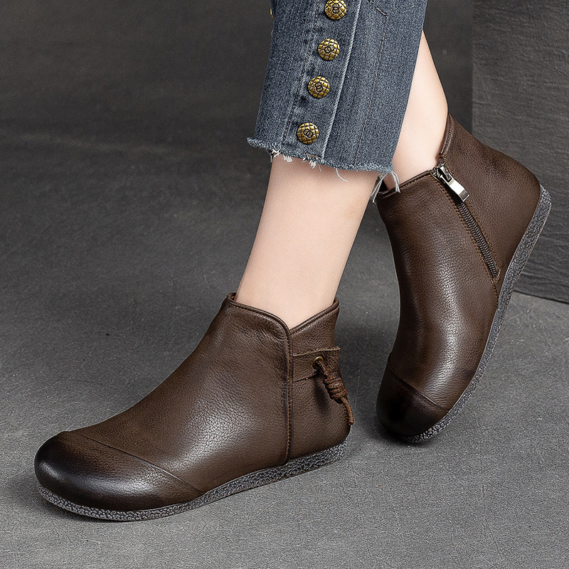 Giày bốt nữ thiết kế theo phong cách cổ điển, phù hợp mang trong tiết trời thu đông. Sản phẩm được làm từ chất da bò mềm mại, có bề mặt được xử lý tạo hiệu ứng màu độc đáo bằng phương pháp thủ công. Kiểu dáng kín ngón chân với phéc-mét kéo khoá ở bên hông giúp mang vào và tháo ra dễ dàng. Đế bằng phẳng ôm sát chân, đem lại cảm giác dễ chịu khi di chuyển cả ngày. | Tên sản phẩm: Giày Bệt Nữ Chất Liệu Da Bò Hàng Mùa Xuân Thu Đông Phục Cổ Cổ Điển - Giày Dép Nữ | Mã sản phẩm: B2040 - Giá: 1.520.000đ | Mã nhà sản xuất: SHDU-G04Hình ảnh sản phẩm