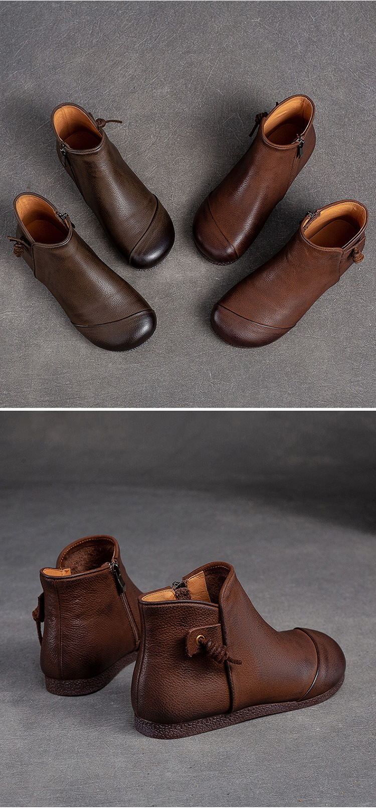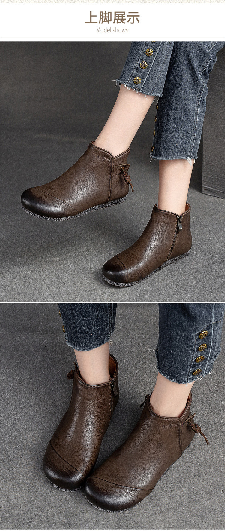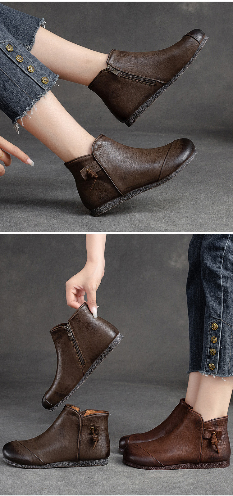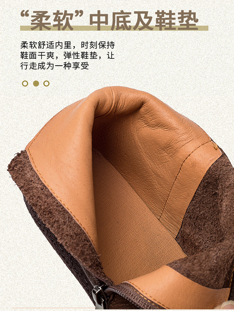 Giày bốt nữ thiết kế theo phong cách cổ điển, phù hợp mang trong tiết trời thu đông. Sản phẩm được làm từ chất da bò mềm mại, có bề mặt được xử lý tạo hiệu ứng màu độc đáo bằng phương pháp thủ công. Kiểu dáng kín ngón chân với phéc-mét kéo khoá ở bên hông giúp mang vào và tháo ra dễ dàng. Đế bằng phẳng ôm sát chân, đem lại cảm giác dễ chịu khi di chuyển cả ngày. | Tên sản phẩm: Giày Bệt Nữ Chất Liệu Da Bò Hàng Mùa Xuân Thu Đông Phục Cổ Cổ Điển - Giày Dép Nữ | Mã sản phẩm: B2040 - Giá: 1.520.000đ | Mã nhà sản xuất: SHDU-G04Hình ảnh sản phẩm