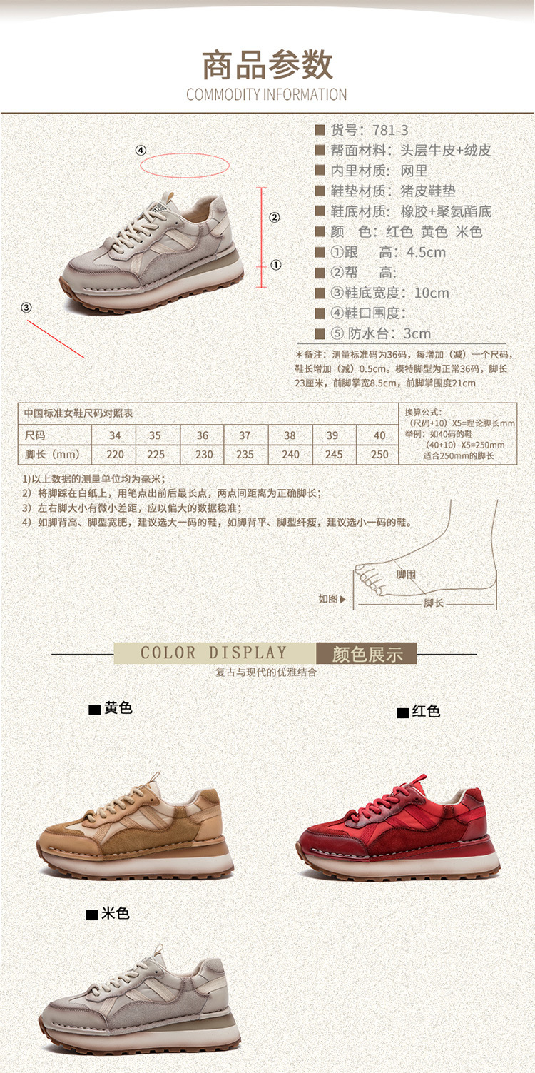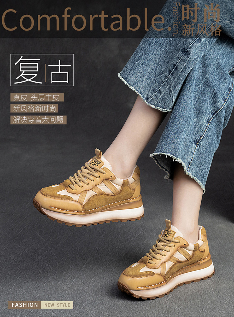 Giày thể thao nữ thiết kế nhiều màu kết hợp, phong cách cổ điển nhẹ nhàng. Sản phẩm có đế dày vừa phải, tạo cảm giác thoải mái khi di chuyển cả ngày. Kiểu dáng năng động, dễ phối hợp với nhiều trang phục như quần jeans hay váy ngắn. Bạn có thể mang giày này cho các sinh hoạt hằng ngày, dạo phố hay gặp gỡ bạn bè. Chất liệu nhẹ, co giãn tốt giúp bàn chân dễ chịu. | Tên sản phẩm: Giày Thể Thao Tăng Chiều Cao Nữ Đế Cao Hàng Mùa Xuân Thu Đông Phục Cổ Cổ Điển - Giày Dép Nữ | Mã sản phẩm: B2290 - Giá: 2.580.000đ | Mã nhà sản xuất: SHNTEZ-G06Hình ảnh sản phẩm