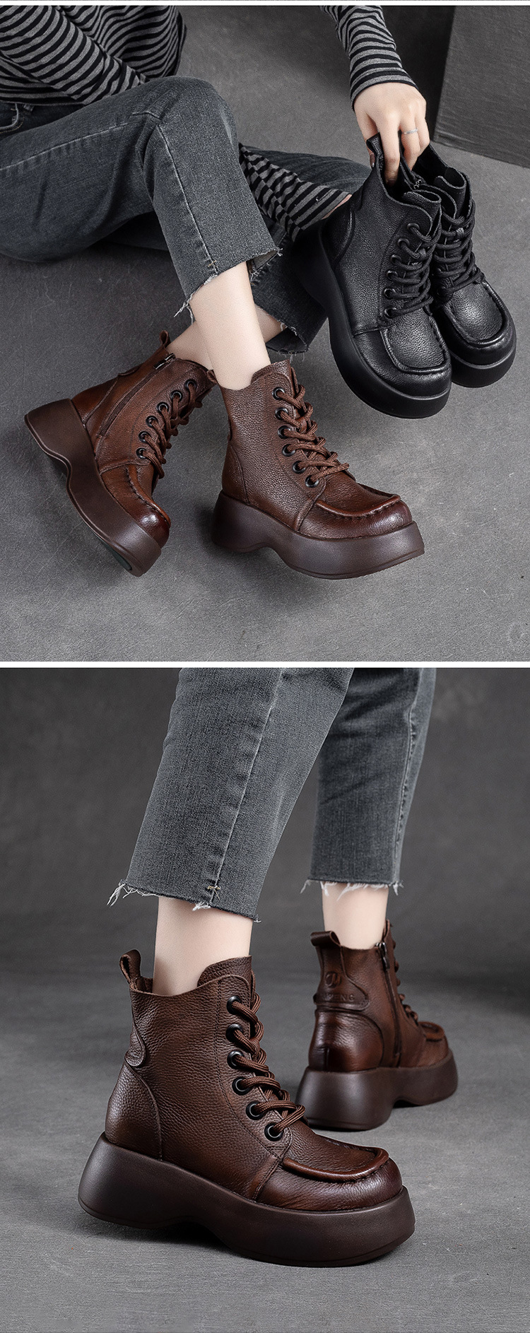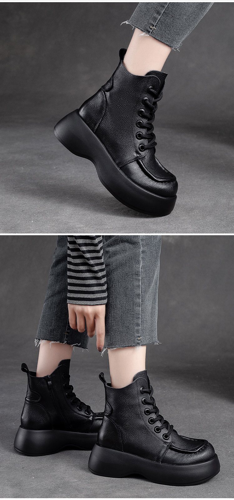 Đôi bốt cổ thấp dành cho nữ, được làm từ chất liệu da bò mềm mại, mang phong cách cổ điển nhẹ nhàng. Đế dày vừa phải giúp tăng chiều cao một cách tinh tế, phù hợp cho thời tiết mát mẻ. Thiết kế có khóa kéo bên hông giúp mang vào và tháo ra dễ dàng. Kiểu dáng đơn giản, dễ phối hợp với nhiều loại trang phục như quần jeans hay váy. Bạn có thể sử dụng hằng ngày để tạo nên vẻ ngoài tự tin và thoải mái. | Tên sản phẩm: Giày Boot Cổ Thấp Nữ Chất Liệu Da Bò Tăng Chiều Cao Đế Cao Hàng Mùa Xuân Thu Đông Phục Cổ Cổ Điển - Giày Dép Nữ | Mã sản phẩm: B2479 - Giá: 2.670.000đ | Mã nhà sản xuất: SHNTEZ-G06Hình ảnh sản phẩm
