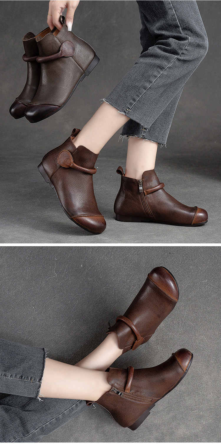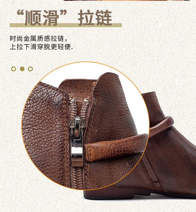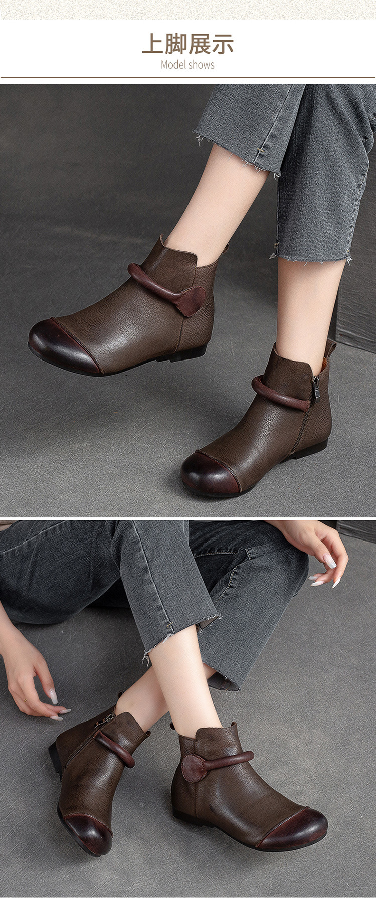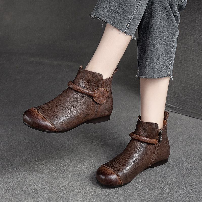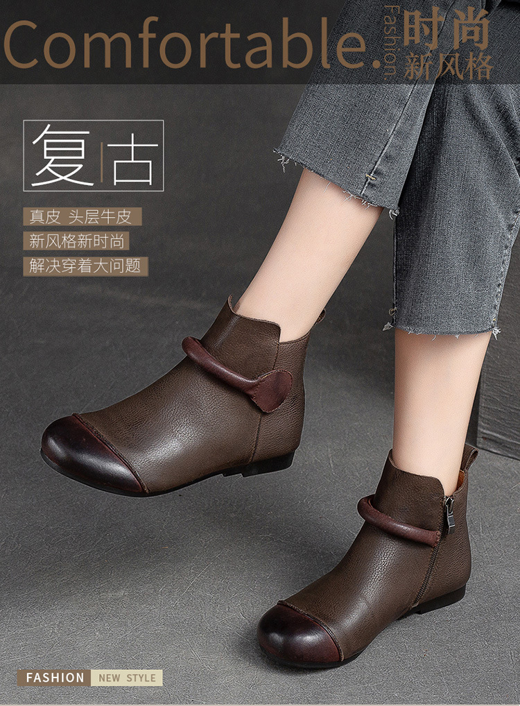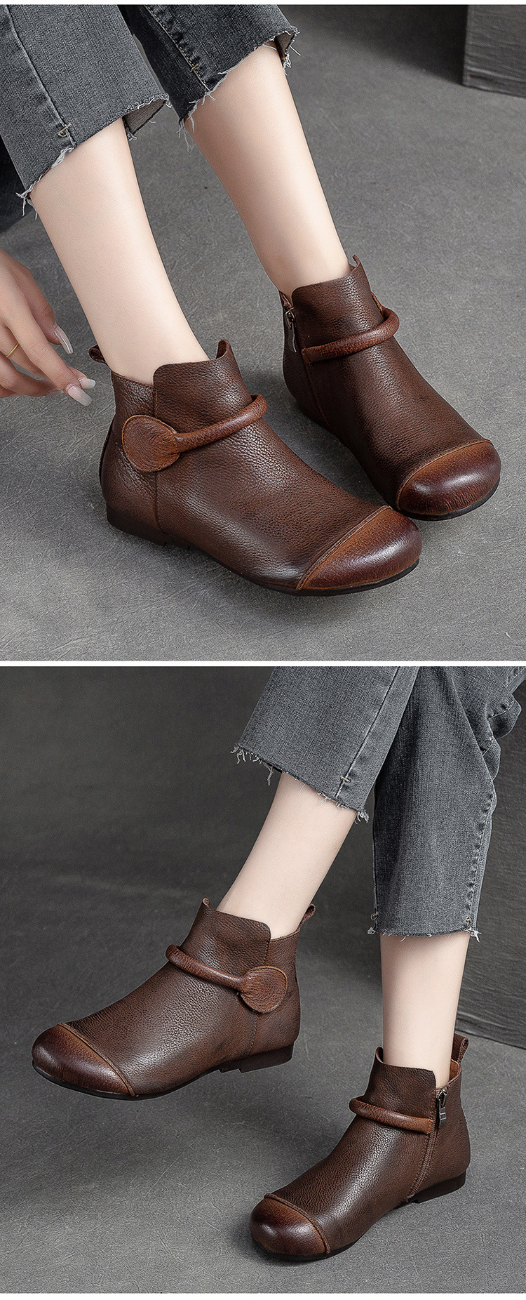 Đôi bốt nữ thiết kế theo phong cách cổ điển, phù hợp mang trong tiết trời thu đông. Sản phẩm được làm từ chất liệu da thật bền đẹp, phần thân bốt có khóa kéo bên hông giúp việc mang vào tháo ra dễ dàng. Kiểu dáng đơn giản với mũi giày tròn và đế bằng, tạo cảm giác thoải mái khi di chuyển cả ngày. Đây là mẫu giày dễ kết hợp với nhiều trang phục khác nhau. | Tên sản phẩm: Giày Bệt Nữ Chất Liệu Da Bò Mũi Tròn Hàng Mùa Xuân Thu Đông Phục Cổ Cổ Điển - Giày Dép Nữ | Mã sản phẩm: B2638 - Giá: 2.480.000đ | Mã nhà sản xuất: SHNTEZ-G05Hình ảnh sản phẩm
