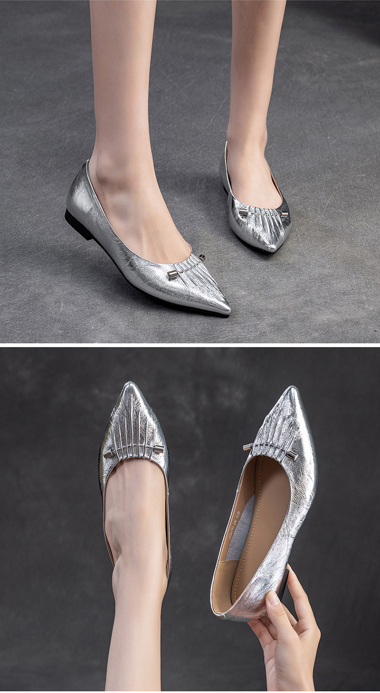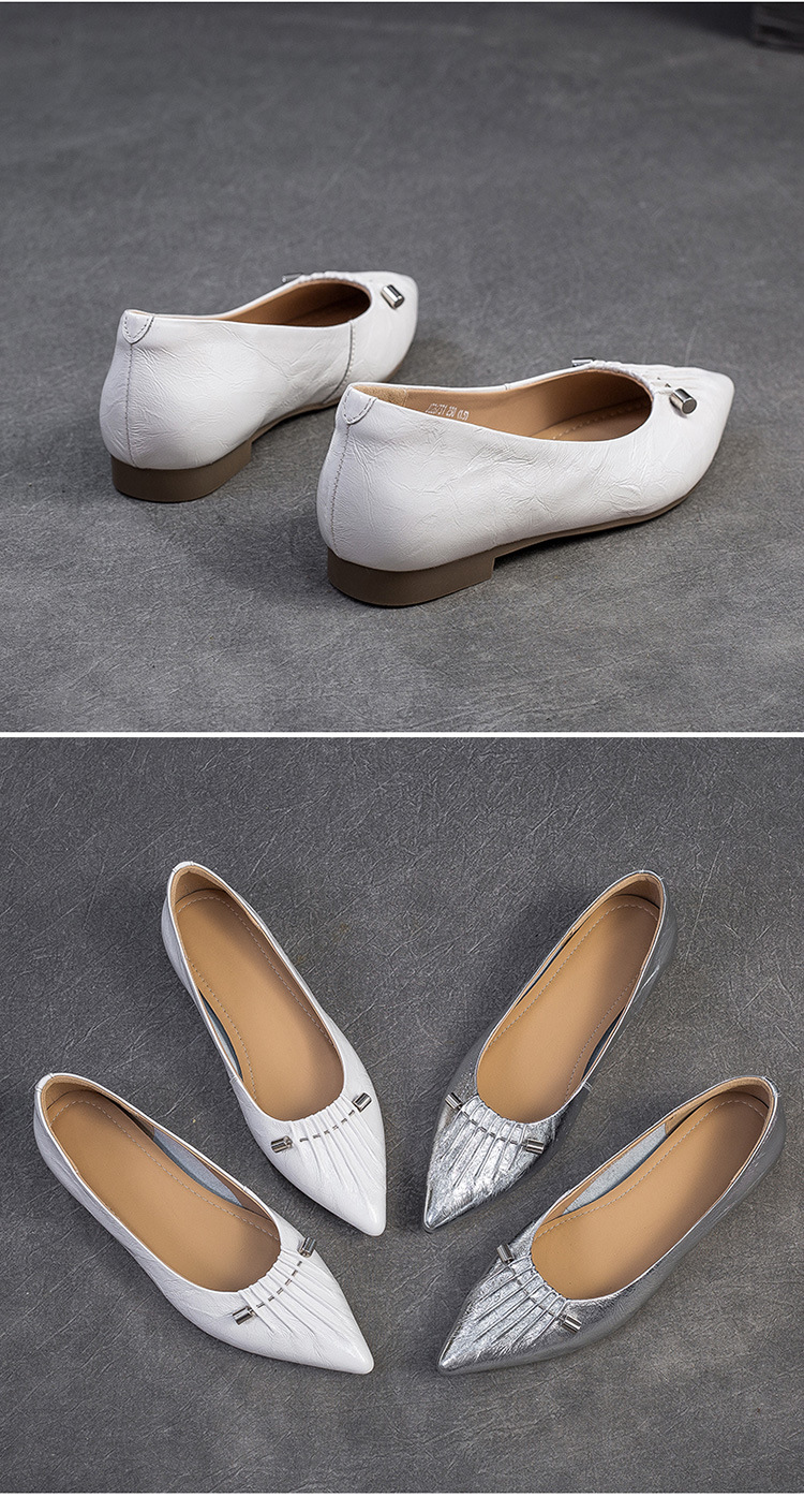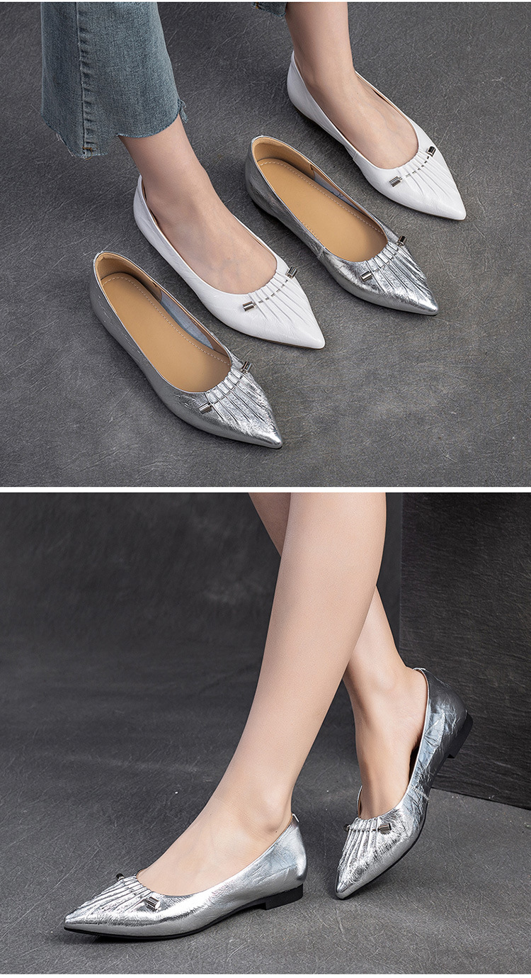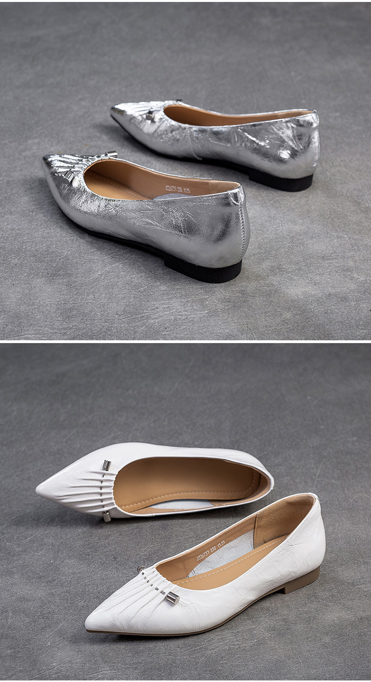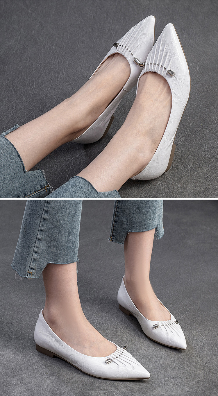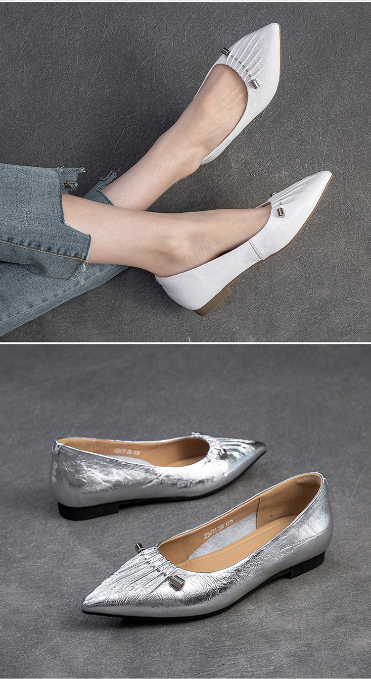 Giày da bò mũi nhọn phong cách Hàn Quốc, thiết kế cổ thấp tôn dáng. Sản phẩm làm từ chất liệu da bò tự nhiên, bề mặt mịn màng và có độ đàn hồi tốt. Đế giày bằng phẳng ôm sát chân, tạo cảm giác dễ chịu khi di chuyển cả ngày. Kiểu dáng mũi nhọn thanh lịch, phối cùng dây da mảnh tăng thêm nét duyên dáng. Dễ dàng phối với nhiều loại trang phục như quần âu, váy liền hay jeans. Sử dụng hàng ngày và vệ sinh bằng khăn mềm ẩm. | Tên sản phẩm: Giày Bệt Nữ Chất Liệu Da Bò Mũi Nhọn Hàng Mùa Xuân Thu Đông Phong Cách Hàn Quốc - Giày Dép Nữ | Mã sản phẩm: B2802 - Giá: 1.900.000đ | Mã nhà sản xuất: SHNTEZ-G05Hình ảnh sản phẩm
