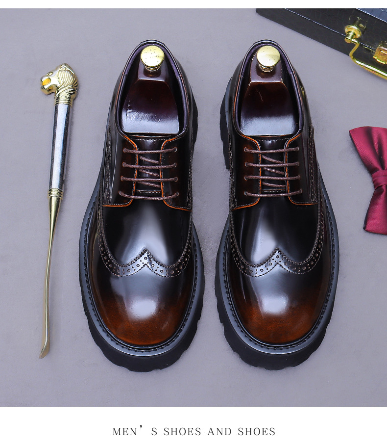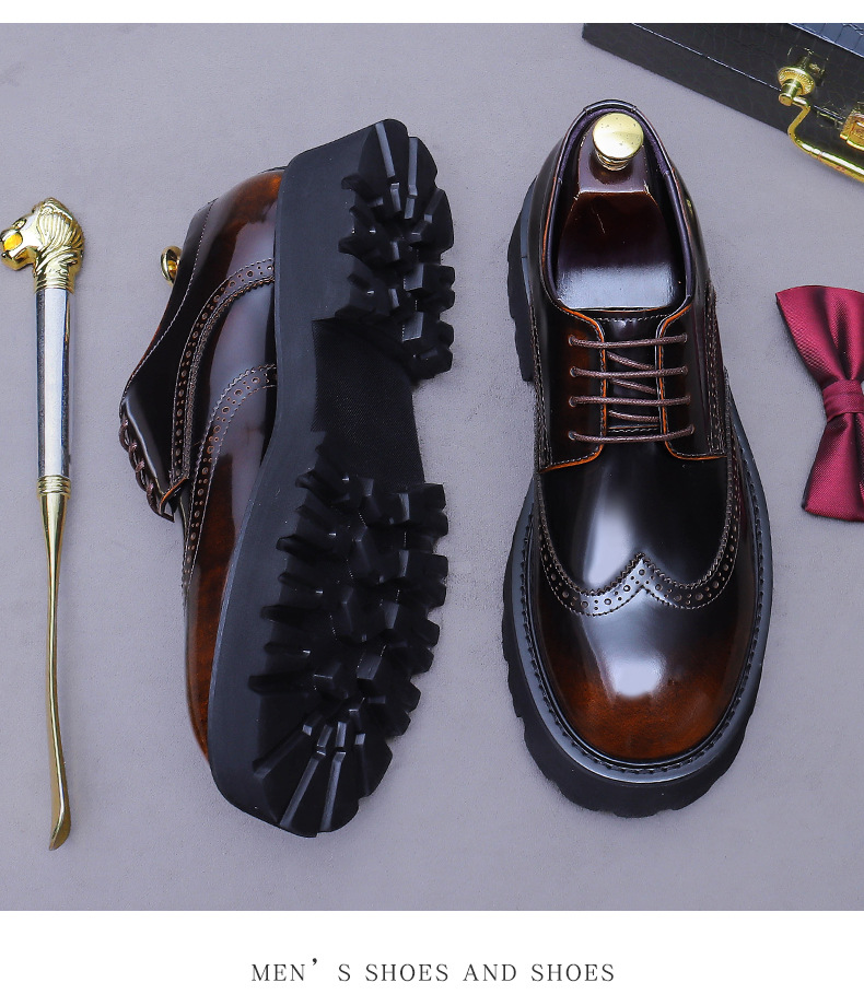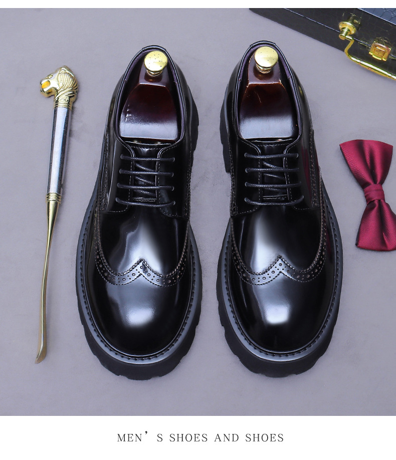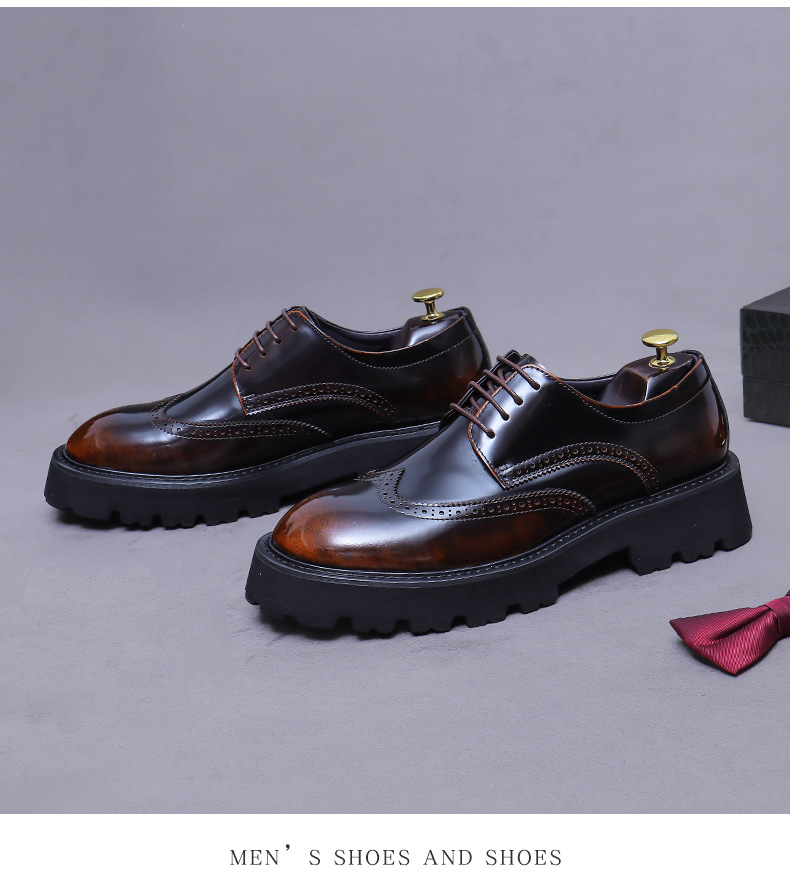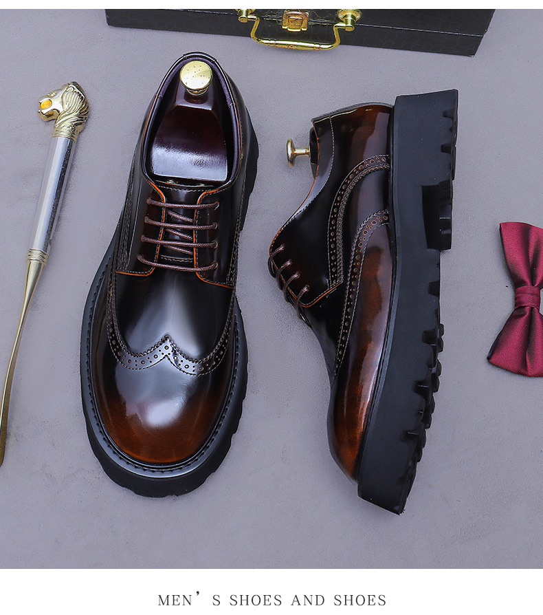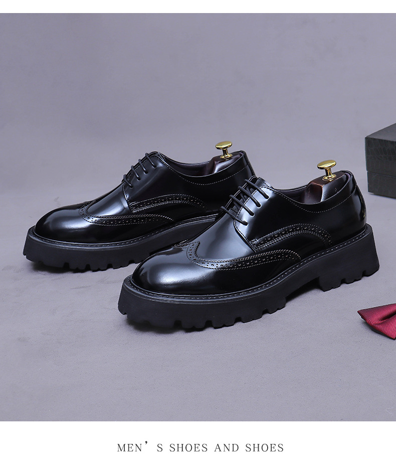 Đôi giày da thật này có phần đế được thiết kế tăng thêm chiều cao một cách tinh tế. Kiểu dáng mang phong cách Anh Quốc cổ điển với các đường chạm khắc tinh xảo trên thân giày. Mặt giày làm từ da bò tự nhiên, có độ bóng đẹp mắt. Đầu giày dáng tròn cùng thiết kế cổ điển giúp dễ dàng phối hợp với nhiều loại trang phục. Sử dụng phù hợp cho các dịp đi làm hoặc gặp mặt. | Tên sản phẩm: Giày Da Nam Chất Liệu Da Bò Mũi Tròn Họa Tiết Hoa Đế Cao - Giày Dép Nam | Mã sản phẩm: B2808 - Giá: 2.450.000đ | Mã nhà sản xuất: ASTYCH-G05Hình ảnh sản phẩm