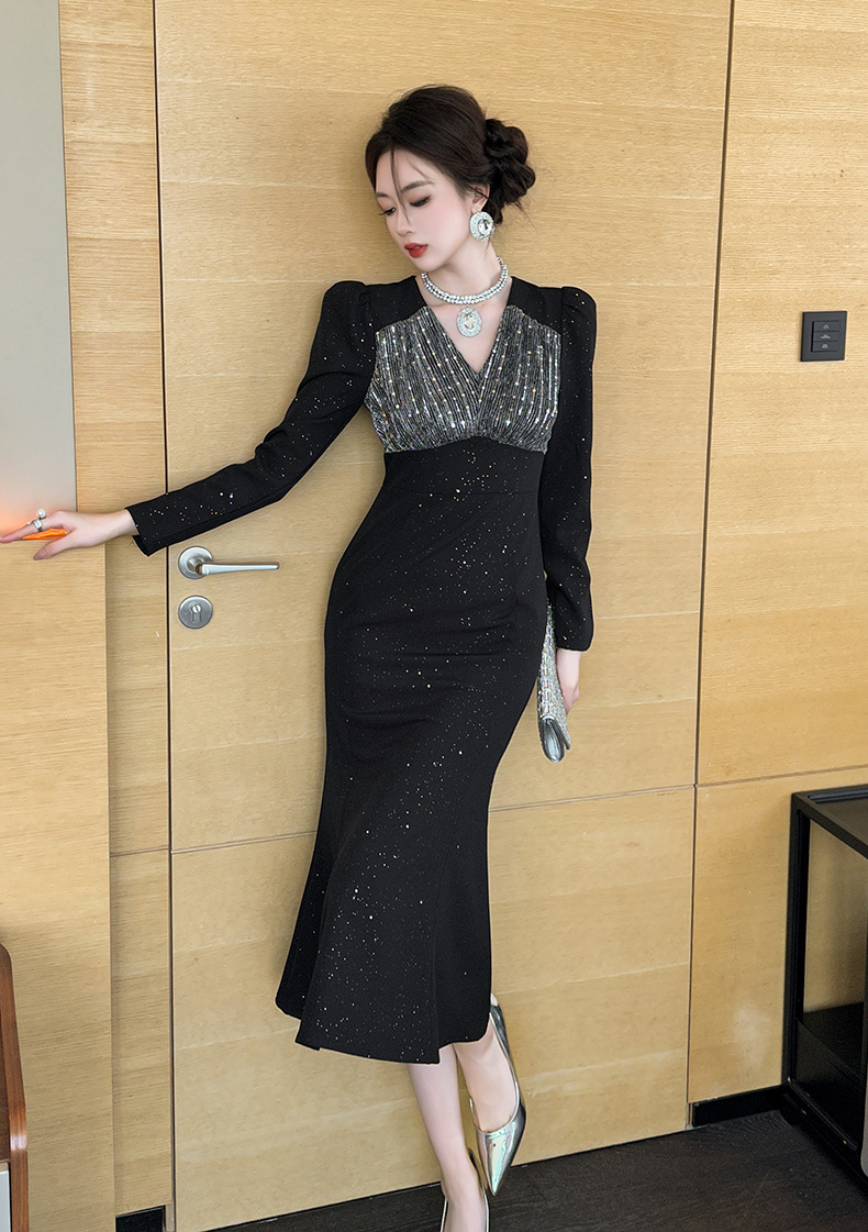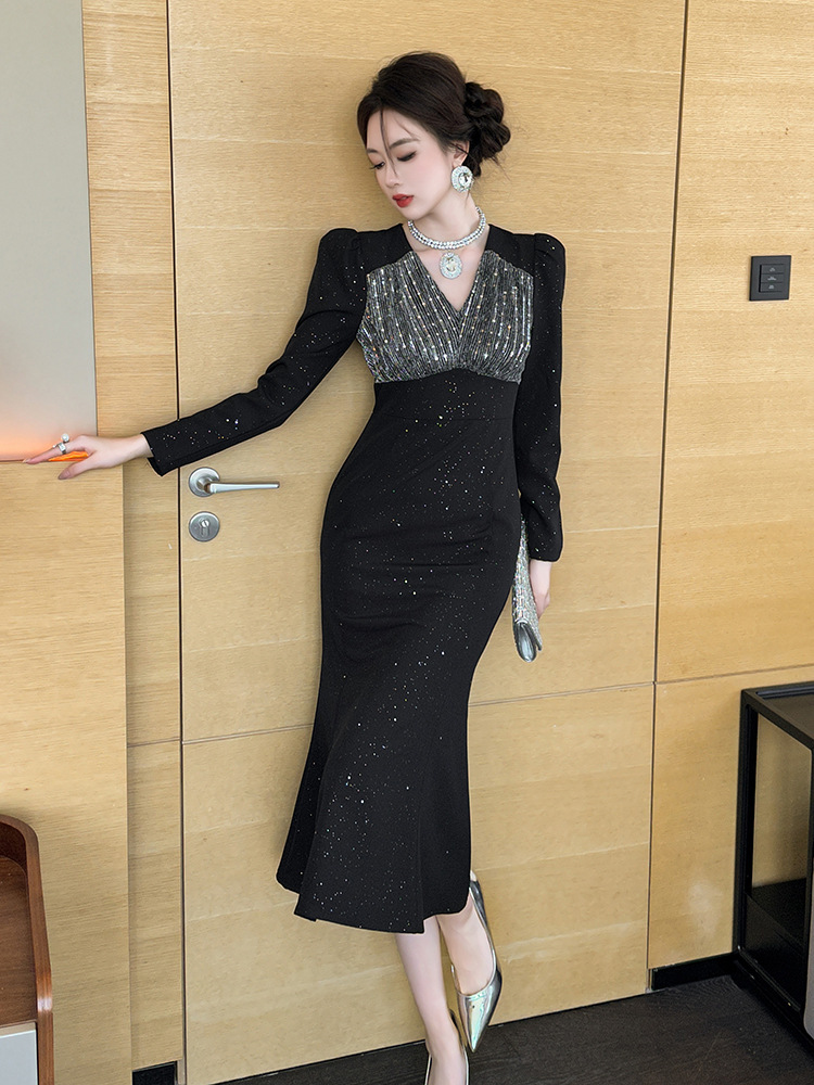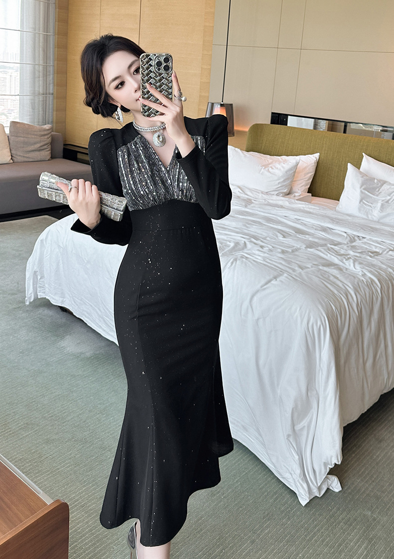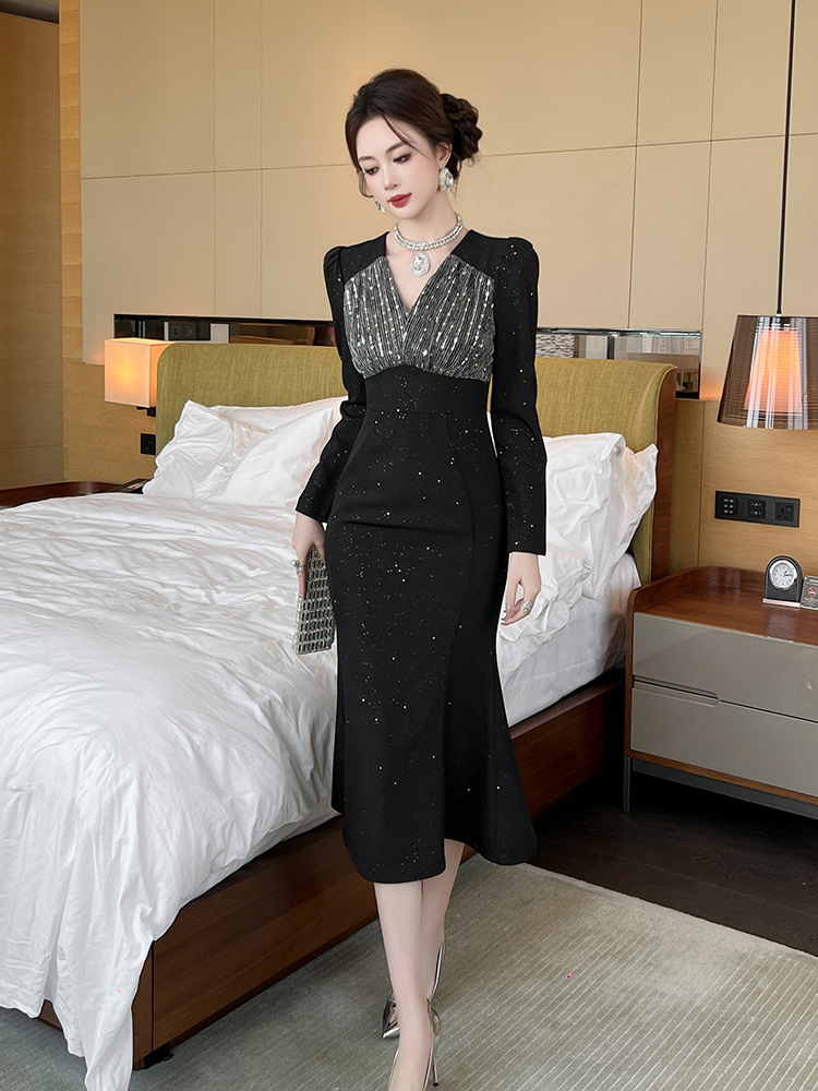 Chiếc đầm ôm sát dáng người, điểm nhấn là phần chân váy xòe duyên dáng như đuôi cá. Cổ chữ V tôn vẻ thanh lịch, kết hợp cùng những mảnh ánh sáng lấp lánh tinh tế trên nền vải. Kiểu dáng phù hợp cho những buổi gặp mặt hoặc dạo phố vào tiết trời mát mẻ. Mặc cùng giày gót thấp và túi xách nhỏ để tạo nên vẻ ngoại hình hài hòa. | Tên sản phẩm: Váy Đầm Liền Thân Nữ Dáng Ôm Kiểu Đuôi Cá Cổ Chữ V Hàng Mùa Xuân Thu Đông - Thời Trang Nữ | Mã sản phẩm: B2862 - Giá: 1.090.000đ | Mã nhà sản xuất: CHDG-G03Hình ảnh sản phẩm