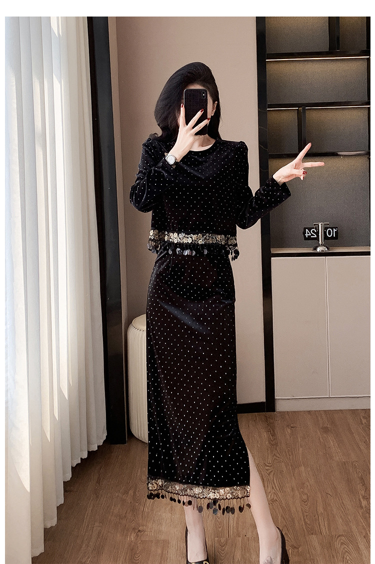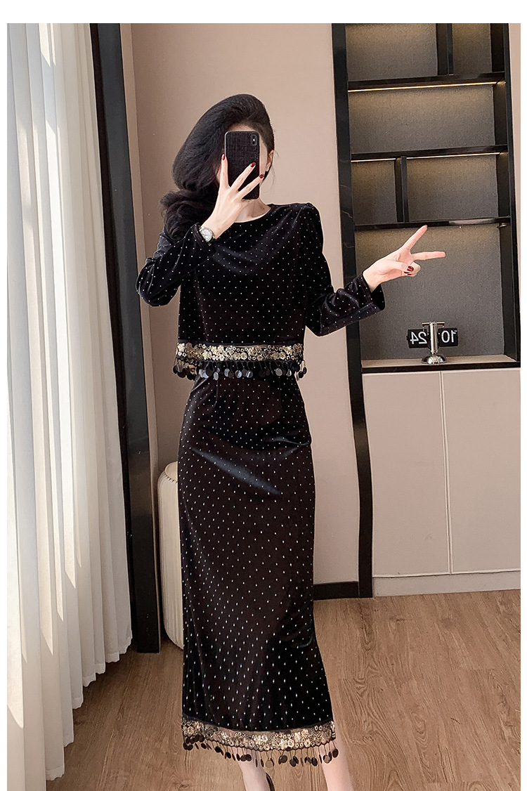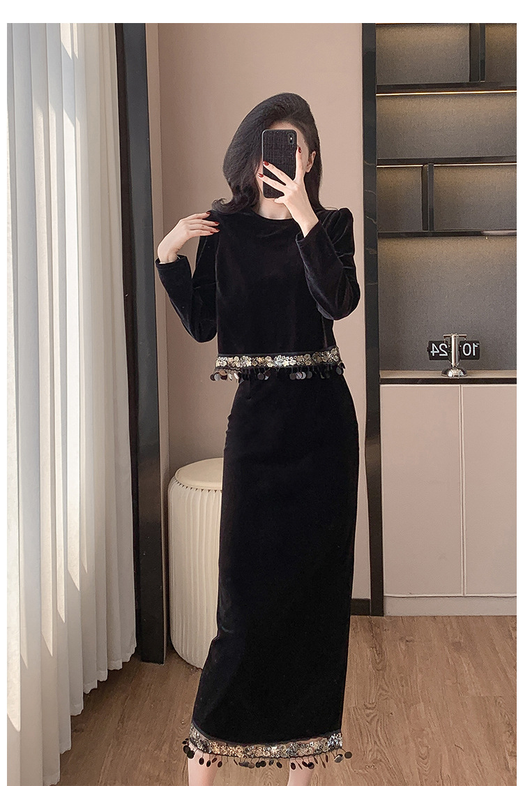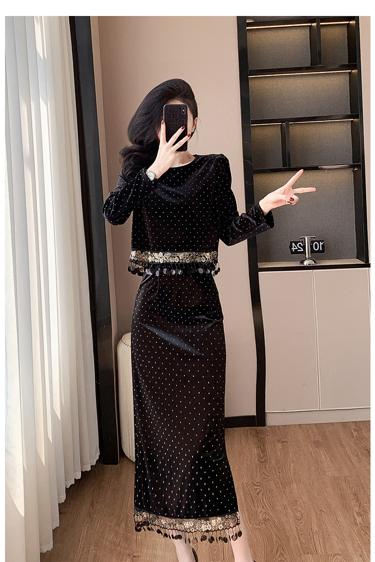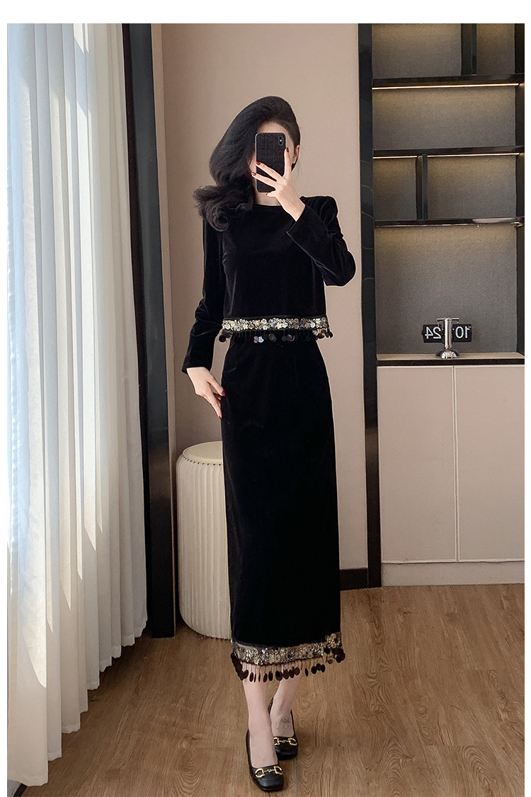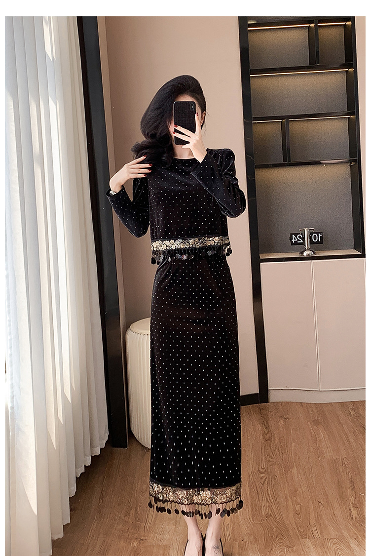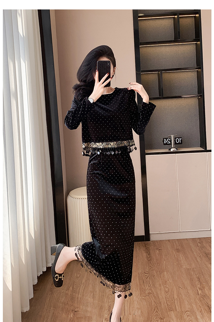 Bộ trang phục hai mảnh này gồm áo dài tay và chân váy, mang đến vẻ đẹp thanh lịch. Chất vải mềm mại, có ánh lụa nhẹ tạo cảm giác ấm áp, phù hợp cho tiết trời mát mẻ. Kiểu dáng ôn hòa, dễ dàng phối đồ. Bạn có thể mặc nguyên bộ để đi làm hoặc dạo phố, cũng có thể tách riêng từng món để kết hợp với các trang phục khác, rất thuận tiện và linh hoạt. | Tên sản phẩm: Đồ Bộ Nữ Dài Tay Cả Bộ 2 Món Hàng Mùa Xuân Thu Đông - Thời Trang Nữ | Mã sản phẩm: B3316 - Giá: 920.000đ | Mã nhà sản xuất: ZHOUT-G03Hình ảnh sản phẩm