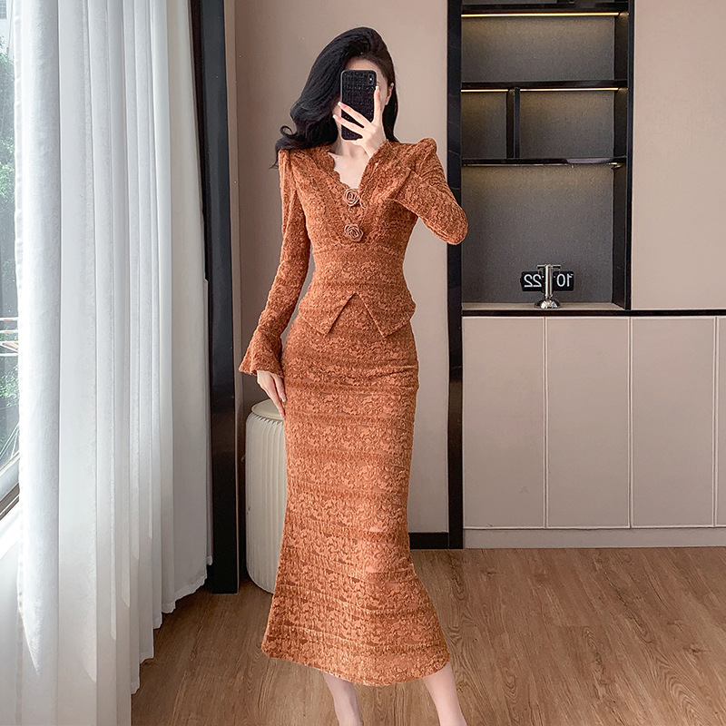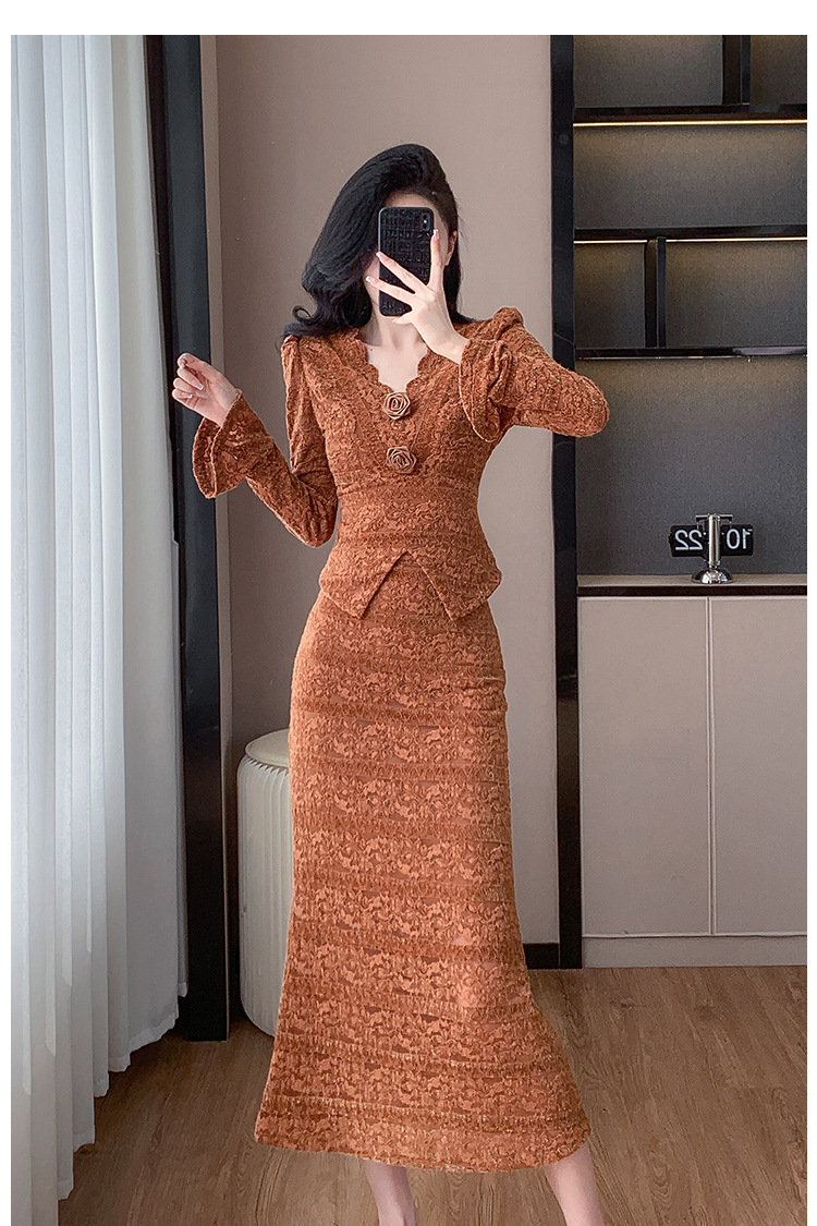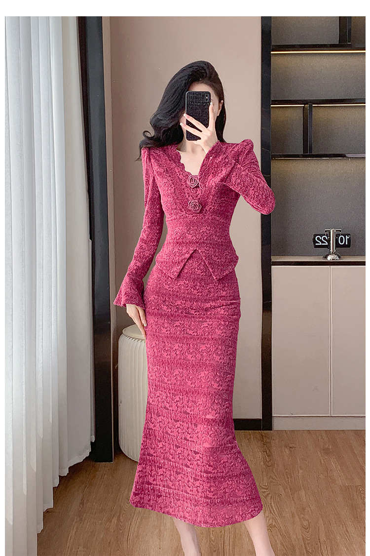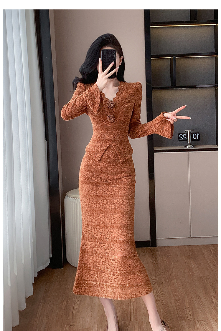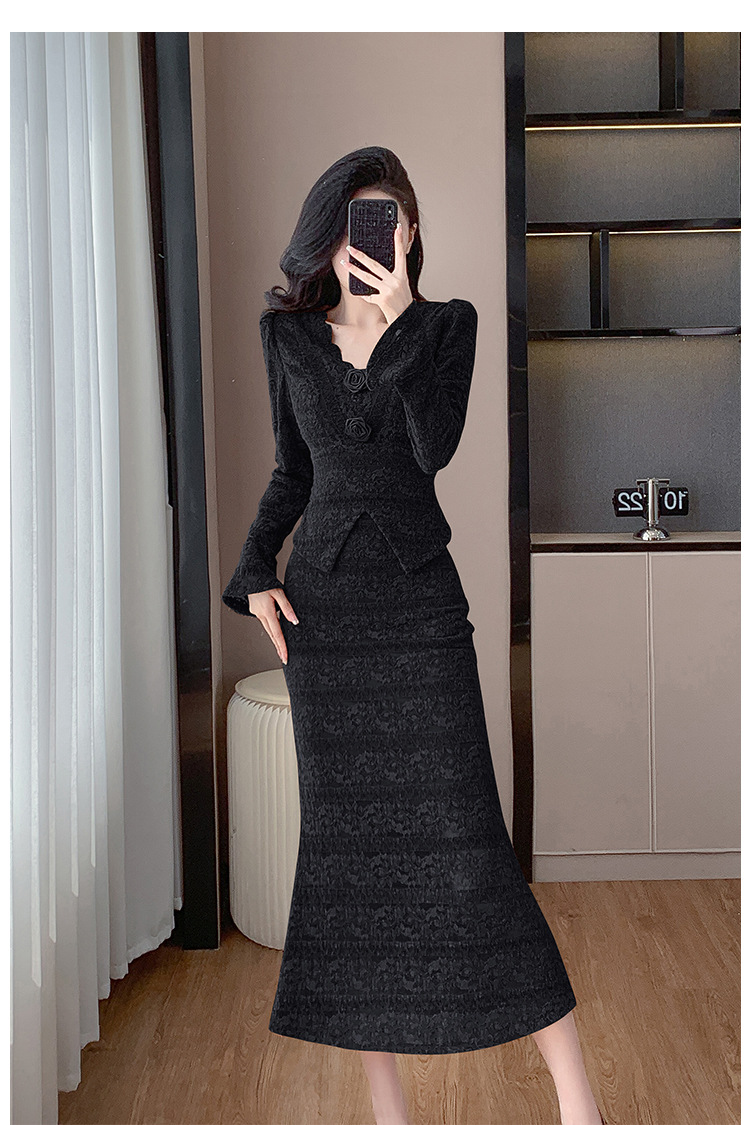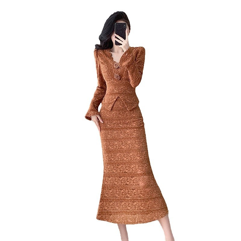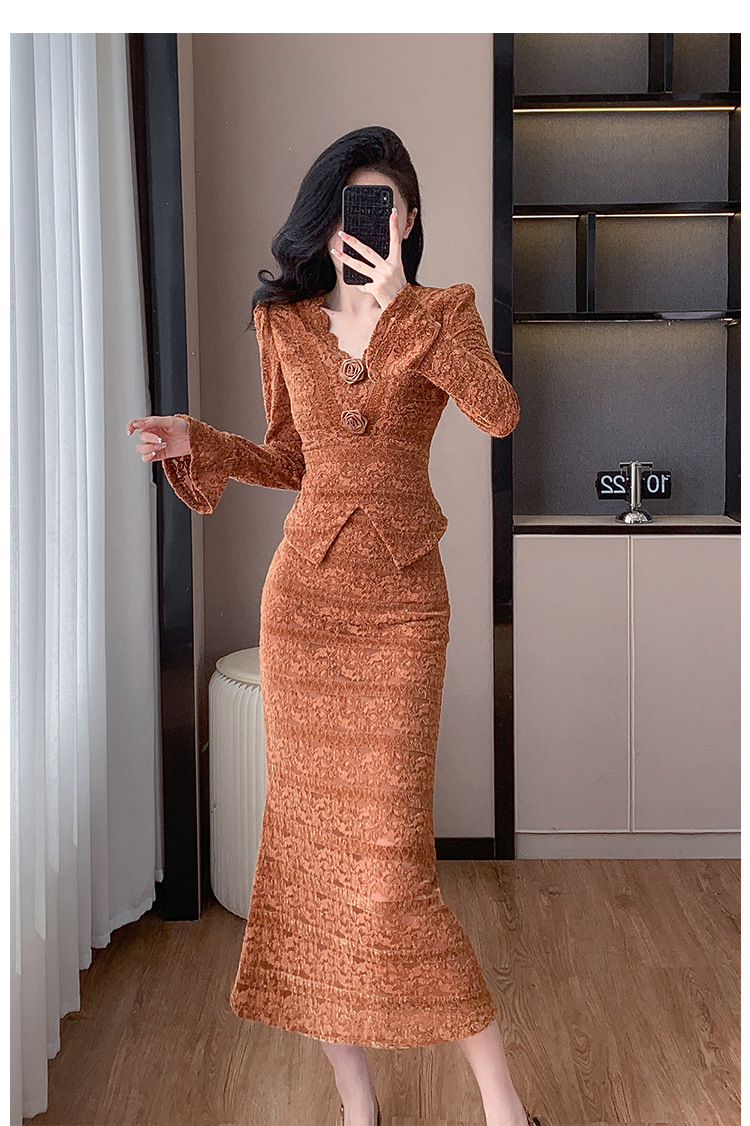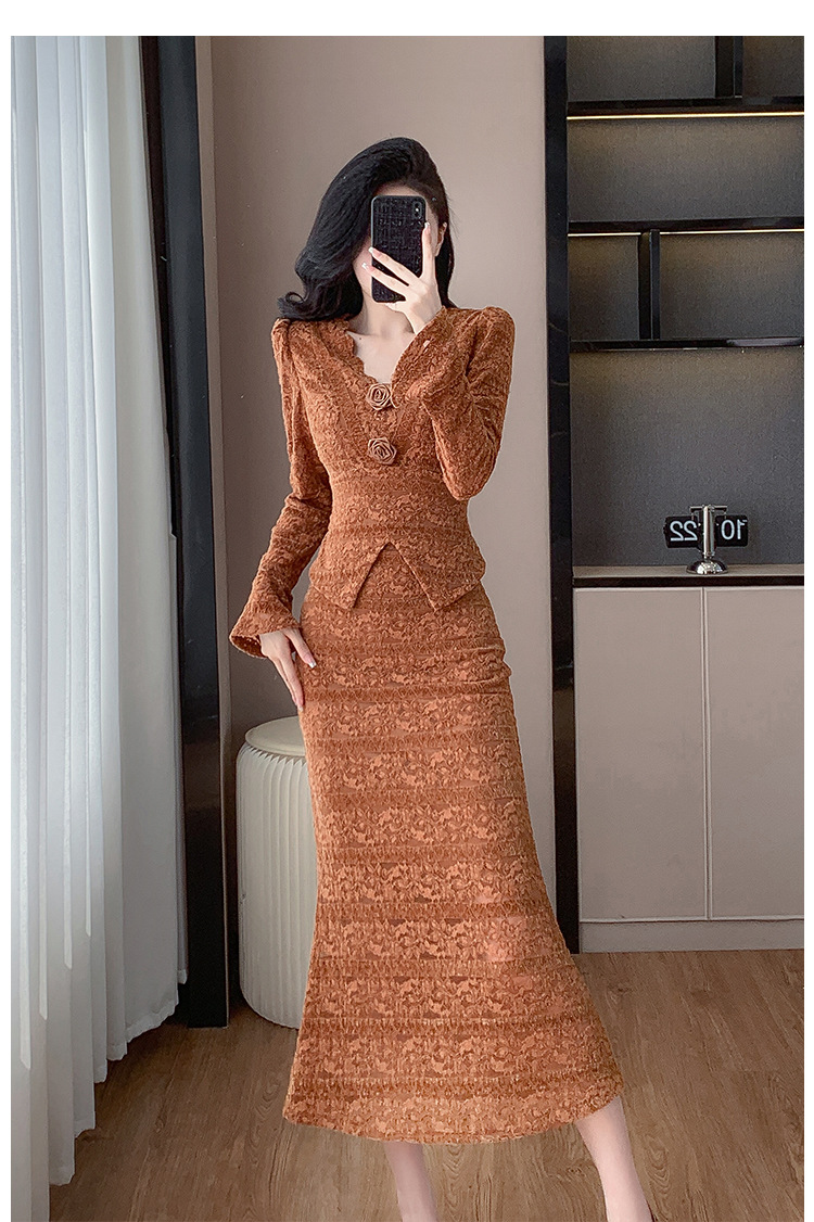 Bộ trang phục hai mảnh này gồm áo và chân váy, mang đến vẻ đẹp dịu dàng và nữ tính. Áo có phần cổ khoét sâu tạo điểm nhấn, kết hợp với tay áo được thiết kế xòe nhẹ như cánh sen, tạo cảm giác mềm mại và uyển chuyển. Chân váy ôn nhẹ giúp tôn lên dáng vẻ thanh thoát. Bộ trang phục rất dễ phối đồ và có thể mặc đi làm, đi chơi hoặc dự những buổi gặp mặt thân mật. | Tên sản phẩm: Áo Sơ Mi Nữ Cả Bộ 2 Món Cổ Chữ V Hàng Mùa Xuân Thu Đông - Thời Trang Nữ | Mã sản phẩm: B3317 - Giá: 1.050.000đ | Mã nhà sản xuất: ZHOUT-G03Hình ảnh sản phẩm