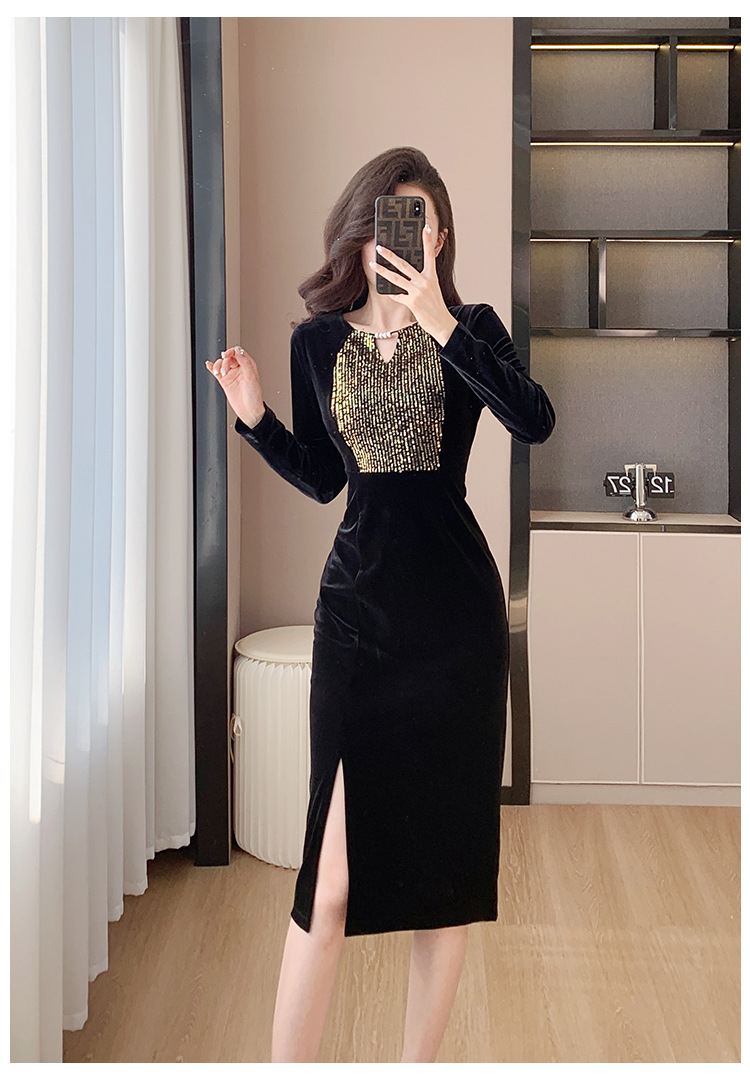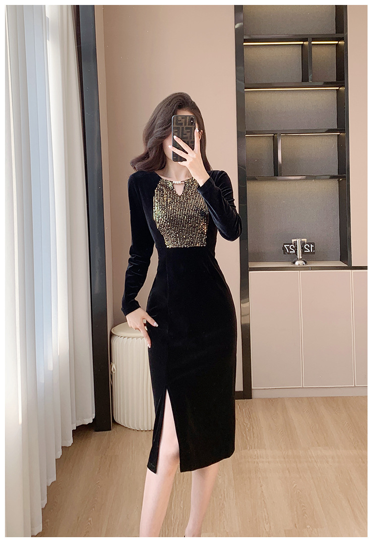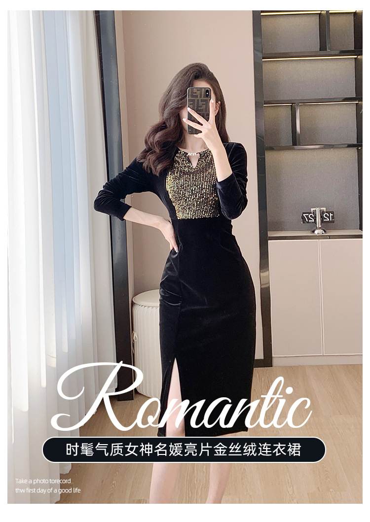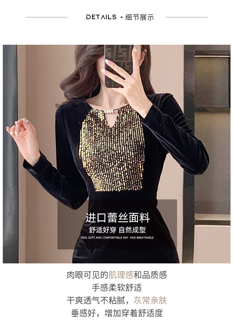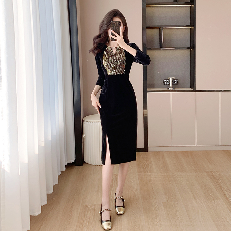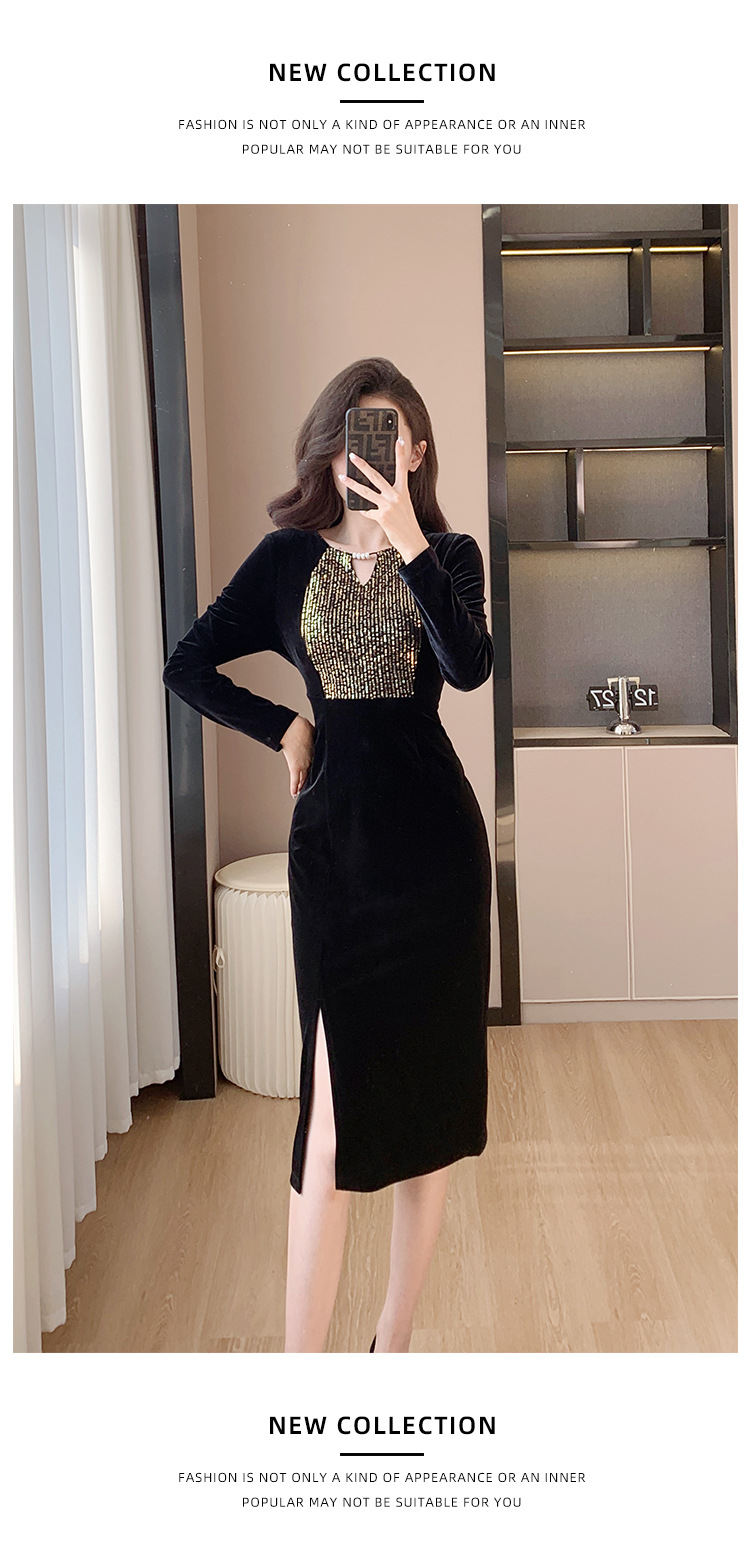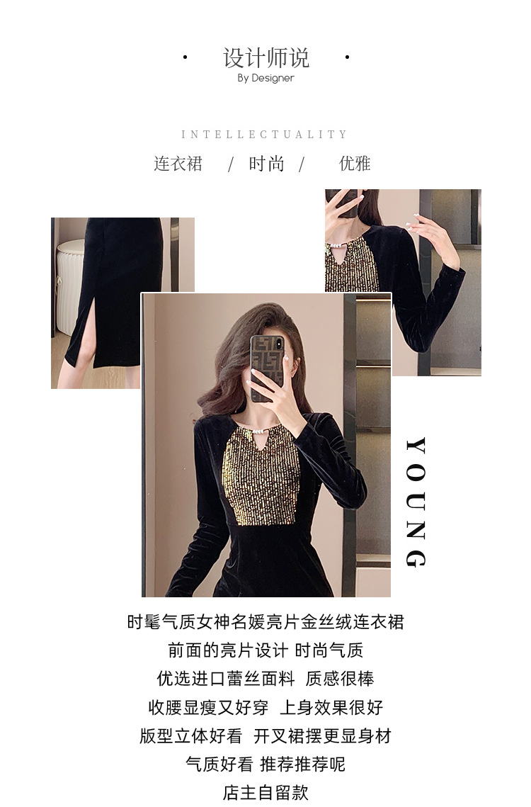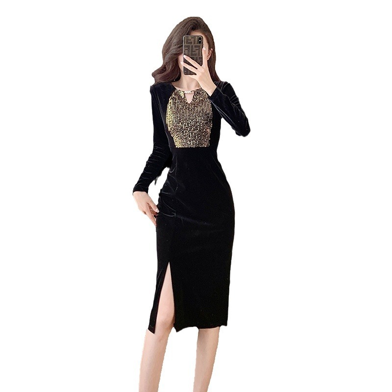 Đầm dáng suông ôm sát cơ thể, điểm nhấn là chất vải mềm mại lấp lánh ánh kim nhẹ. Thiết kế cổ điển với tay dài và phần thân trên ôm nhẹ nhàng, phù hợp cho các buổi họp mặt hoặc dạo phố vào mùa lạnh. Sản phẩm dễ dàng phối cùng giày cao gót hoặc boots. Mặc cùng áo khoác mỏng khi trời se lạnh để giữ ấm và tạo vẻ ngoài thanh lịch. | Tên sản phẩm: Váy Đầm Liền Thân Nữ Dáng Ôm Hàng Mùa Xuân Thu Đông - Thời Trang Nữ | Mã sản phẩm: B3326 - Giá: 780.000đ | Mã nhà sản xuất: ZHOUT-G02Hình ảnh sản phẩm