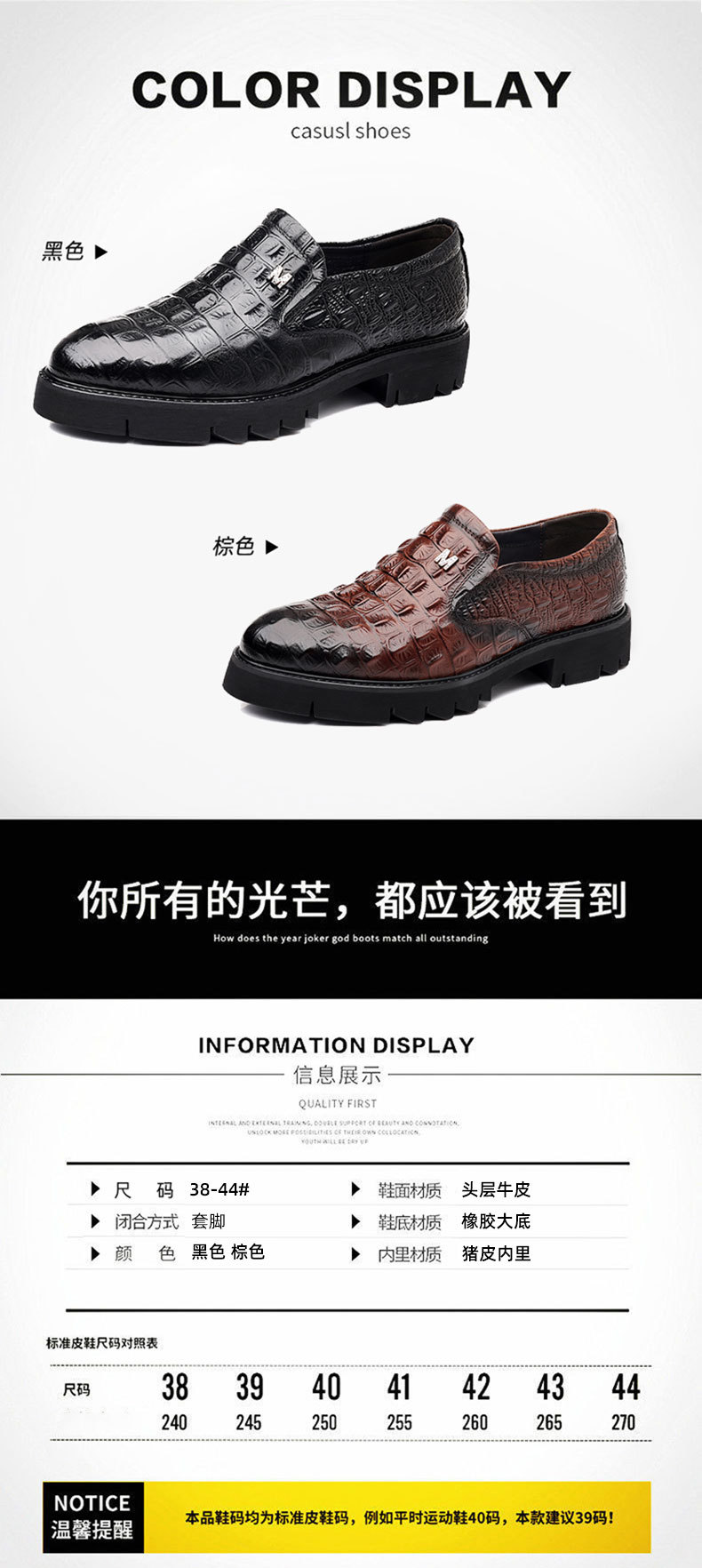 Giày da nam thiết kế kiểu châu Âu, phù hợp cho mùa thu. Dáng giày kết hợp giữa đi làm và đi chơi, mang phong cách lịch sự nhẹ nhàng. Sản phẩm làm từ chất liệu da thật, ôm chân êm ái. Kiểu giày buộc dây hoặc không dây tiện lợi, đế giày được thiết kế có độ dày vừa phải giúp nâng dáng người đi. Dễ dàng phối cùng nhiều loại trang phục như quần âu, quần kaki để tạo vẻ ngoài chỉn chu. | Tên sản phẩm: Giày Da Nam Chất Liệu Da Bò Đế Cao Hàng Mùa Xuân Thu Đông - Giày Dép Nam | Mã sản phẩm: B3360 - Giá: 940.000đ | Mã nhà sản xuất: WEDS-G03Hình ảnh sản phẩm