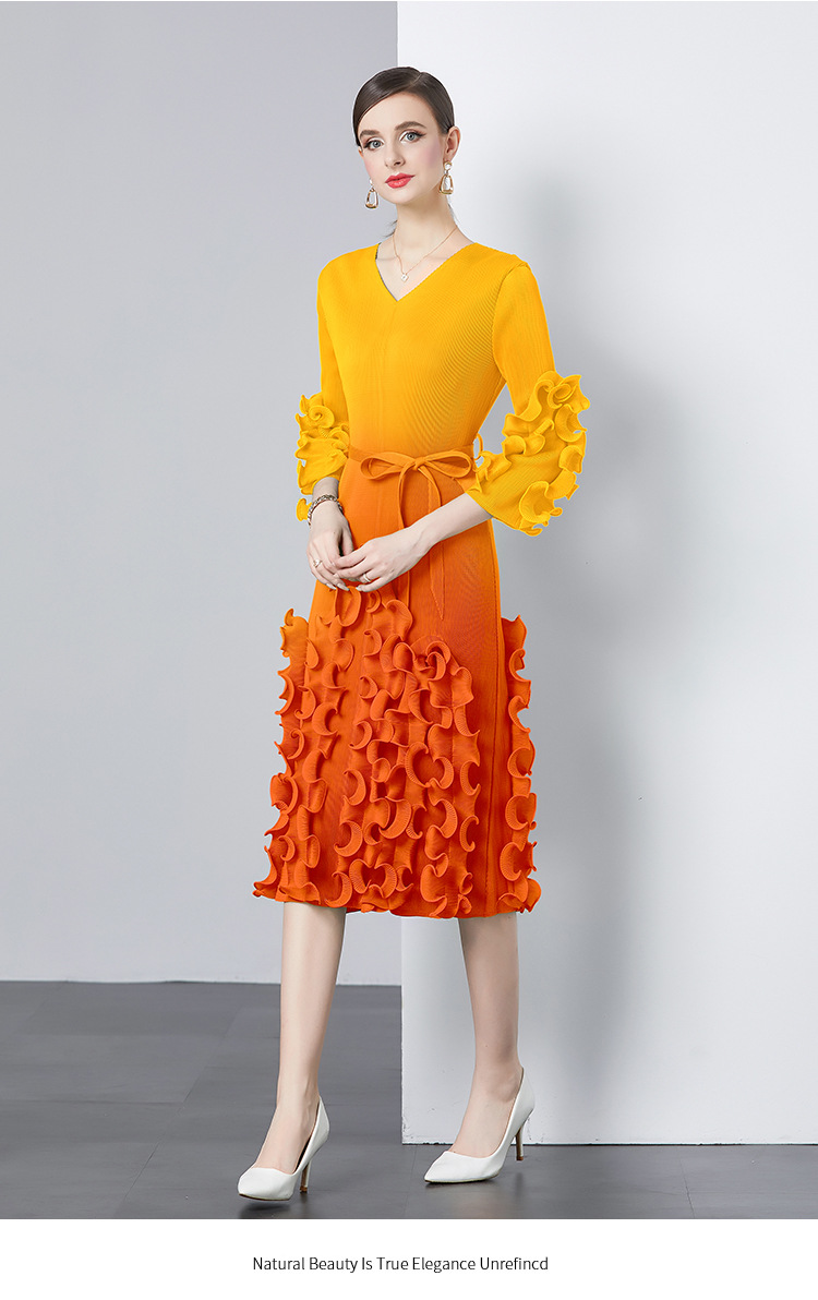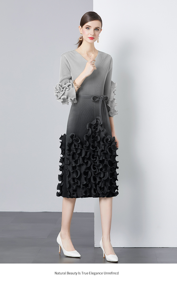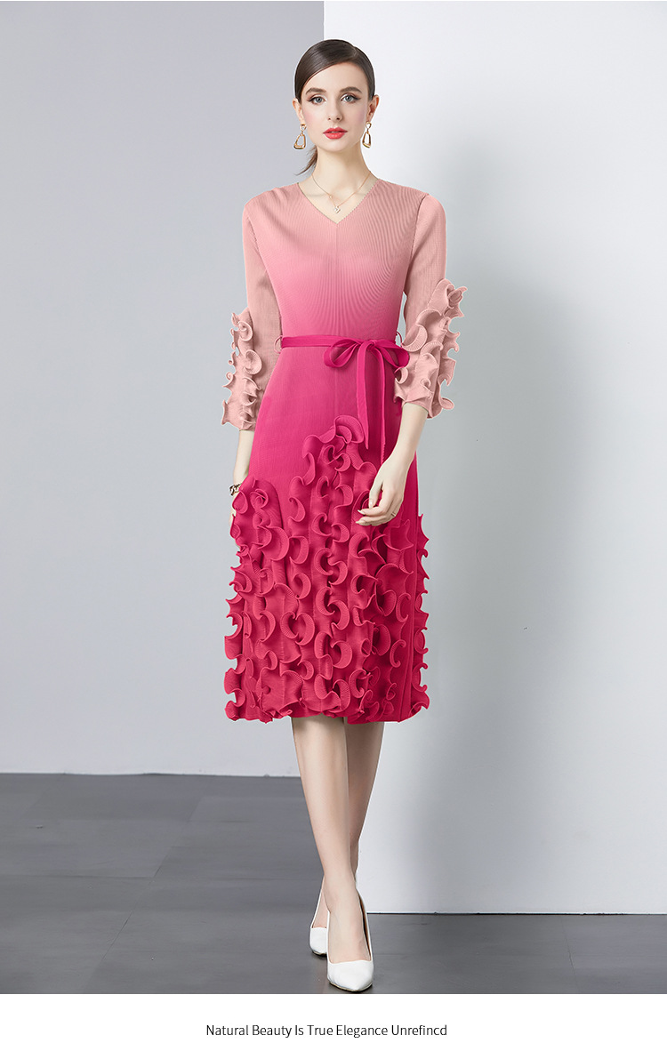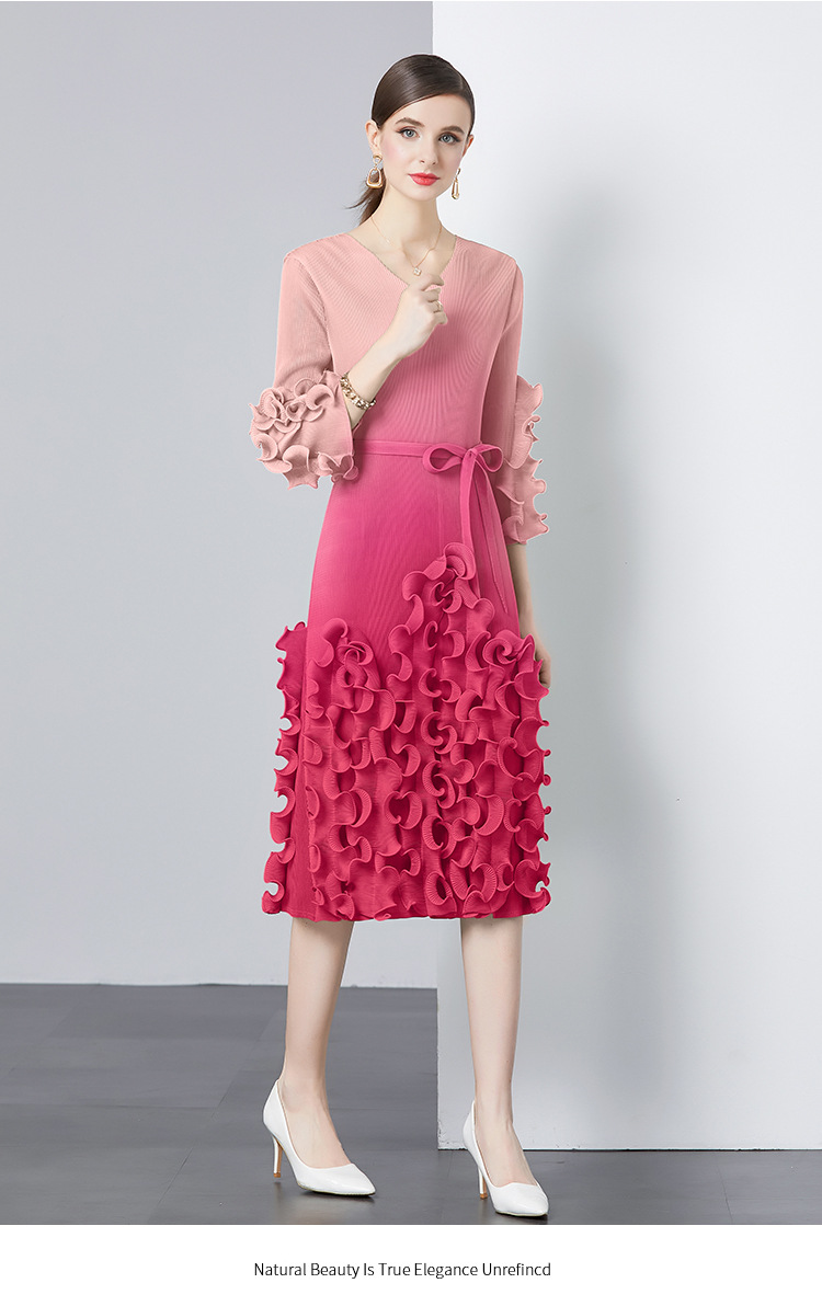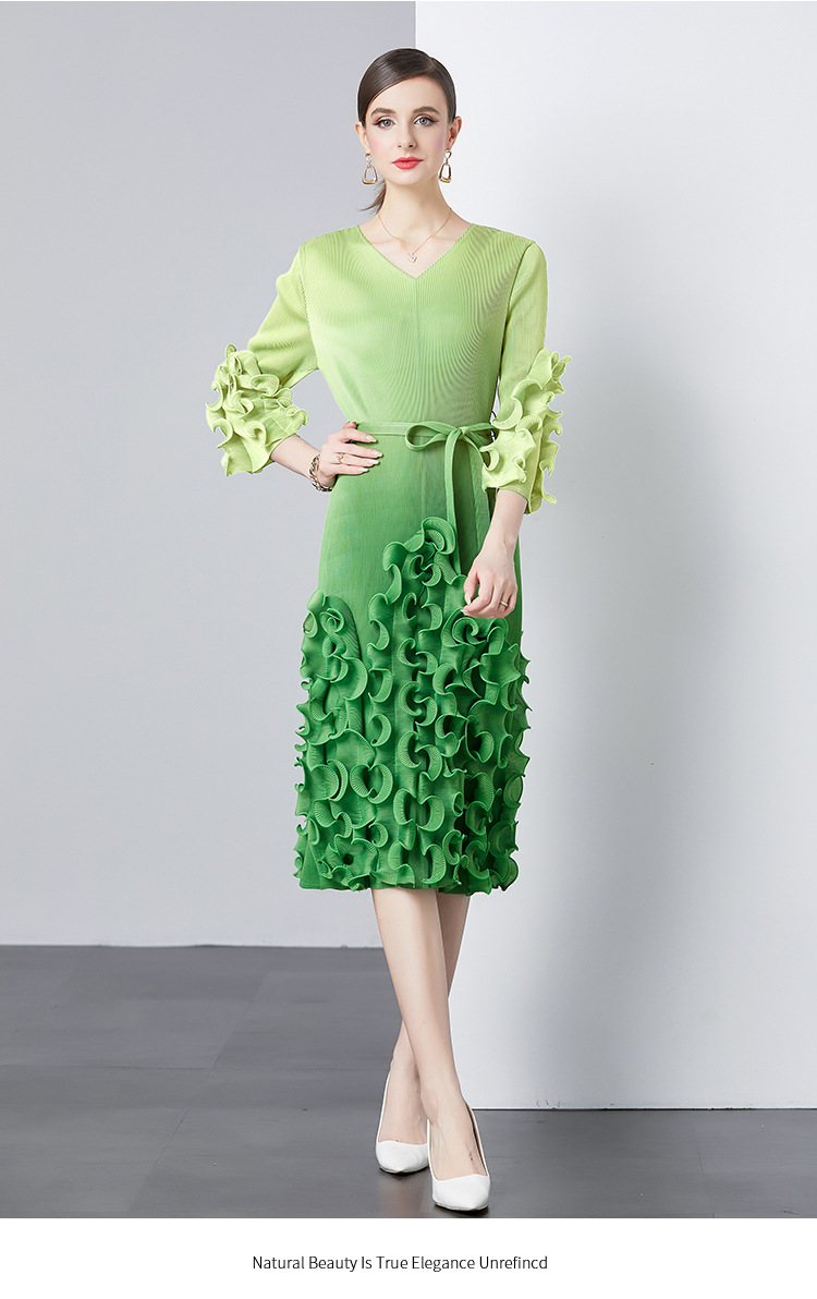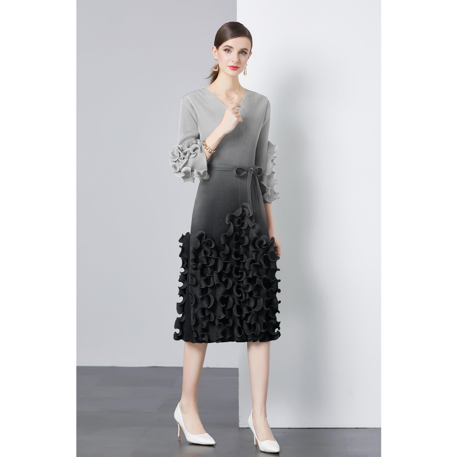 Chiếc đầm dành cho nữ, kiểu dáng dài với những nếp gấp mềm mại suốt thân. Điểm nhấn là đường viền cổ và tay áo được cách điệu như những cánh hoa nhỏ xinh, tạo nên vẻ đẹp nữ tính và thanh thoát. Chất vải nhẹ, co giãn nhẹ mang lại sự dễ chịu cho người mặc vào mùa hè. Sản phẩm phù hợp để mặc đi làm, đi chơi hoặc dự những buổi gặp mặt thông thường. Có thể giặt bằng máy và ủi ở nhiệt độ thấp để giữ form vải. | Tên sản phẩm: Váy Đầm Liền Thân Dáng Dài Nữ Big Size Ngoại Cỡ Hàng Mùa Hè - Thời Trang Nữ | Mã sản phẩm: B3974 - Giá: 1.350.000đ | Mã nhà sản xuất: GUDG-G04Hình ảnh sản phẩm