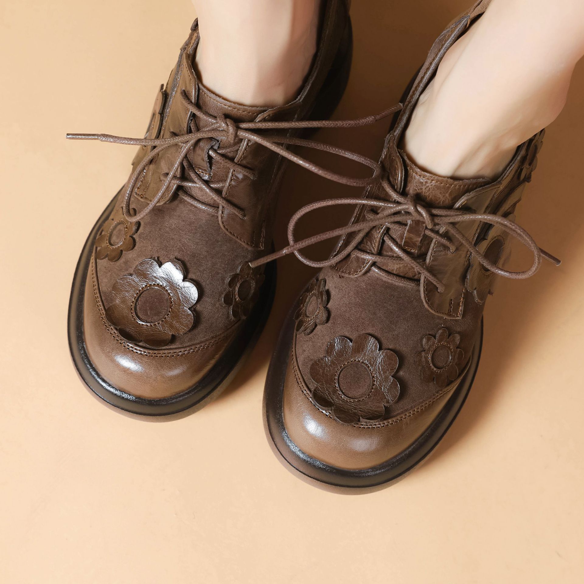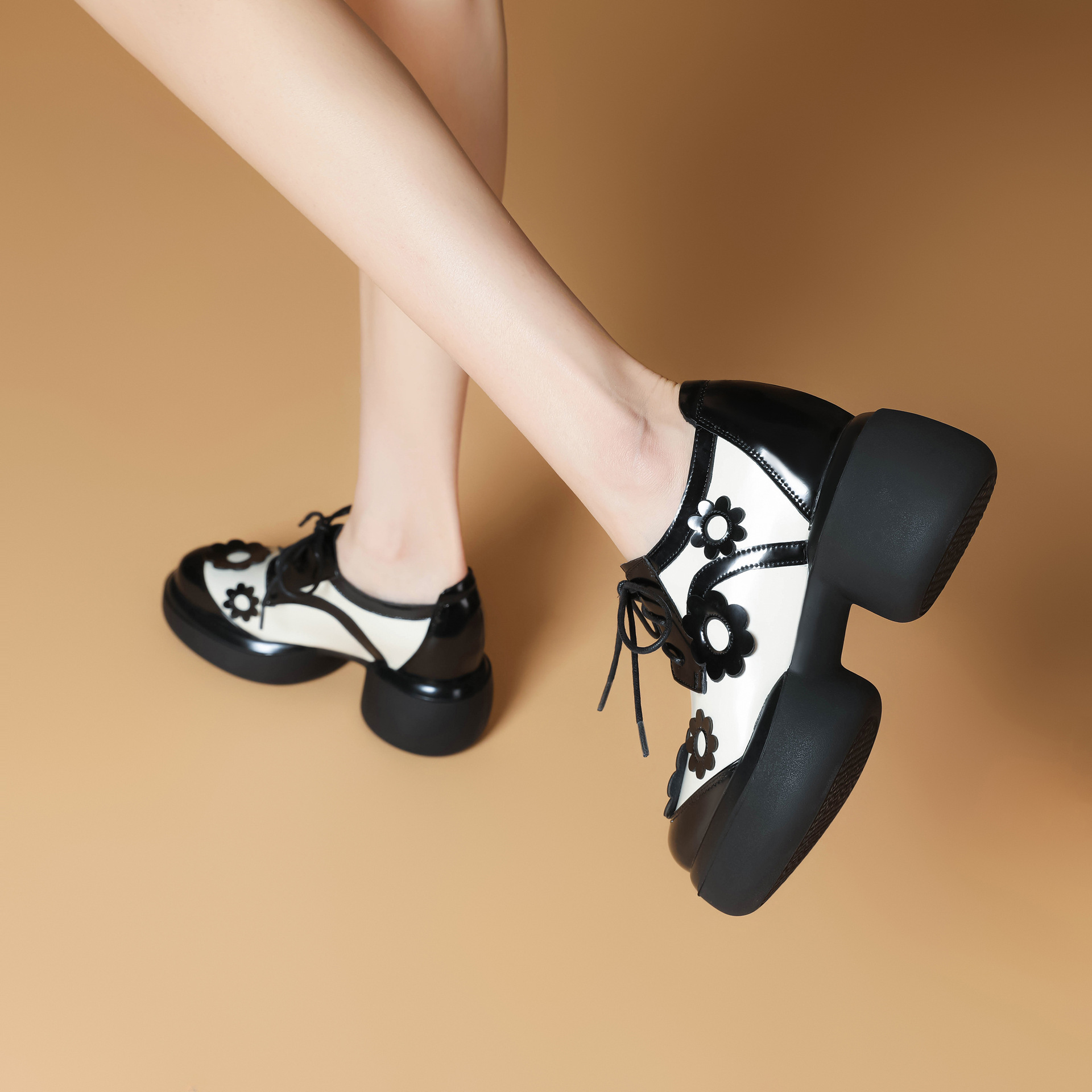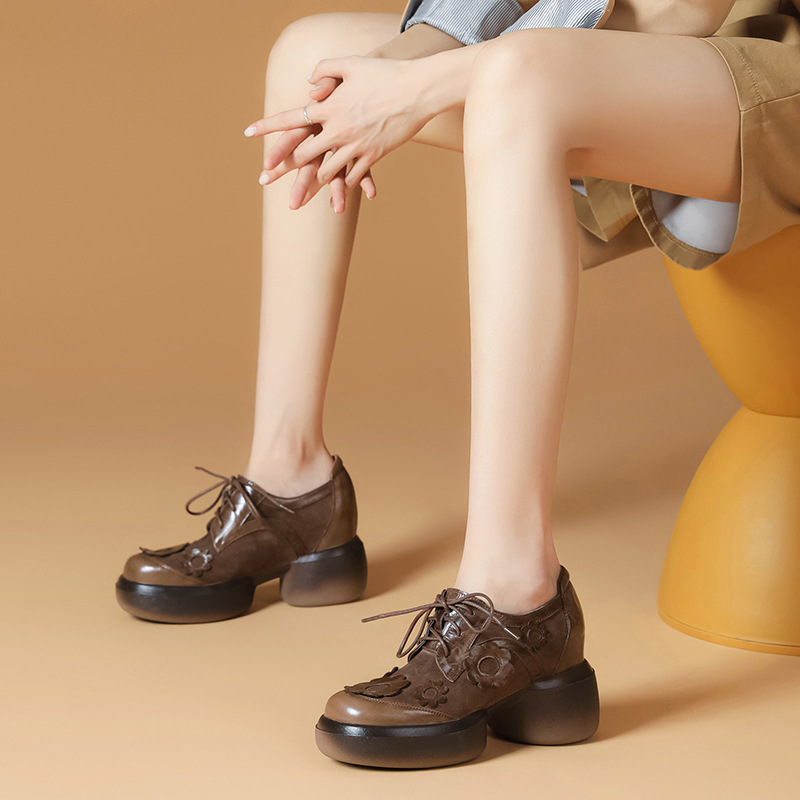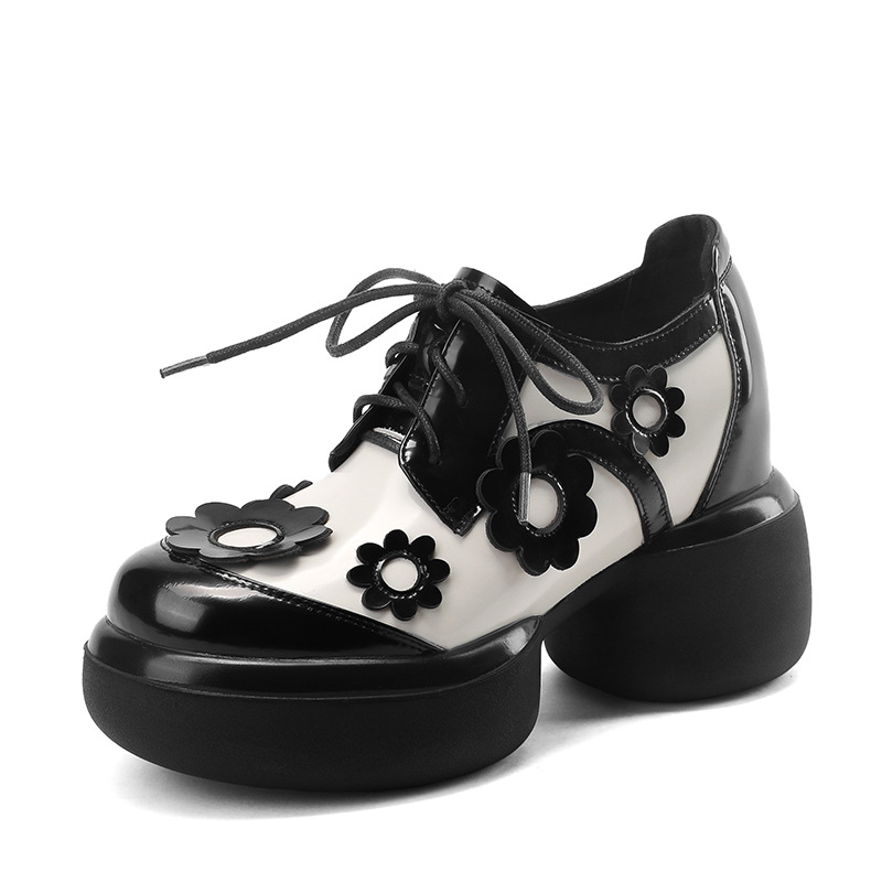 Đôi giày da này có phần đế dày giúp tăng chiều cao một cách tinh tế. Kiểu dáng đầu tròn cùng dây buộc tạo vẻ ngoài nữ tính và thoải mái. Họa tiết hoa trên đế thêm điểm nhấn sinh động, dễ dàng phối với nhiều trang phục khác nhau như quần jeans hay váy. Bạn có thể mang hàng ngày để đi làm, đi học hoặc dạo phố. Chỉ cần buộc dây vừa chân là đã có ngay một phong cách trẻ trung, năng động. | Tên sản phẩm: Giày Da Nữ Mũi Tròn Họa Tiết Hoa Đế Cao Hàng Mùa Xuân Thu Đông - Giày Dép Nữ | Mã sản phẩm: B4006 - Giá: 1.920.000đ | Mã nhà sản xuất: QIDNG-G05Hình ảnh sản phẩm
