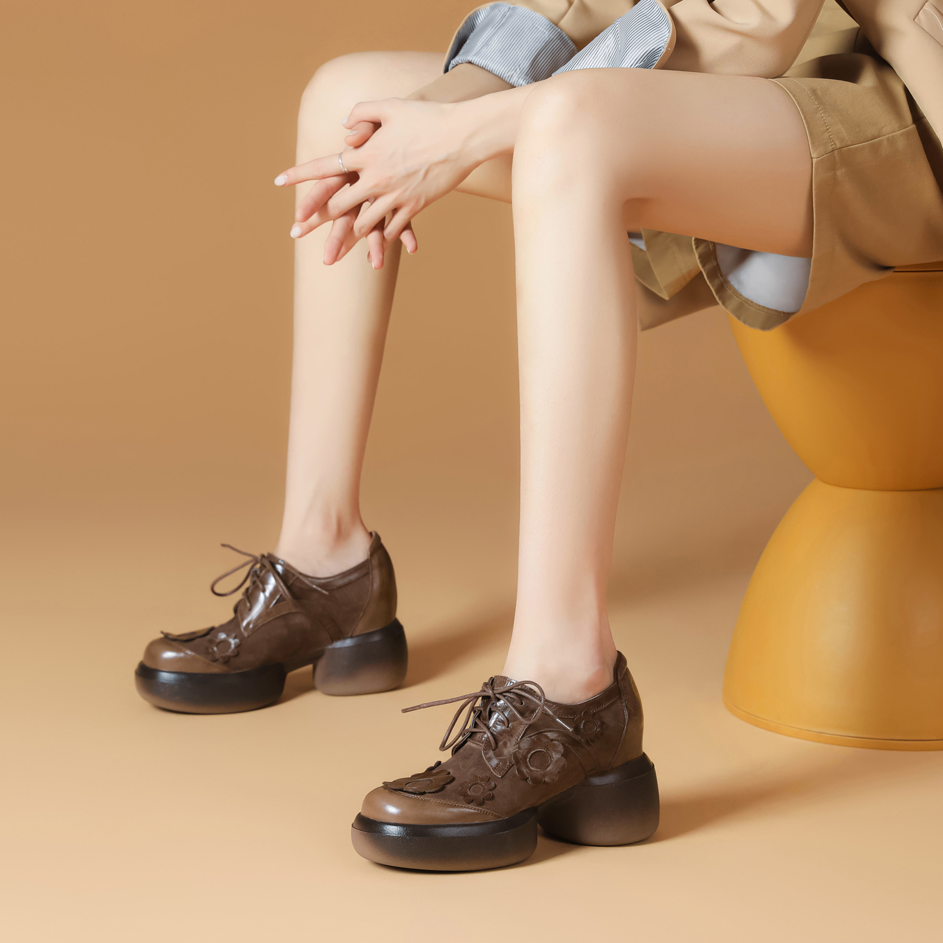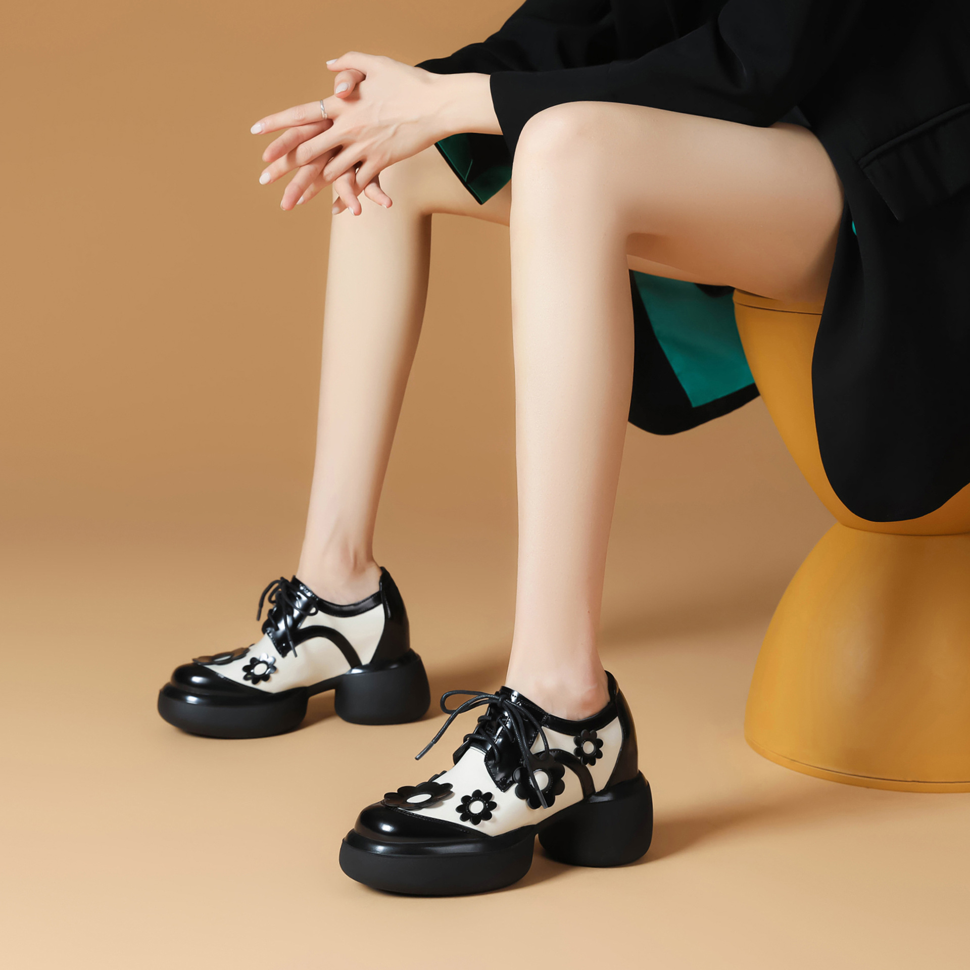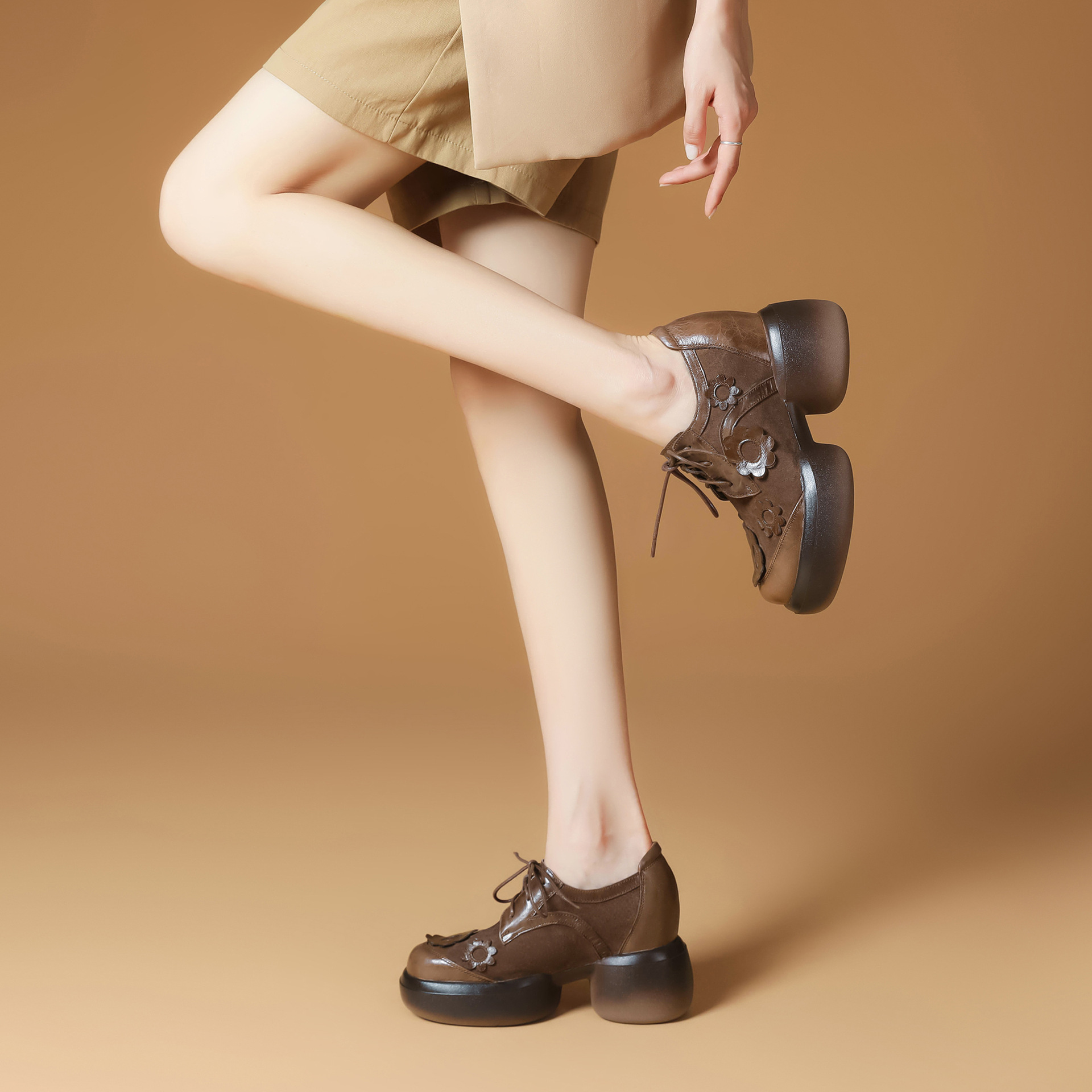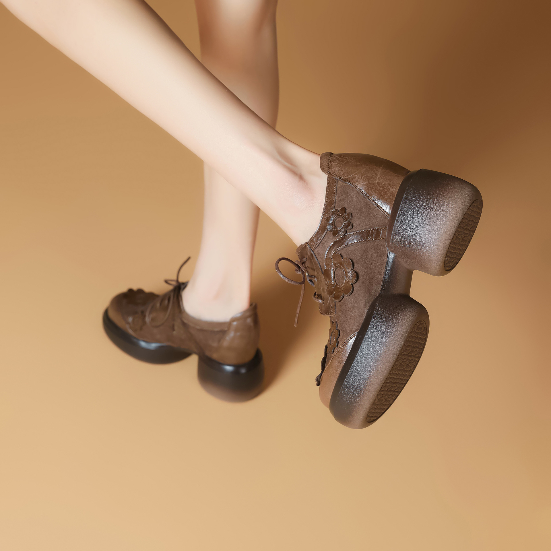 Đôi giày da này có phần đế dày giúp tăng chiều cao một cách tinh tế. Kiểu dáng đầu tròn cùng dây buộc tạo vẻ ngoài nữ tính và thoải mái. Họa tiết hoa trên đế thêm điểm nhấn sinh động, dễ dàng phối với nhiều trang phục khác nhau như quần jeans hay váy. Bạn có thể mang hàng ngày để đi làm, đi học hoặc dạo phố. Chỉ cần buộc dây vừa chân là đã có ngay một phong cách trẻ trung, năng động. | Tên sản phẩm: Giày Da Nữ Mũi Tròn Họa Tiết Hoa Đế Cao Hàng Mùa Xuân Thu Đông - Giày Dép Nữ | Mã sản phẩm: B4006 - Giá: 1.920.000đ | Mã nhà sản xuất: QIDNG-G05Hình ảnh sản phẩm