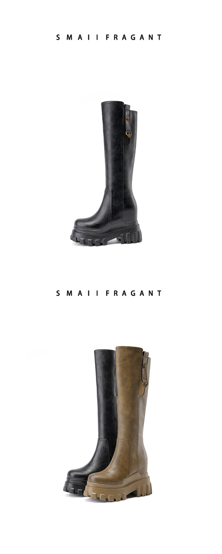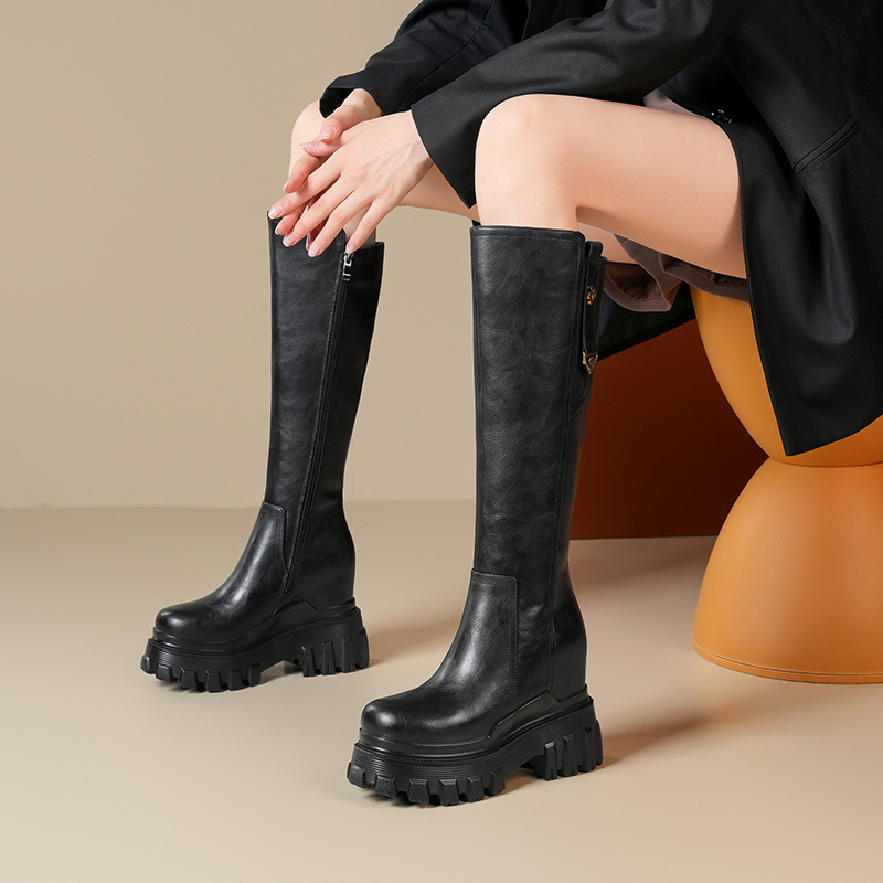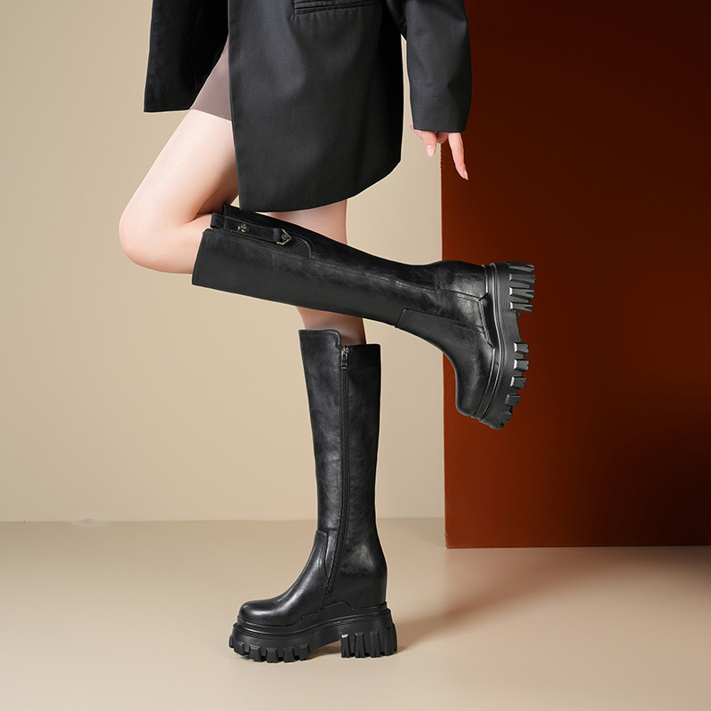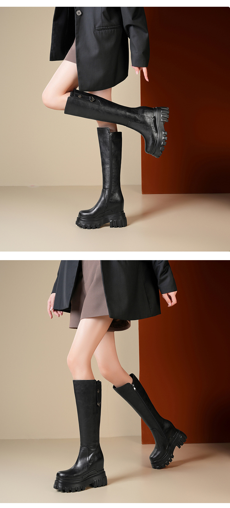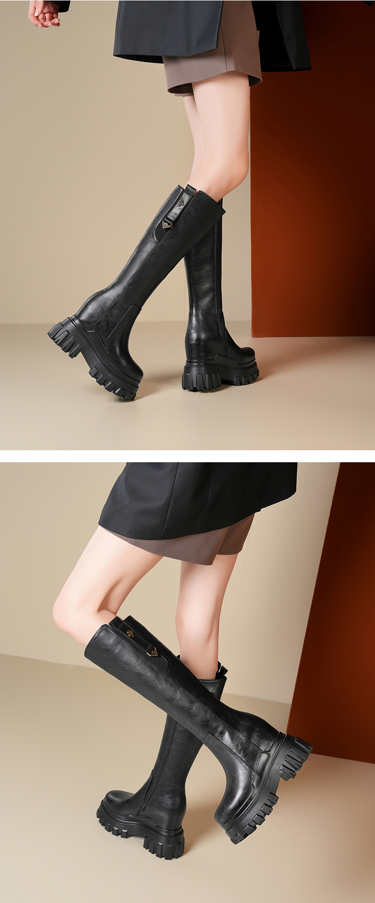 Đôi bốt này có phần đế dày bên trong giúp tăng chiều cao lên đến mười hai phân một cách tự nhiên. Kiểu dáng bốt dài không quá đầu gối, phù hợp cho thời tiết mát mẻ. Phần đế ngoài được thiết kế kiểu đế xuồng vững chãi, tạo dáng đứng đắn. Bạn có thể dễ dàng phối cùng quần legging, quần jeans hay váy để tạo điểm nhấn cho trang phục hằng ngày. | Tên sản phẩm: Boot Cổ Cao Nữ Cao 12cm Cổ Cao Qua Gối Tăng Chiều Cao Đế Cao Hàng Mùa Xuân Thu Đông - Giày Dép Nữ | Mã sản phẩm: B4313 - Giá: 2.690.000đ | Mã nhà sản xuất: QIDNG-G06Hình ảnh sản phẩm