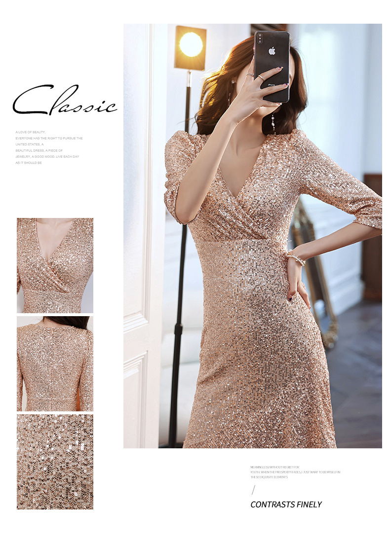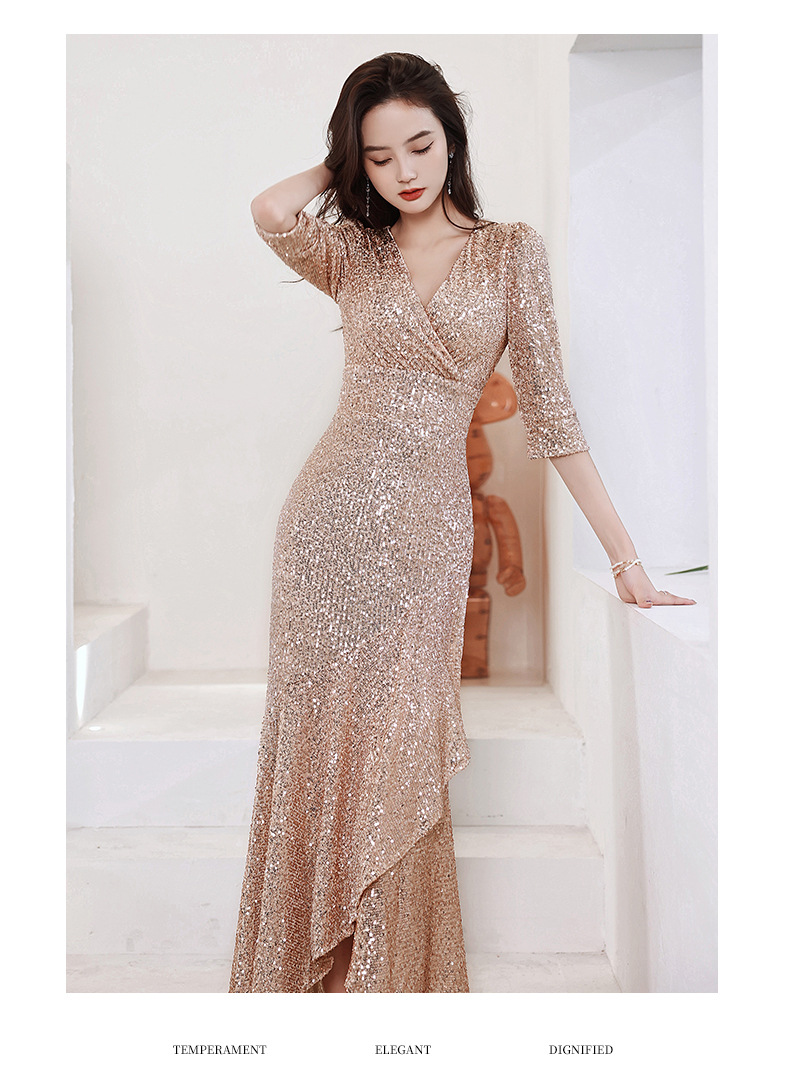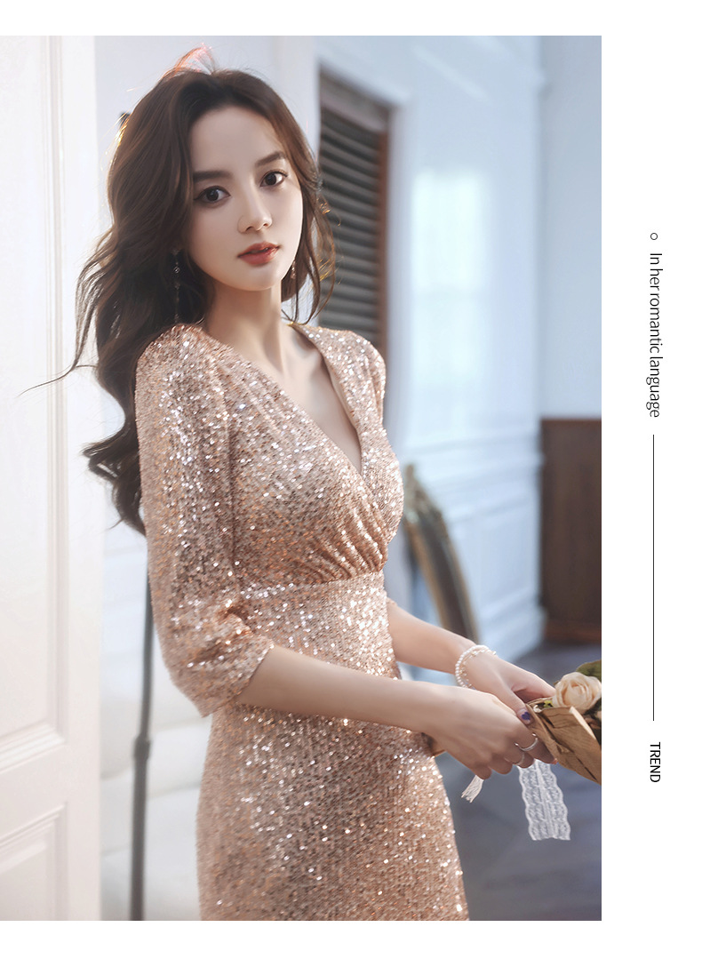Đầm dự tiệc sinh nhật với thiết kế đuôi cá thanh lịch, tôn dáng người mặc. Trang phục có tay dài, toàn thân được đính vô số hạt ánh sanh lấp lánh tinh tế, phù hợp cho các bữa tiệc hoặc v trò dẫn chương trình. Chất vải co giãn nhẹ nhàng, tạo cảm giác thoải mái khi di chuyển và hoạt động cả buổi. Mặc cùng phụ kiện nhẹ và giày cao gót để hoàn thiện bộ trang phục. | Tên sản phẩm: Váy Đầm Liền Thân Dự Tiệc Nữ Kiểu Đuôi Cá - Thời Trang Nữ | Mã sản phẩm: B4434 - Giá: 1.230.000đ | Mã nhà sản xuất: SUCTTO-G04Hình ảnh sản phẩm