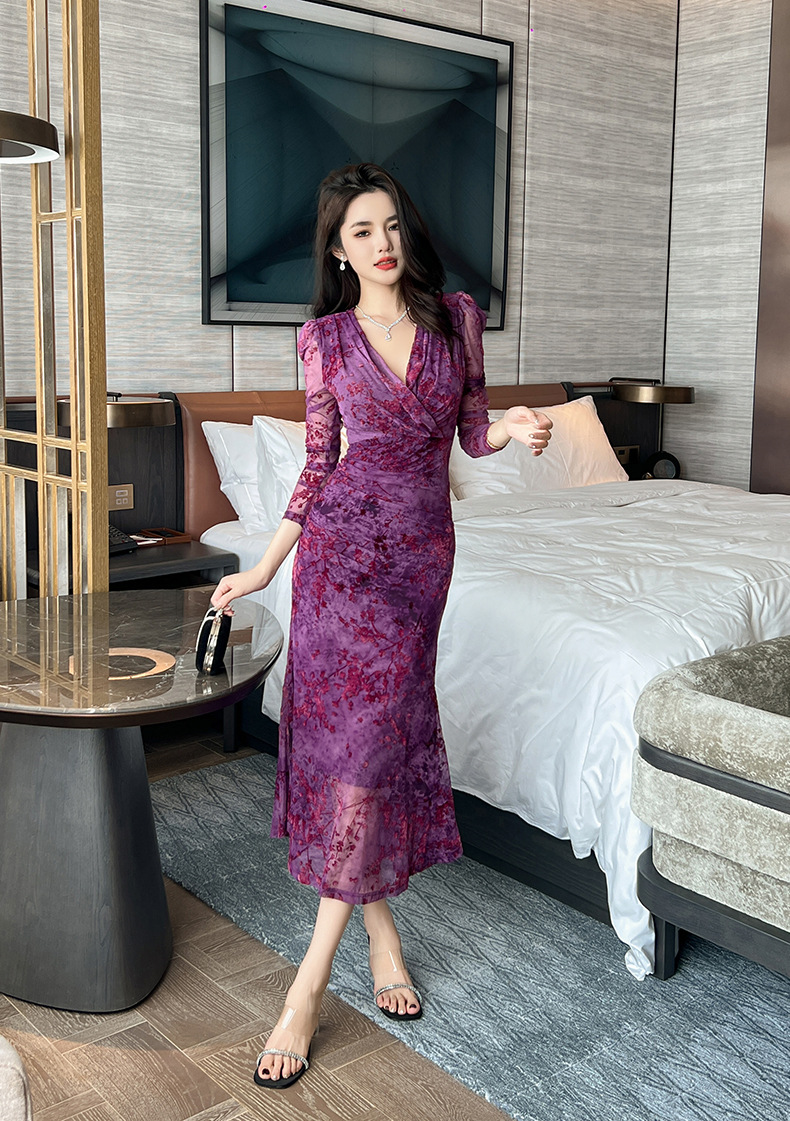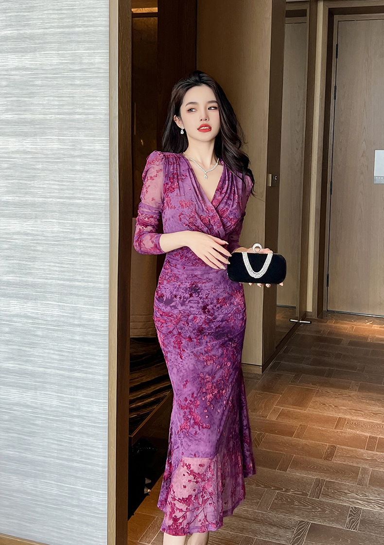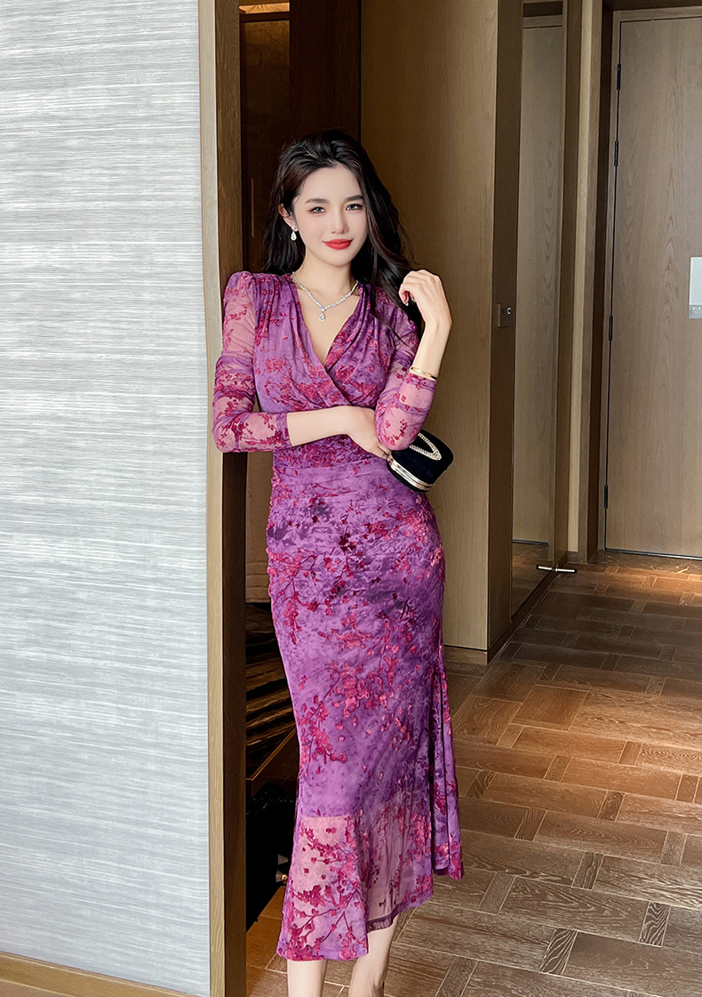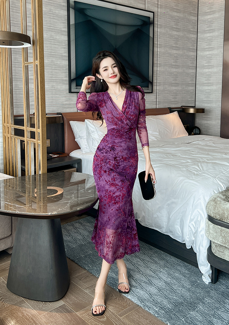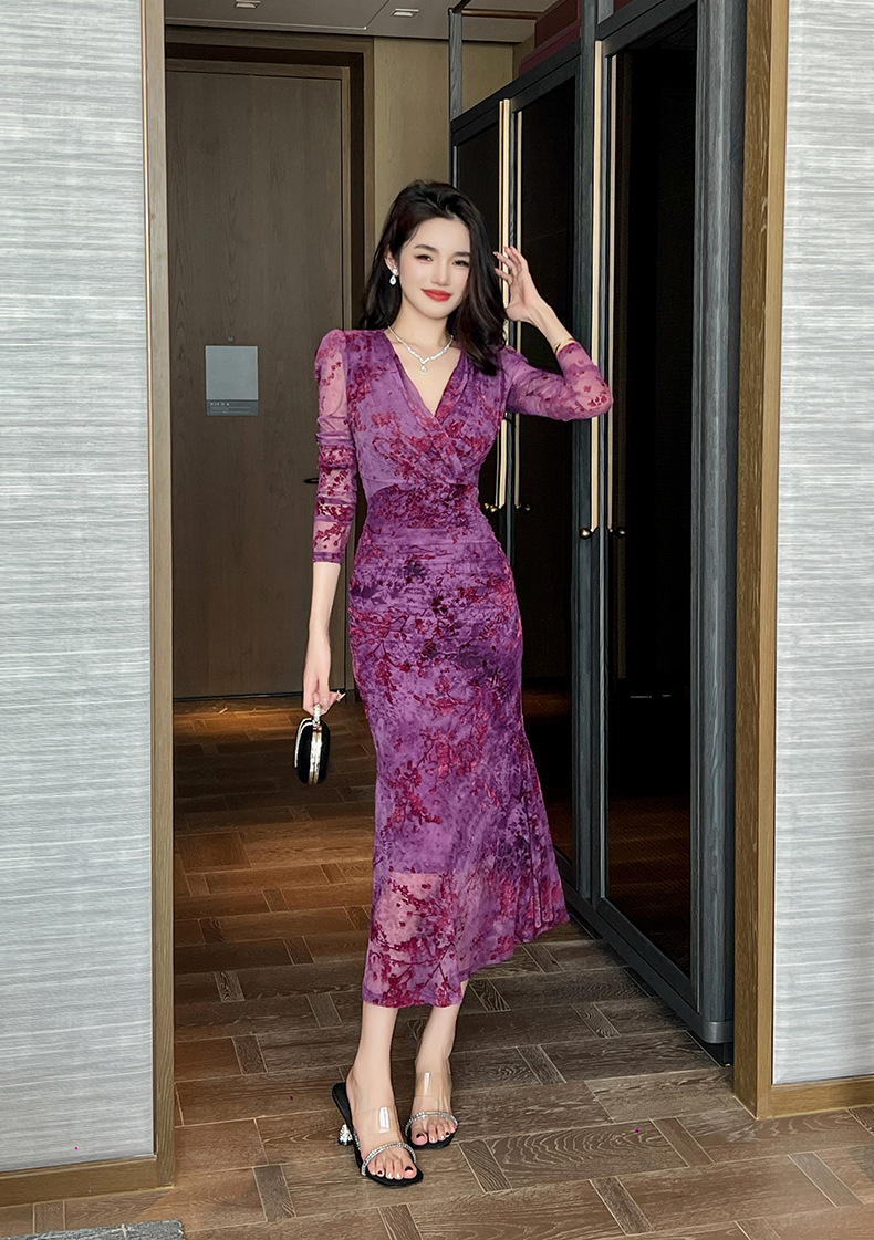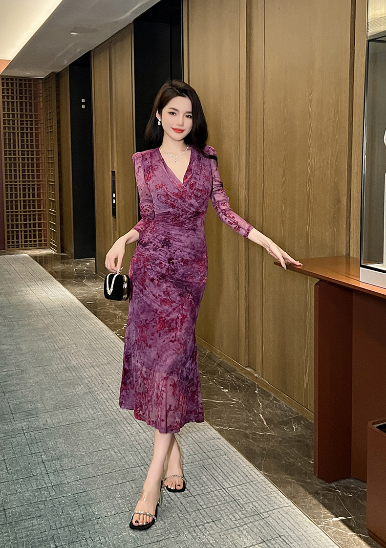 Chiếc váy dài với phần cổ khoét hình chữ V tạo nên điểm nhấn thanh lịch. Chất vải mỏng nhẹ có họa tiết in nổi kết hợp lớp voan mềm mại, ôm nhẹ vào cơ thể. Thiết kế xòe nhẹ ở phần thân dưới tựa như đuôi cá, mang đến vẻ dịu dàng và nữ tính. Sản phẩm phù hợp cho những buổi gặp mặt hoặc dạo phố. Có thể giặt bằng tay và phơi ở nơi râm mát để giữ form váy và độ bền màu. | Tên sản phẩm: Váy Đầm Liền Thân Dáng Dài Nữ Lưới Mỏng Họa Tiết Hoa Cổ Chữ V Hàng Mùa Xuân Thu Đông - Thời Trang Nữ | Mã sản phẩm: B4683 - Giá: 1.090.000đ | Mã nhà sản xuất: CHDG-G03Hình ảnh sản phẩm