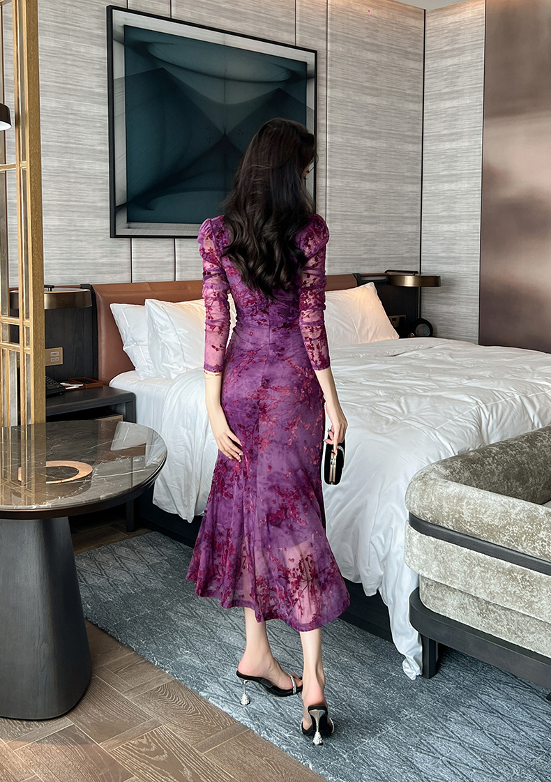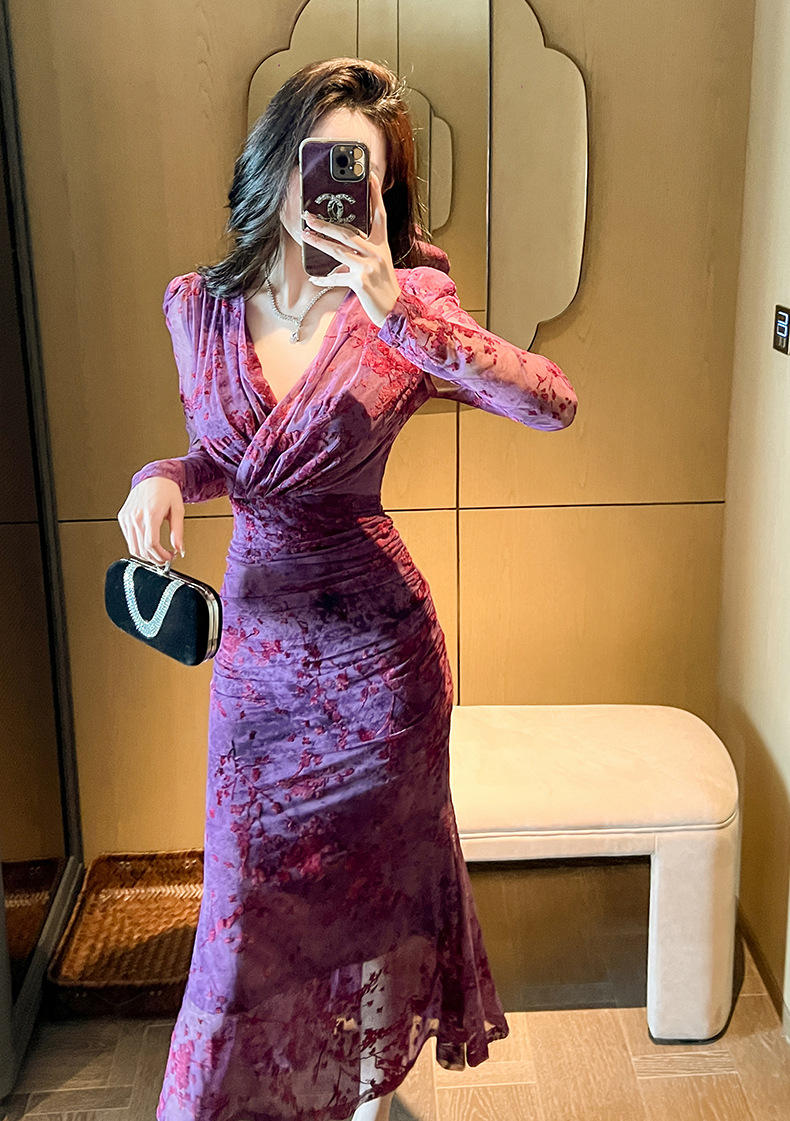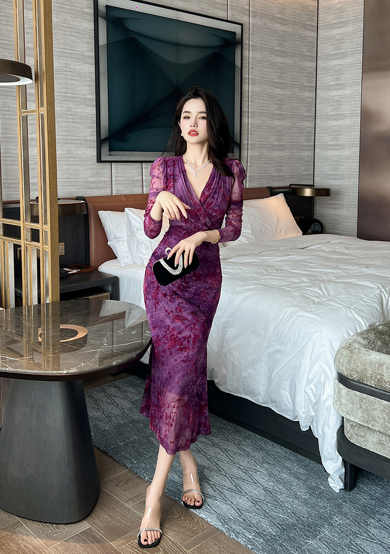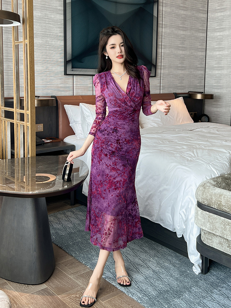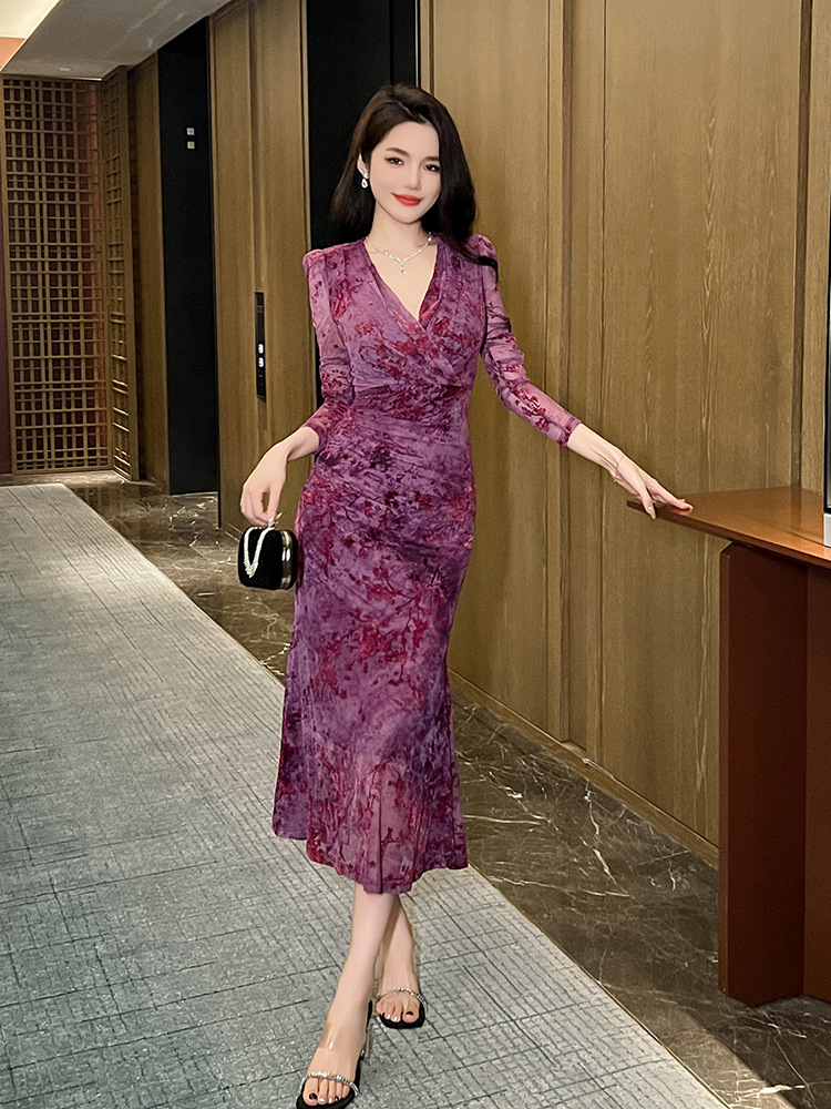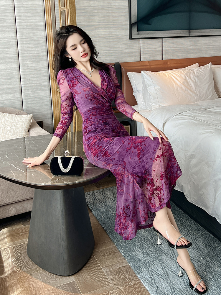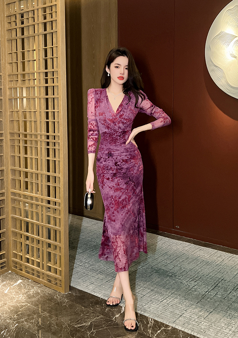 Chiếc váy dài với phần cổ khoét hình chữ V tạo nên điểm nhấn thanh lịch. Chất vải mỏng nhẹ có họa tiết in nổi kết hợp lớp voan mềm mại, ôm nhẹ vào cơ thể. Thiết kế xòe nhẹ ở phần thân dưới tựa như đuôi cá, mang đến vẻ dịu dàng và nữ tính. Sản phẩm phù hợp cho những buổi gặp mặt hoặc dạo phố. Có thể giặt bằng tay và phơi ở nơi râm mát để giữ form váy và độ bền màu. | Tên sản phẩm: Váy Đầm Liền Thân Dáng Dài Nữ Lưới Mỏng Họa Tiết Hoa Cổ Chữ V Hàng Mùa Xuân Thu Đông - Thời Trang Nữ | Mã sản phẩm: B4683 - Giá: 1.090.000đ | Mã nhà sản xuất: CHDG-G03Hình ảnh sản phẩm