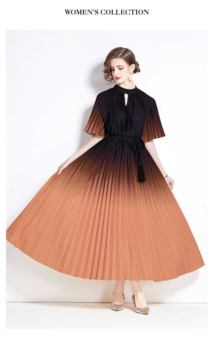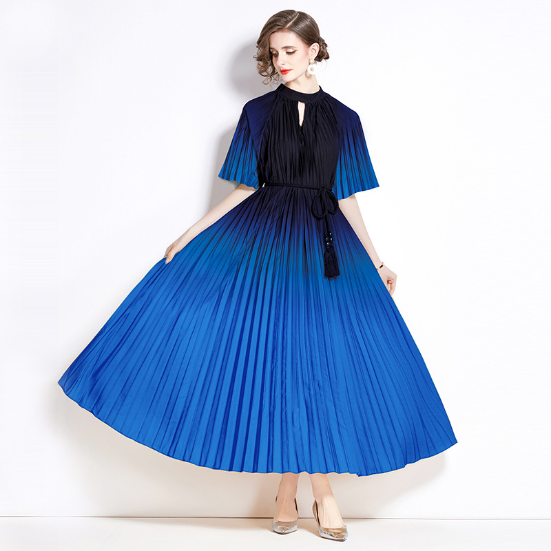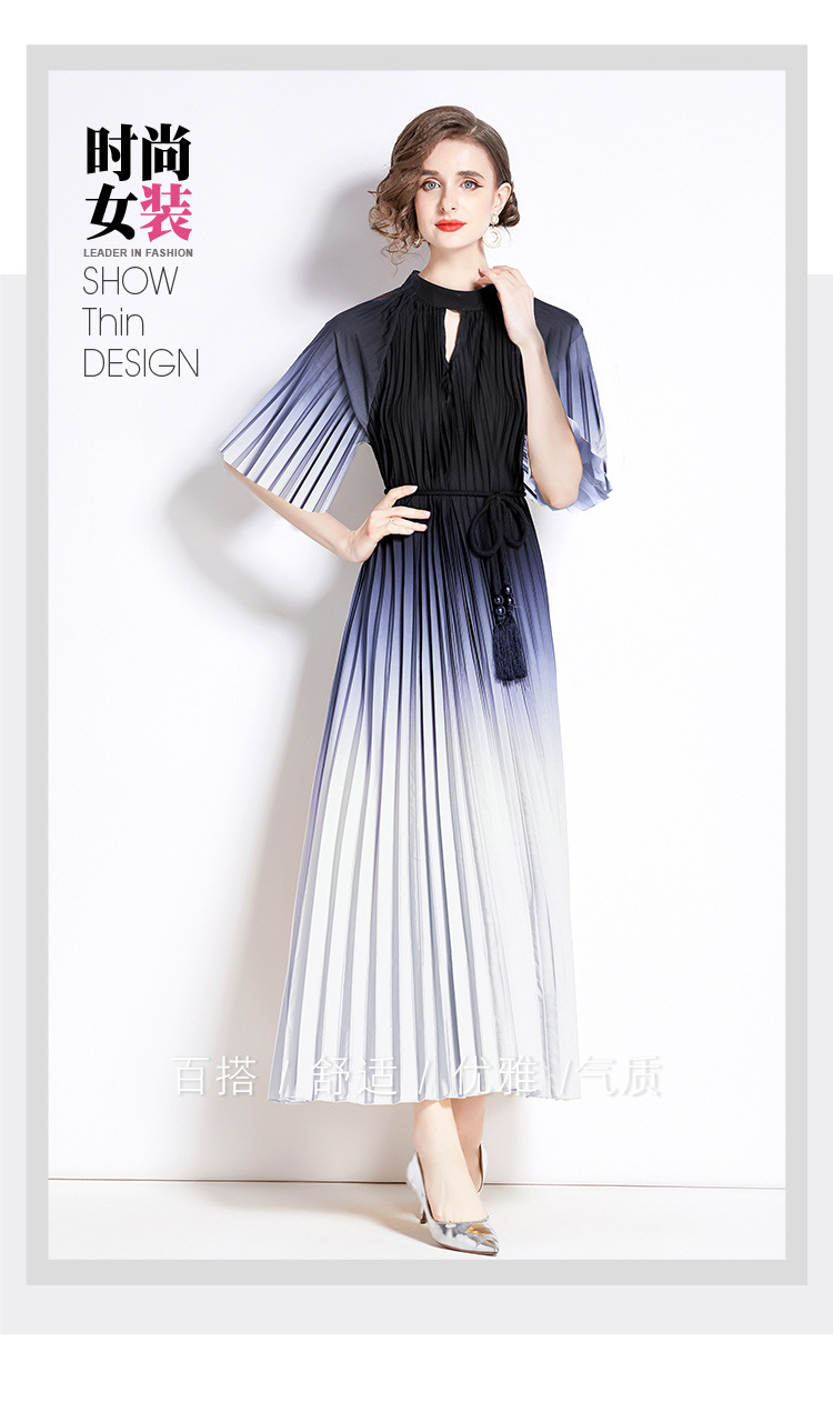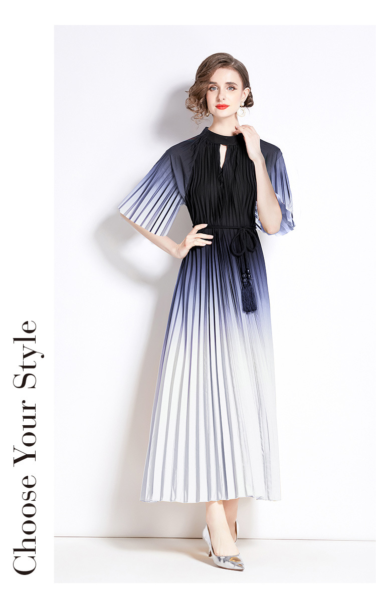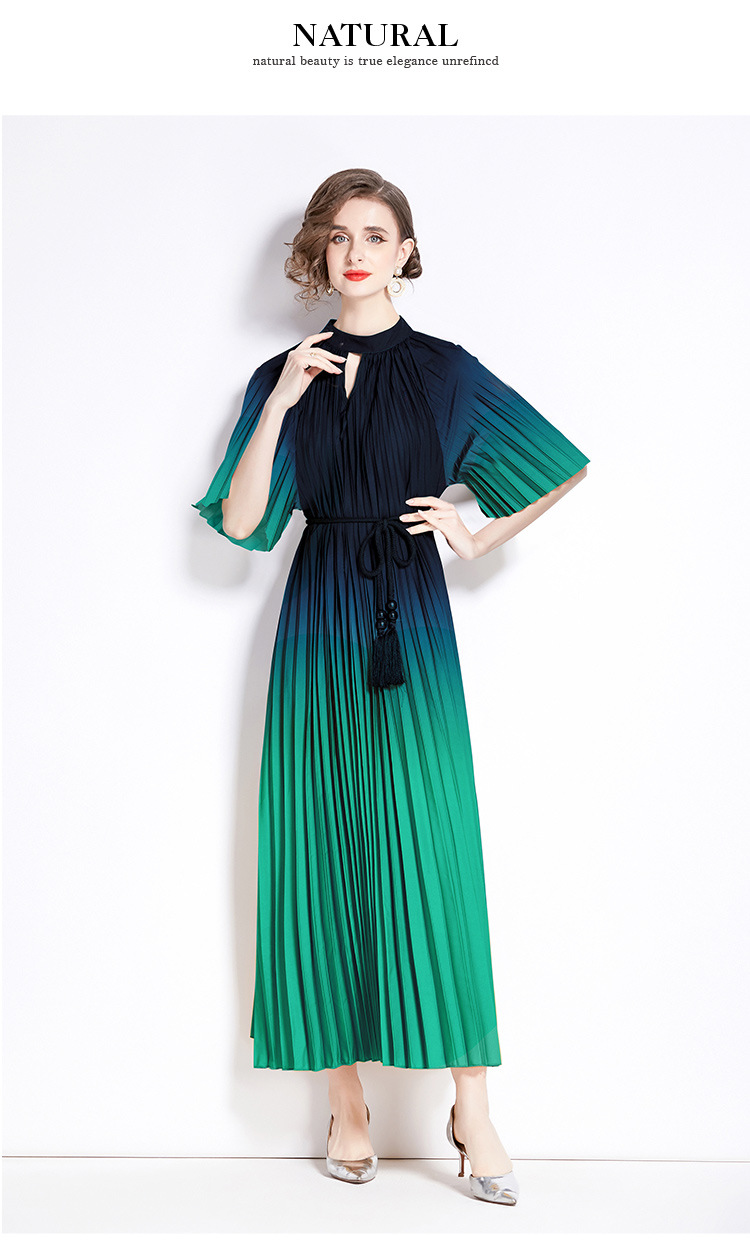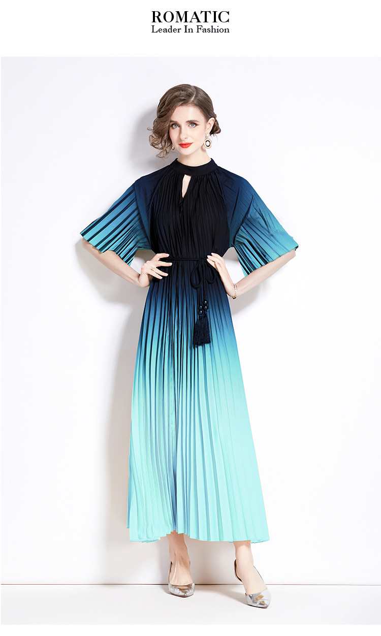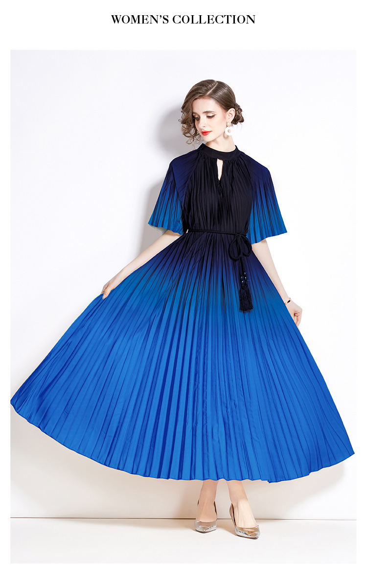 Áo dài tay ngắn mới cho mùa hè, cổ dựng và eo ôm tôn dáng. Thiết kế dáng chữ A với phần vải xếp ly mềm mại từ trên xuống, kết hợp hiệu ứng chuyển màu nhẹ nhàng từ nhạt đến đậm. Chất vải nhẹ, thoáng mát, phù hợp dự tiệc hoặc các buổi gặp mặt. Mặc kèm giày cao gót và phụ kiện đơn giản để hoàn thiện bộ trang phục. | Tên sản phẩm: Váy Đầm Liền Thân Dáng Dài Nữ Ngắn Tay Hàng Mùa Hè - Thời Trang Nữ | Mã sản phẩm: B4720 - Giá: 880.000đ | Mã nhà sản xuất: GUDG-G03Hình ảnh sản phẩm