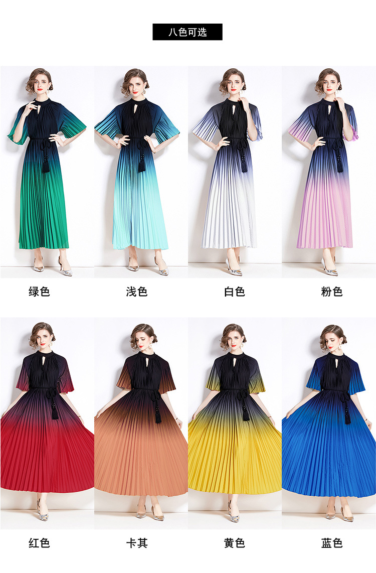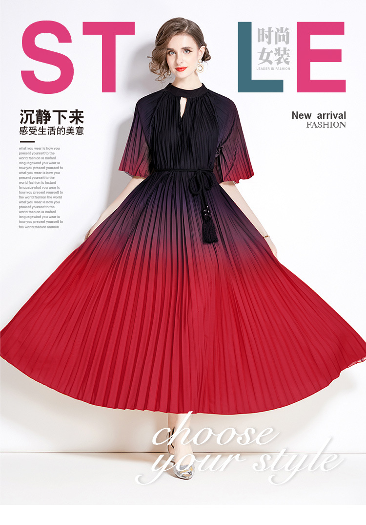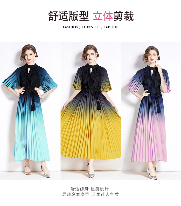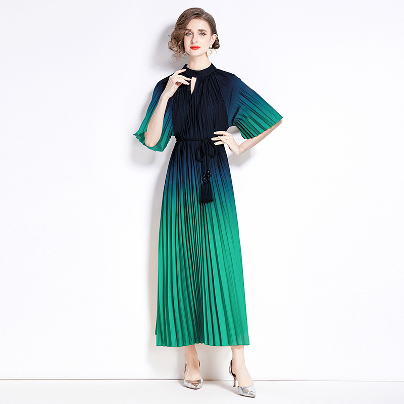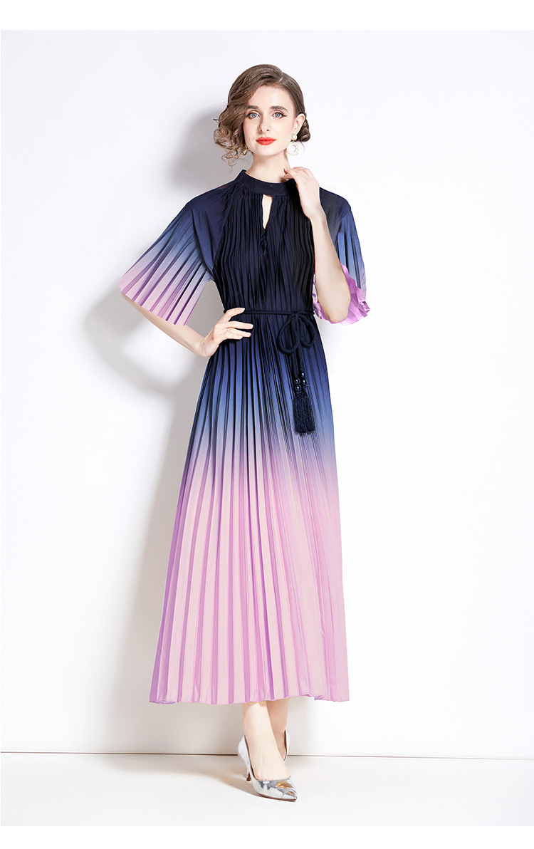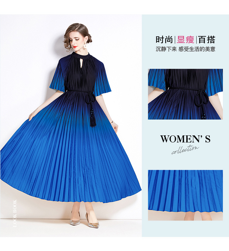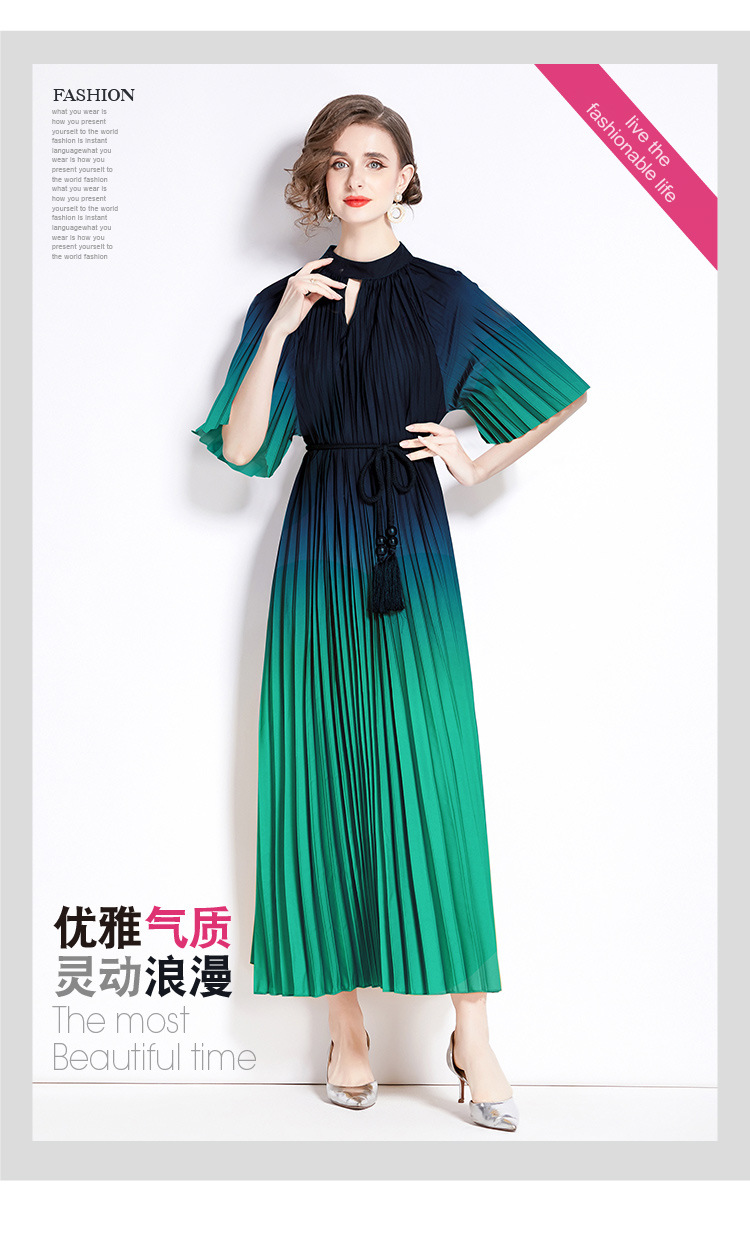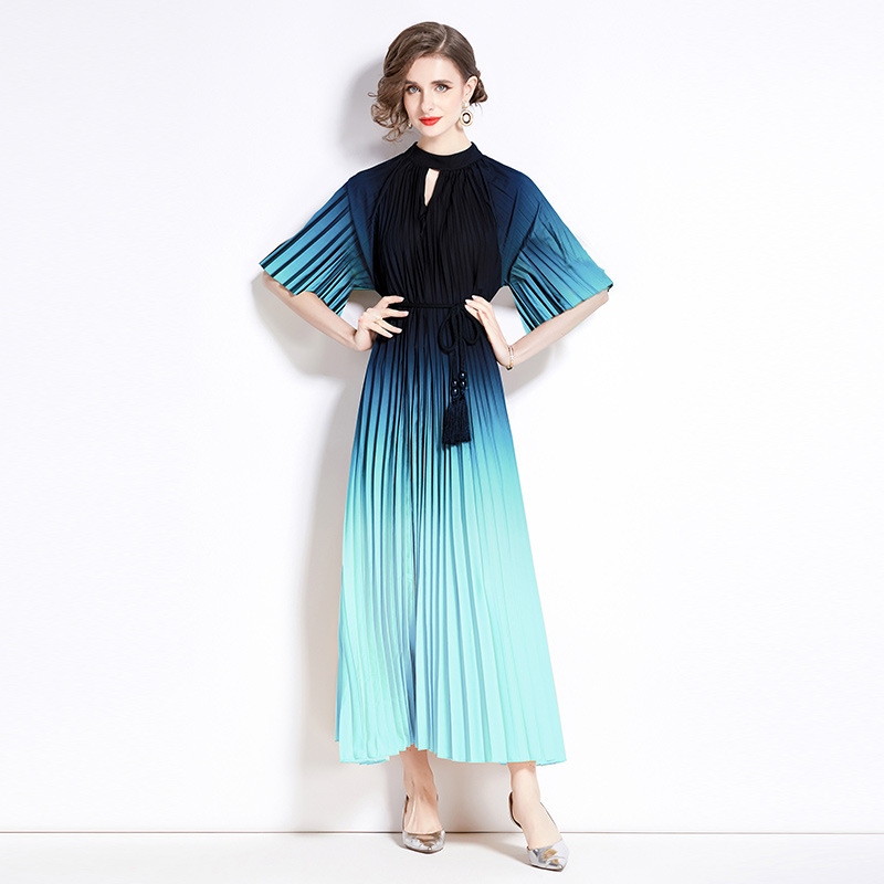 Áo dài tay ngắn mới cho mùa hè, cổ dựng và eo ôm tôn dáng. Thiết kế dáng chữ A với phần vải xếp ly mềm mại từ trên xuống, kết hợp hiệu ứng chuyển màu nhẹ nhàng từ nhạt đến đậm. Chất vải nhẹ, thoáng mát, phù hợp dự tiệc hoặc các buổi gặp mặt. Mặc kèm giày cao gót và phụ kiện đơn giản để hoàn thiện bộ trang phục. | Tên sản phẩm: Váy Đầm Liền Thân Dáng Dài Nữ Ngắn Tay Hàng Mùa Hè - Thời Trang Nữ | Mã sản phẩm: B4720 - Giá: 880.000đ | Mã nhà sản xuất: GUDG-G03Hình ảnh sản phẩm